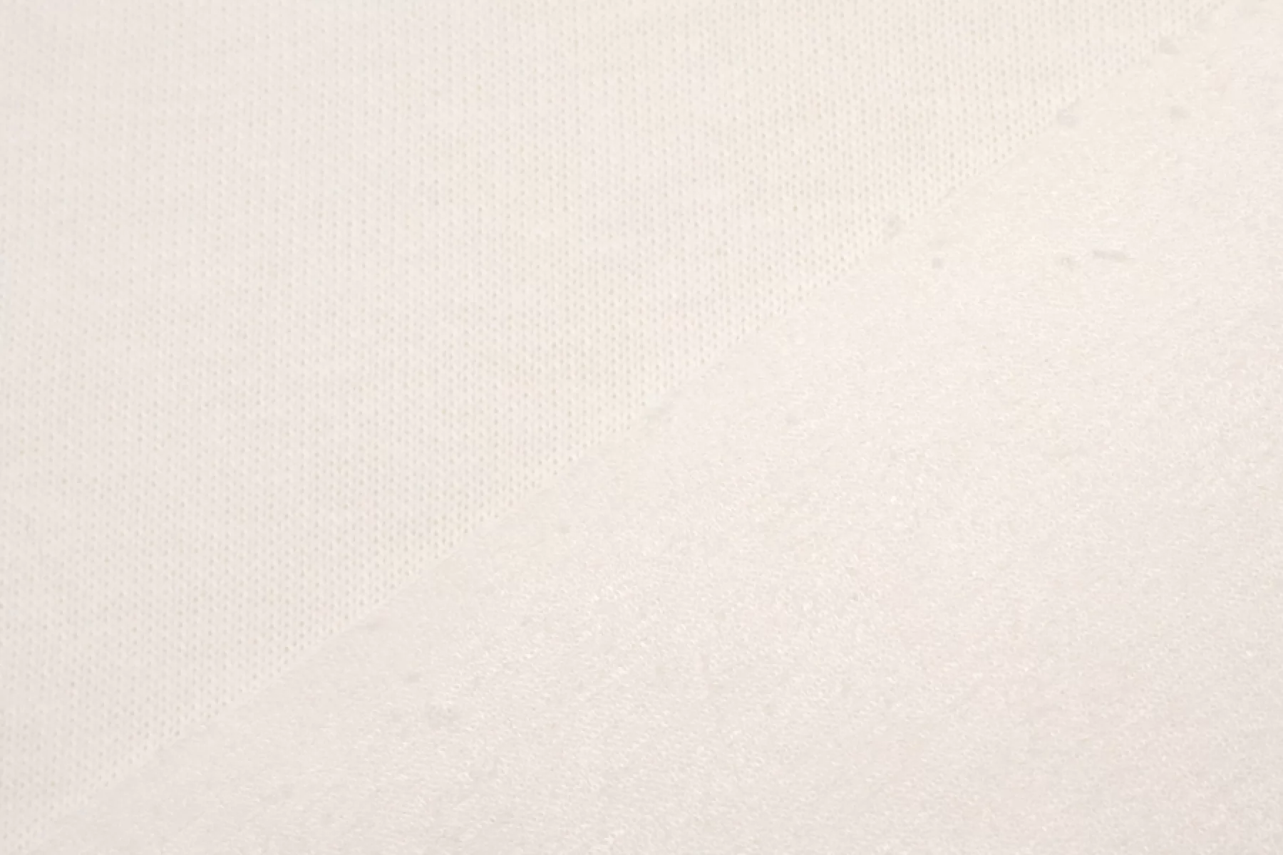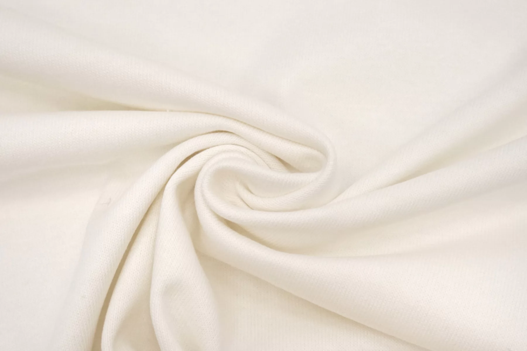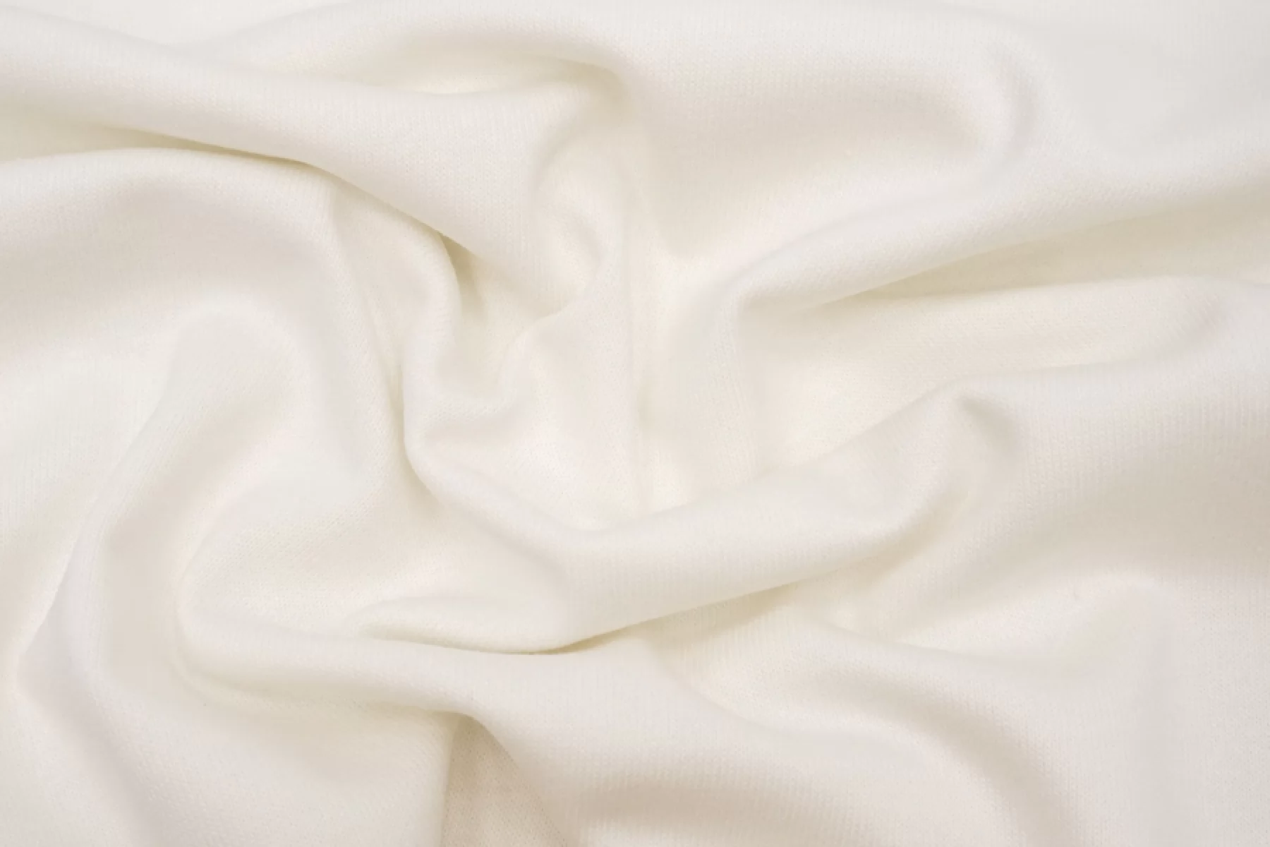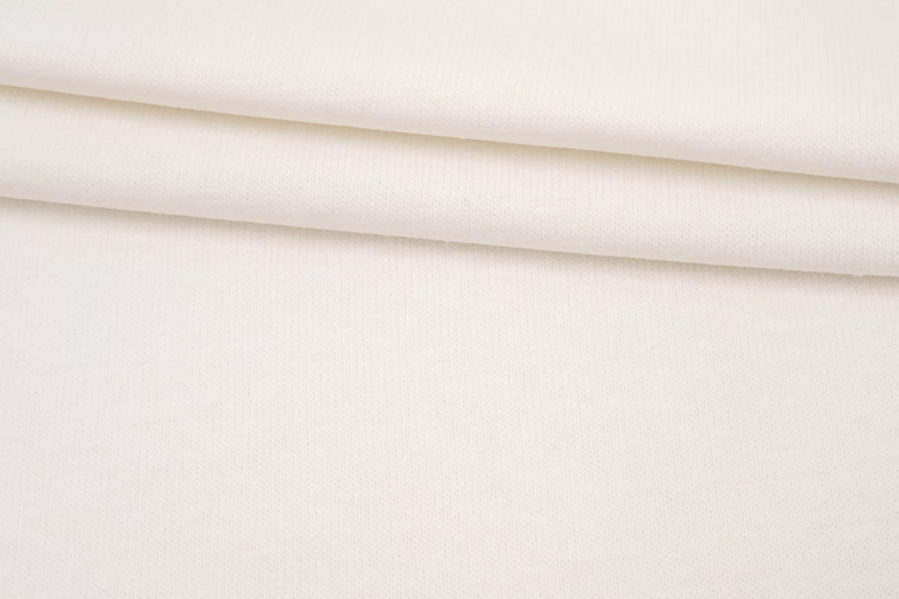 ВНИМАНИЕ!! ПРимерно каждые 30см. встречаются маленькие вплетения ниток, которые достаются иголочкой, без повредения полотна. см. фото. Интересный трикотаж в белом цвете с очень легким молочным подтоном. Лицевая сторона из хлопка, изнанка из вискозы, петельчатая как махровое полотенце. Только эти петли из тонких, гладких вискозных нитей. Получается очень комфортная, мягкая шелковистая изнанка. Плотный, средний по толщине. Тактильно приятный, мягкий. Тянется средне, не просвечивает, держит форму. Будет кофмортен в носке благодаря натуральному составу. Идеален на холодный сезон. Шьем свитера, теплые платья и юбки.