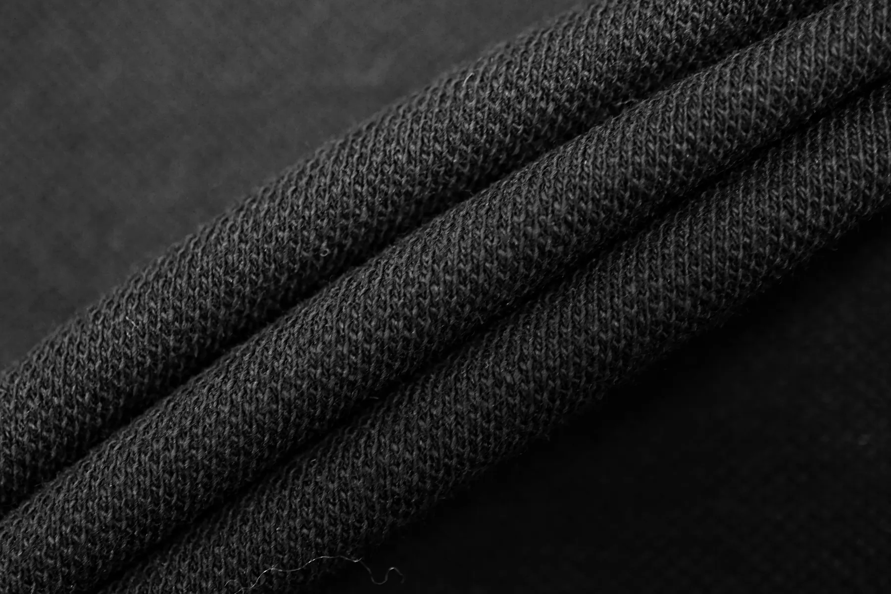 Хлопковый трикотаж - пике, чёрного цвета. Тянется, минимально просвечивает в один слой. Тактильно приятный, чувствуется фактура. Пластичный но при этом немного держит форму. Можно использовать для пошива поло, футболок, комфортных брюк спортивного кроя и кофт.
