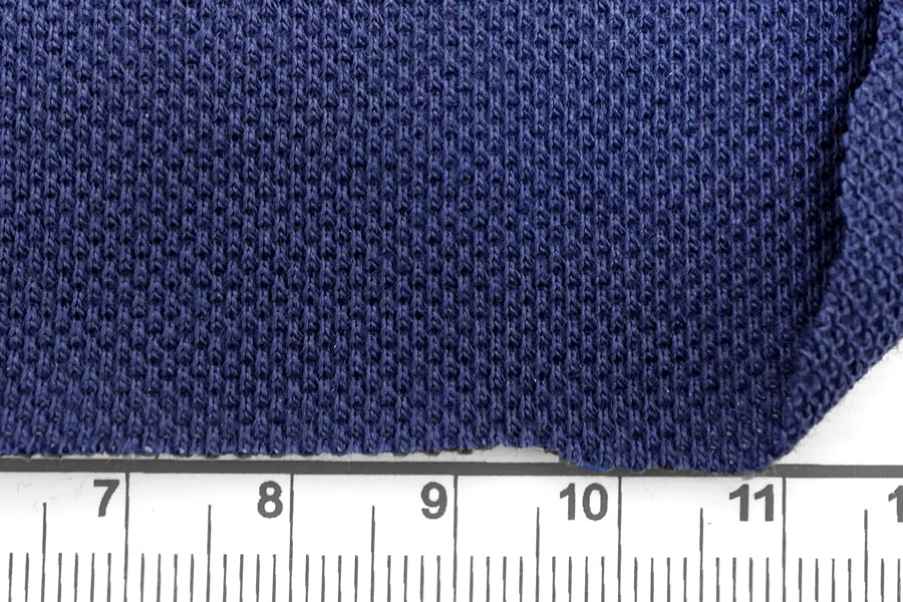 Хлопковый трикотаж пике приглушённого синего цвета. Материал суховатый, ощущается фактура плетения, не очень плотный. Немного просвечивает. Тянется благодаря плетению. Материал пластичный, хорошо драпируется и немного держит форму. Мнется умеренно. Идеальный вариант для пошива футболок-поло. Отличная ширина.