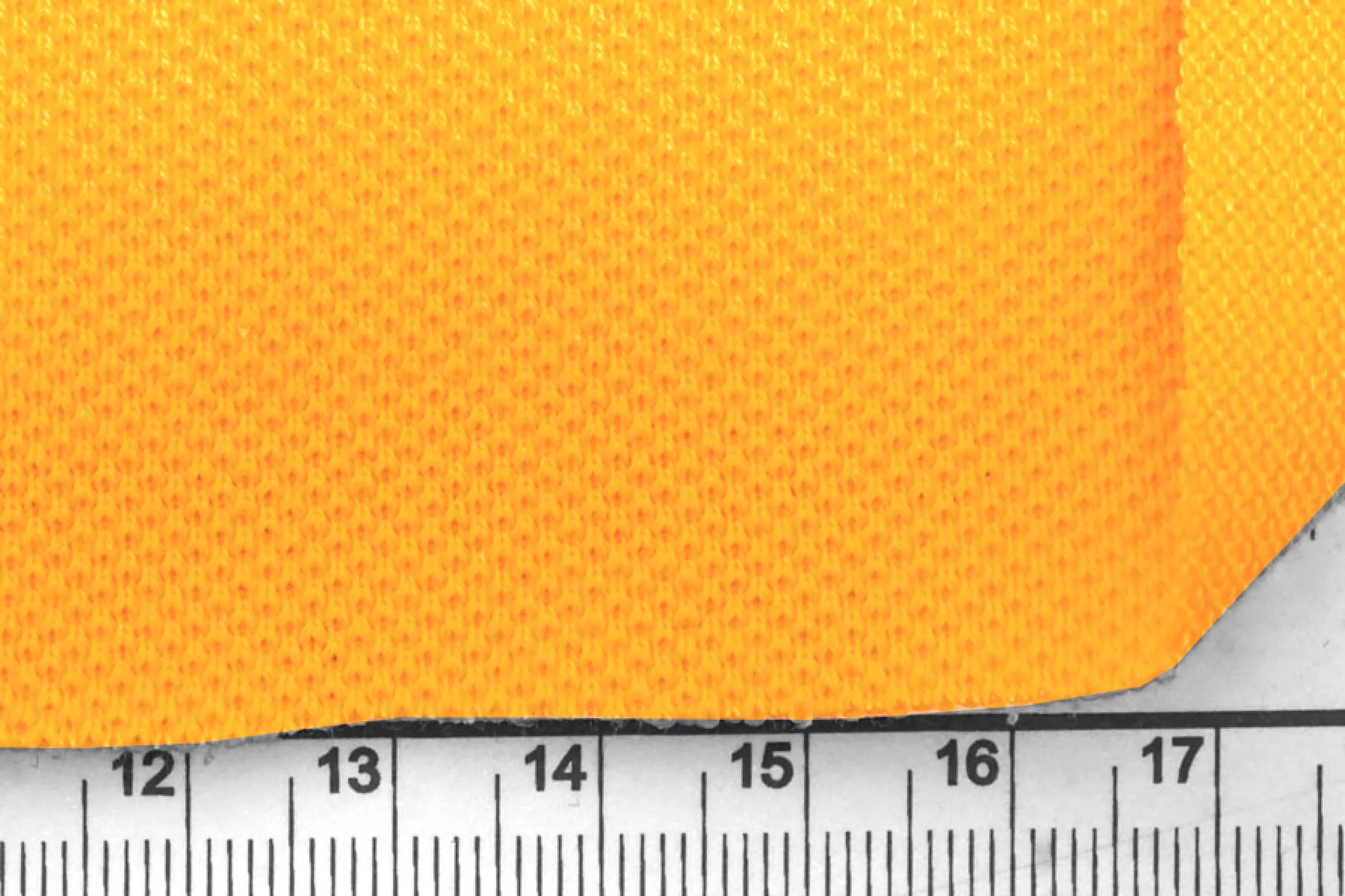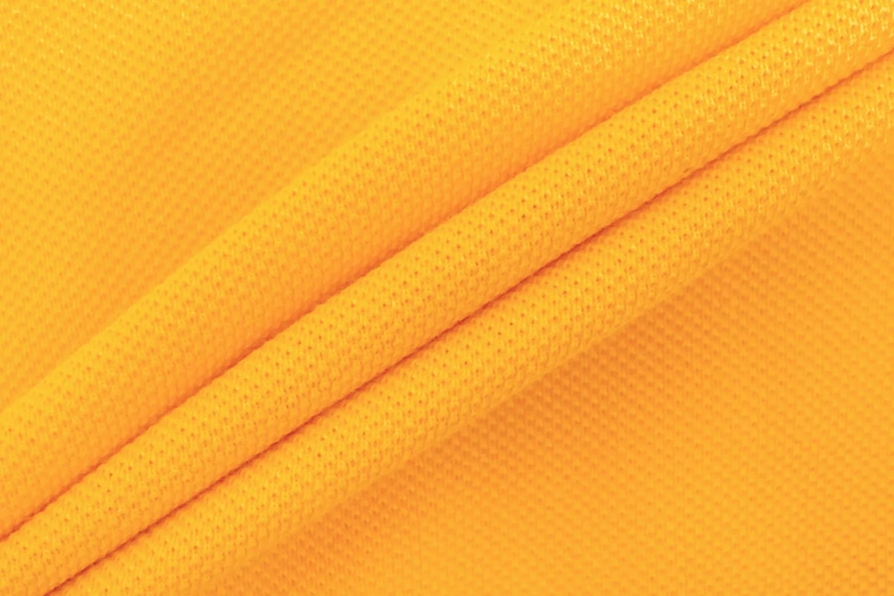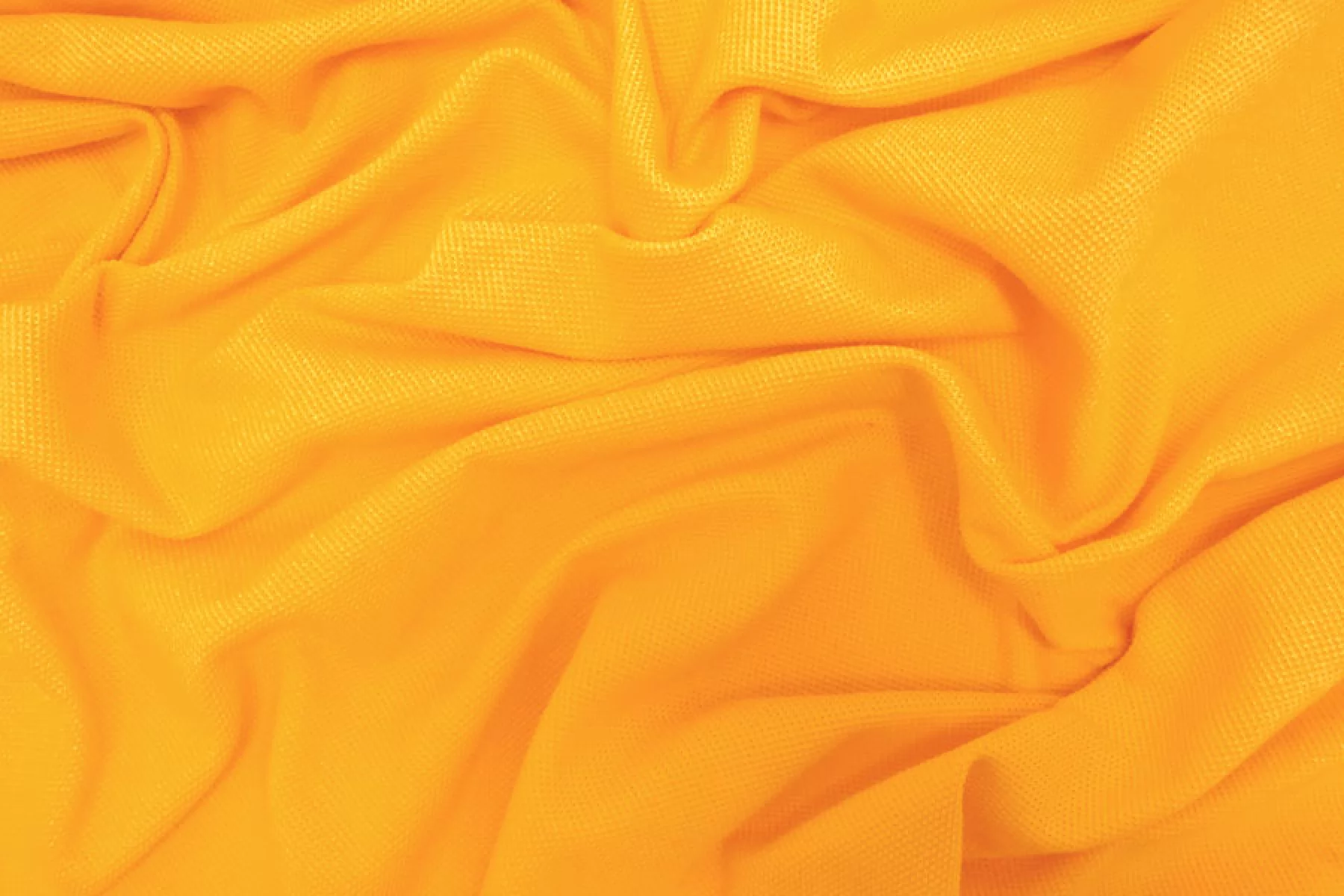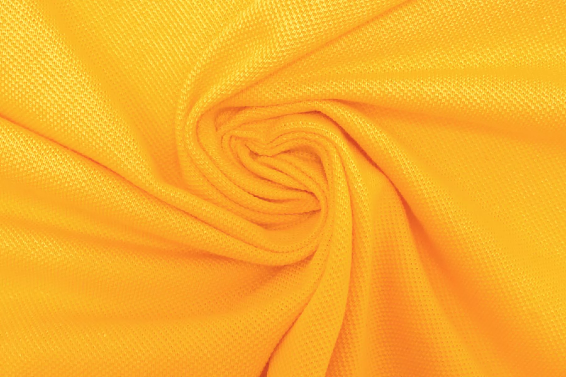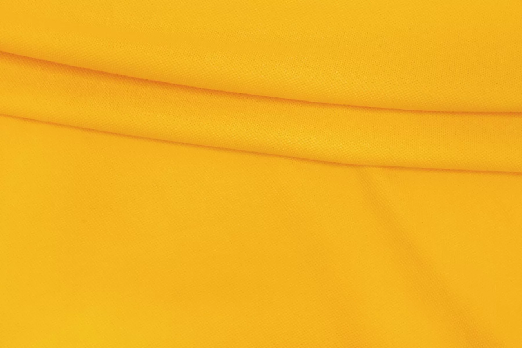 Хлопковый трикотаж пике красивого жёлтого цвета (с лёгким оранжевым подтоном) . Материал суховатый, ощущается фактура плетения, плотненький. Слегка просвечивает силуэт на просвет. Тянется благодаря плетению. Материал пластичный, хорошо драпируется и держит форму. Мнется умеренно. Идеальный вариант для пошива футболок-поло.