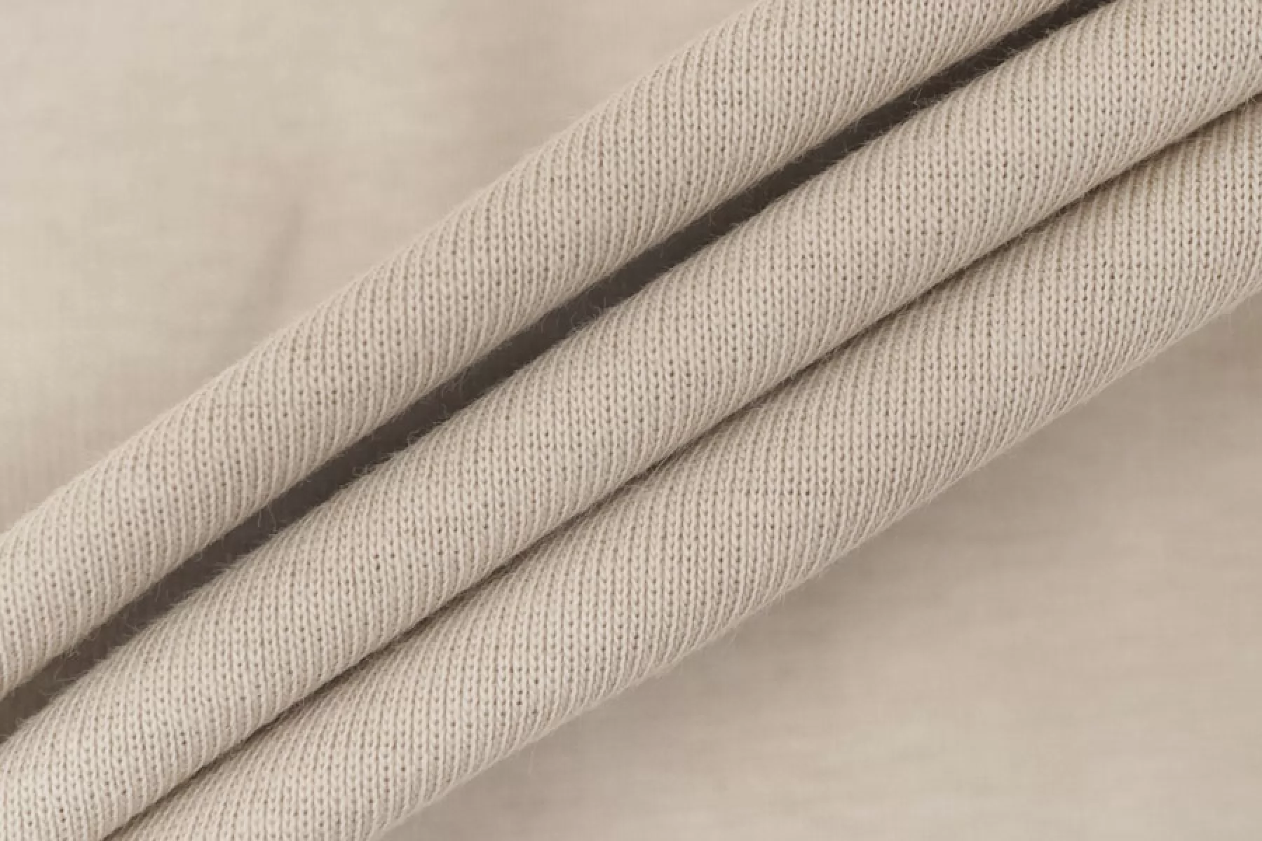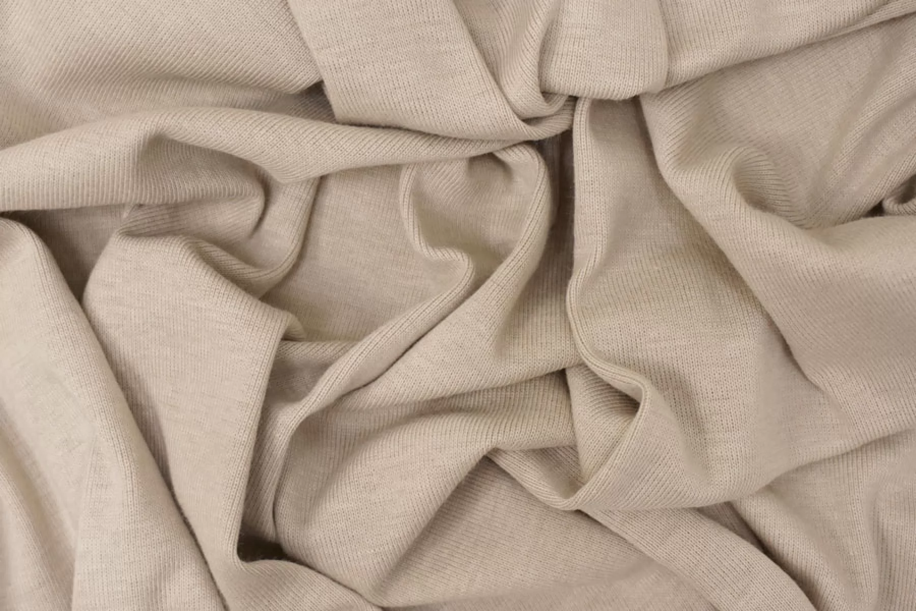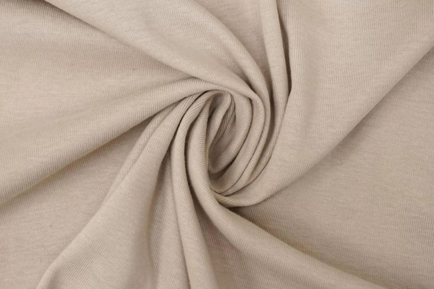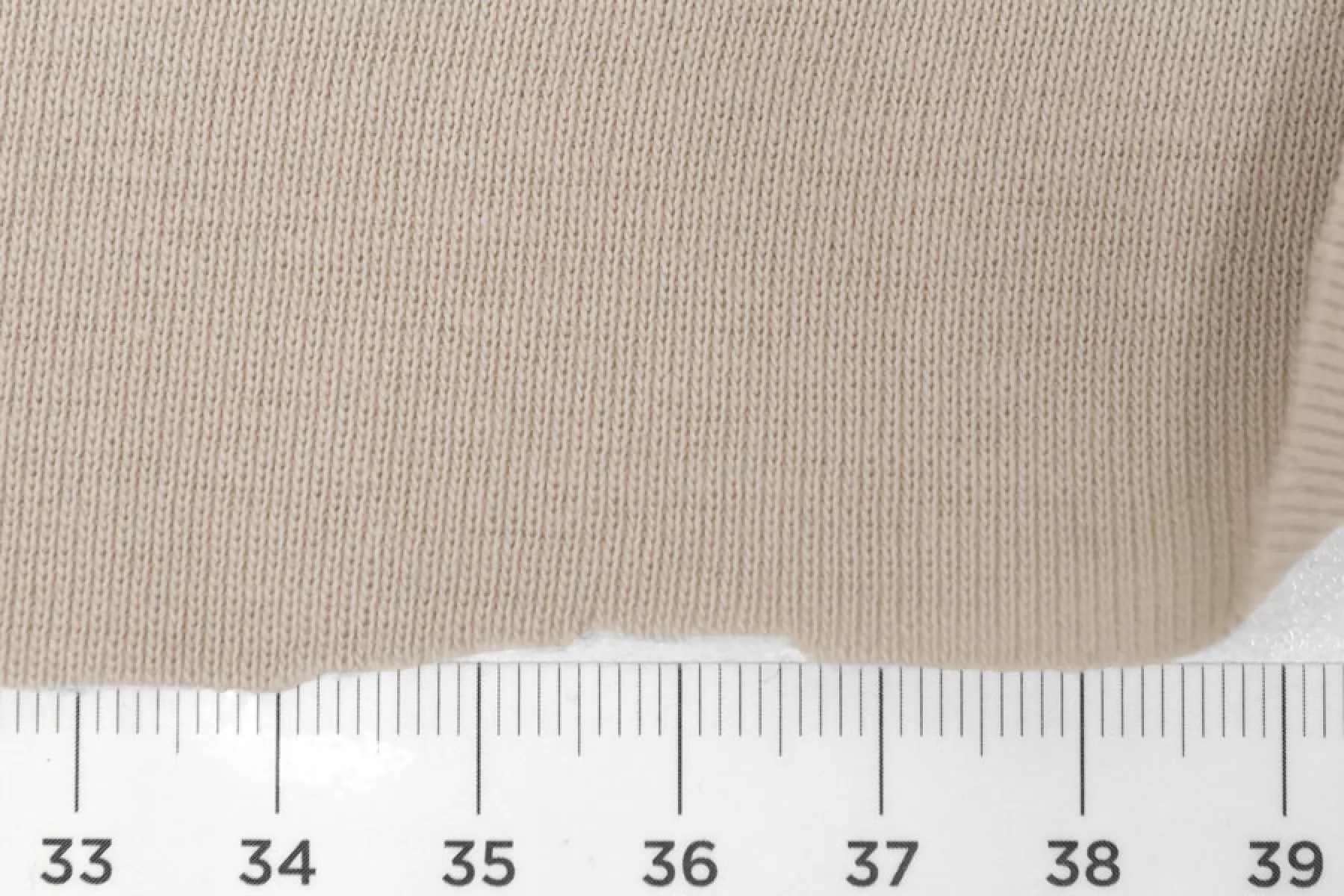 Итальянский хлопковый трикотаж от бренда PUCCI бежевого цвета. Материал пластичный, мягкий, гладкий. Тонкий. Немного просвечивает. Практически не мнется. Отлично тянется за счет плетения. Подойдет для пошива майки, футболки, топа, а также манжетов, подвязов или воротников.
