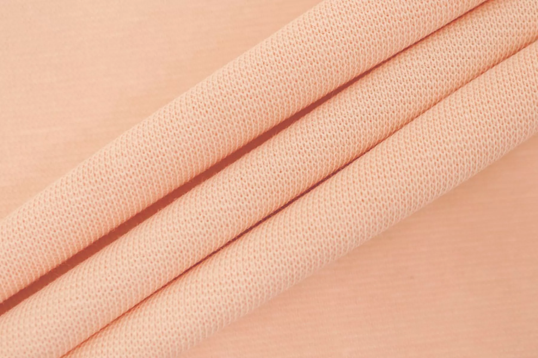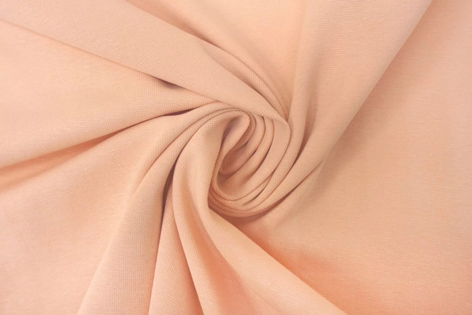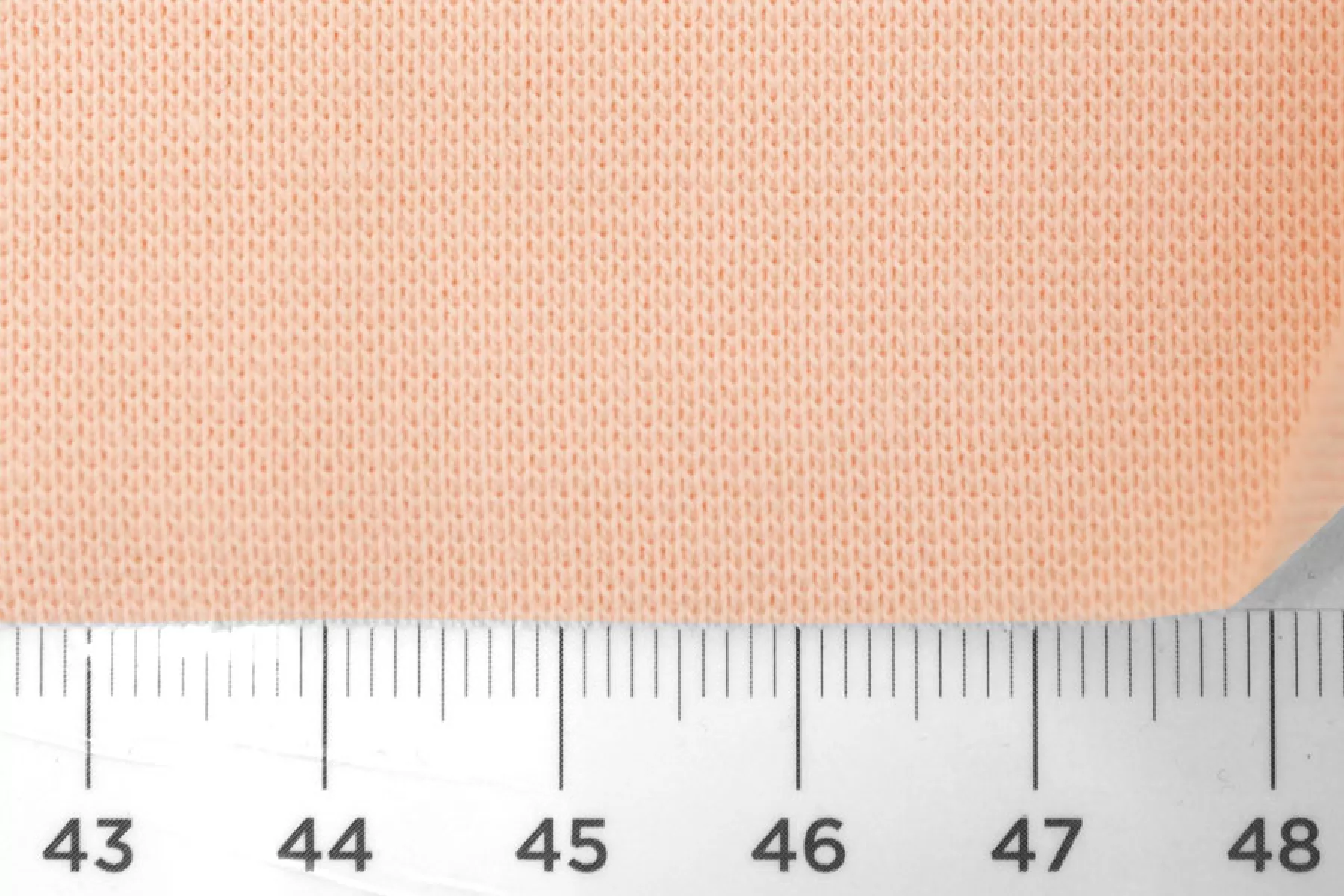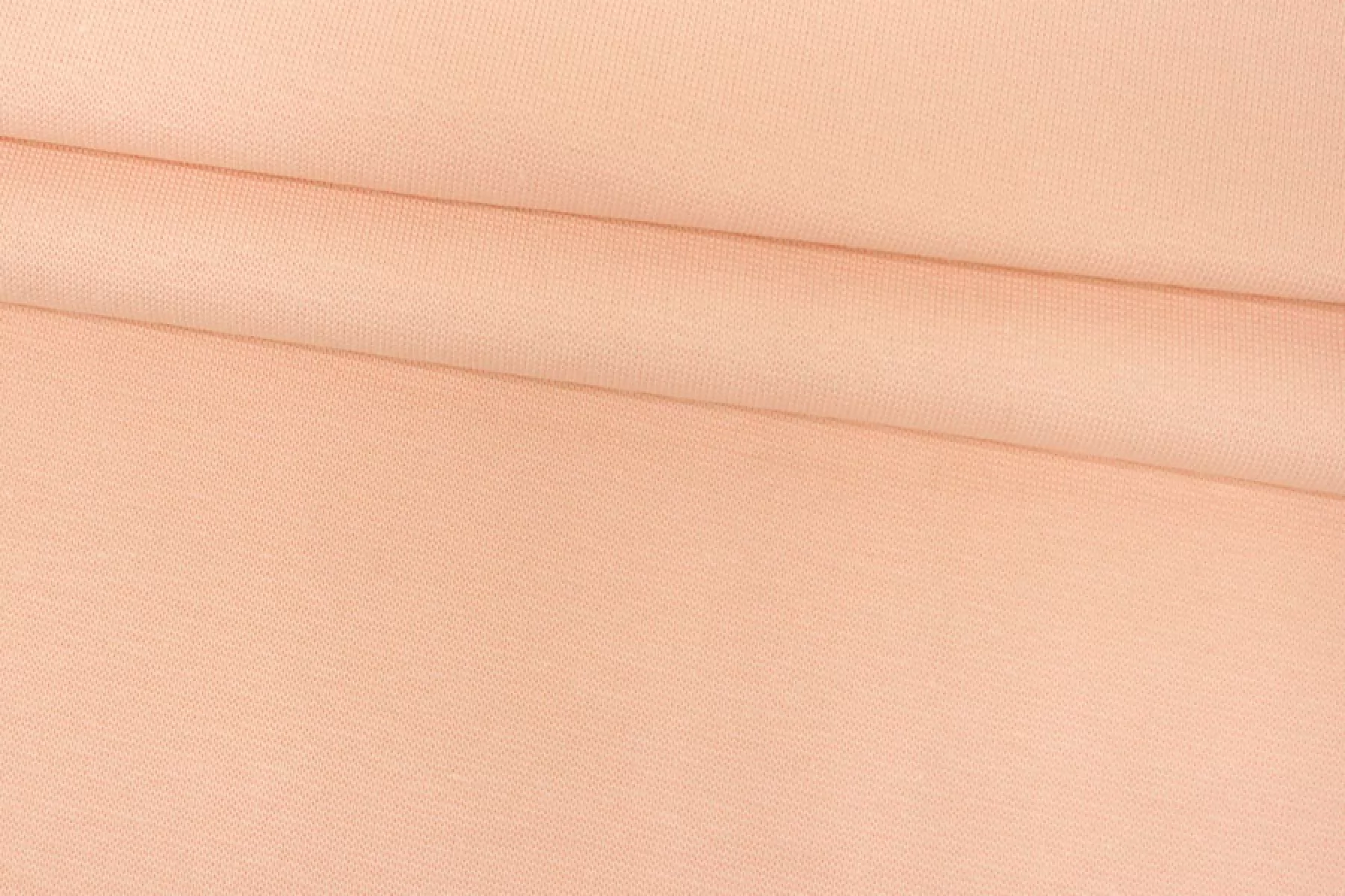 Итальянский хлопковый трикотаж - рибана персикового оттенка. Материал пластичный, мягкий, гладкий. Плотный, но тонкий. Немного просвечивает. Практически не мнется. Отлично тянется за счет плетения. Подойдет для пошива майки, футболки, топа, а также манжетов, подвязов или воротников.