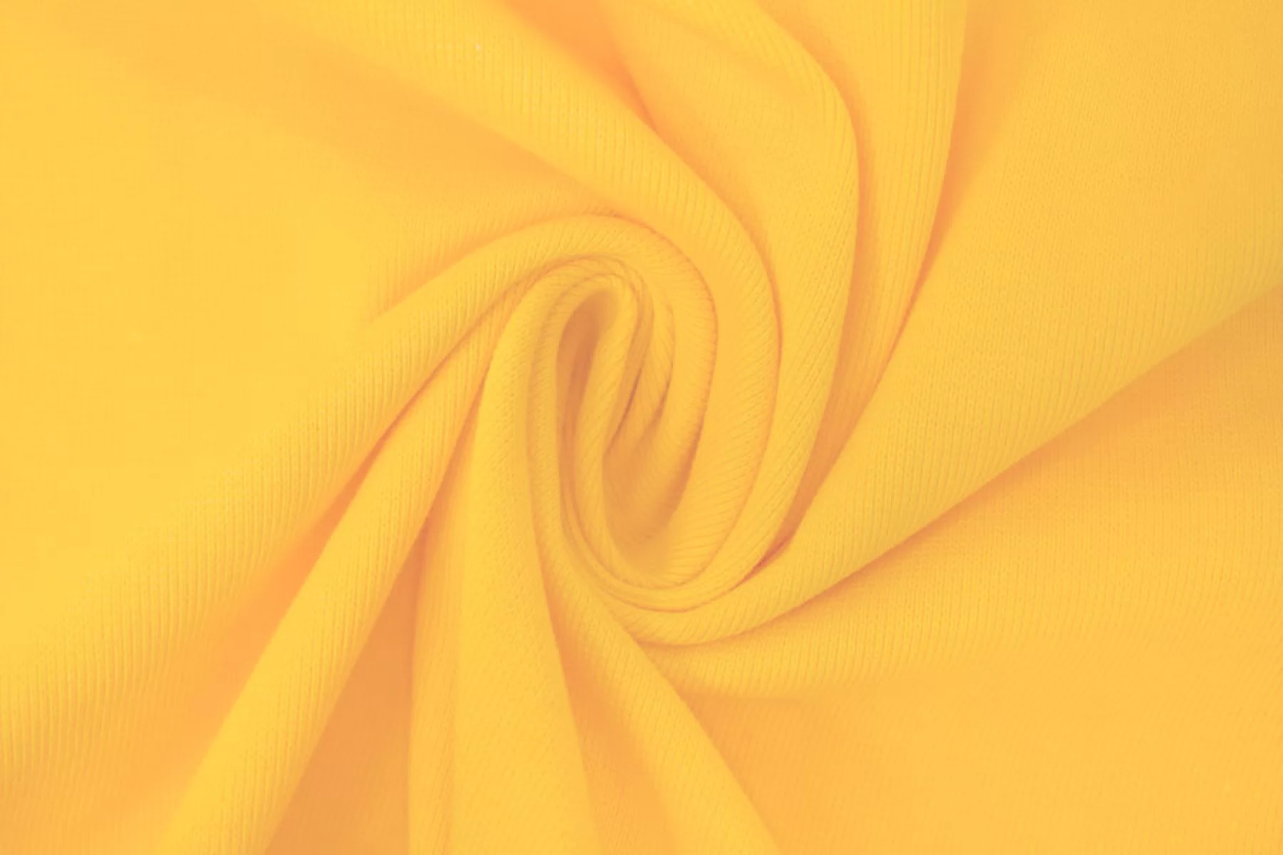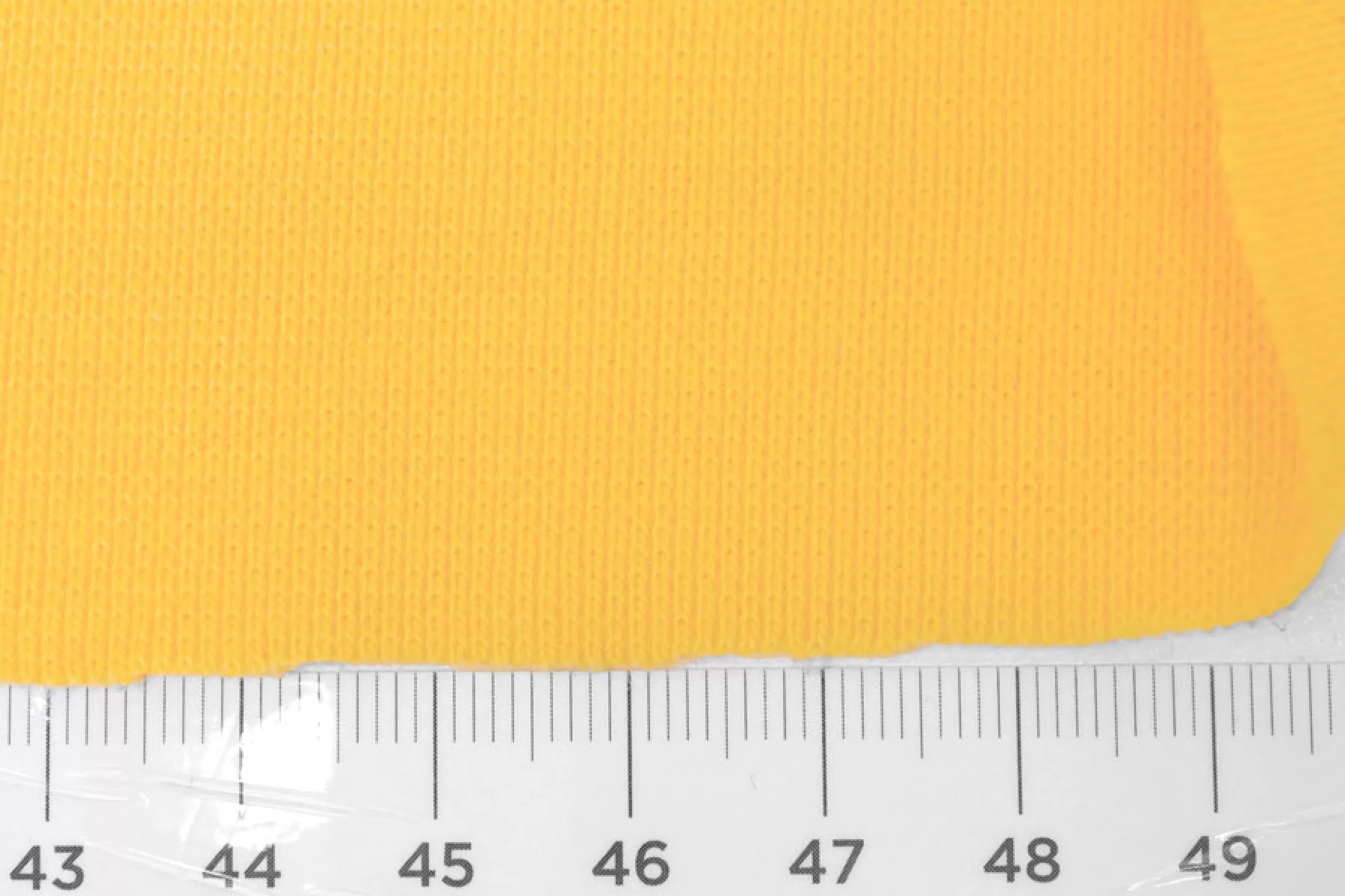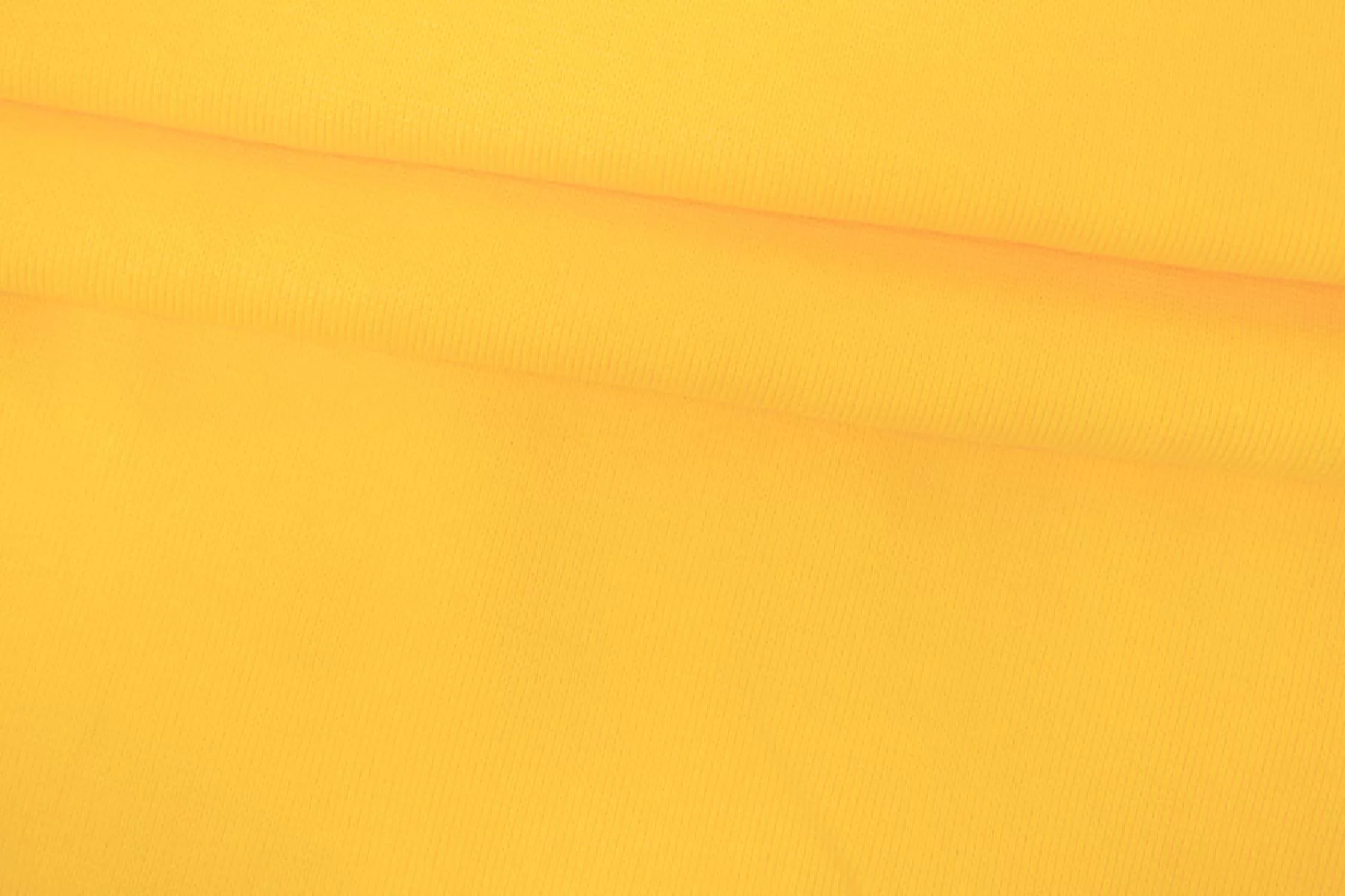 Итальянский хлопковый трикотаж желтого цвета, вязка рибана, от бренда FENDI. Материал пластичный, мягкий, гладкий. Плотный, толстенький. Немного просвечивает при растяжении. Практически не мнется. Отлично тянется. Подойдет для пошива майки, футболки, топа, а также манжетов, подвязов или воротников.
