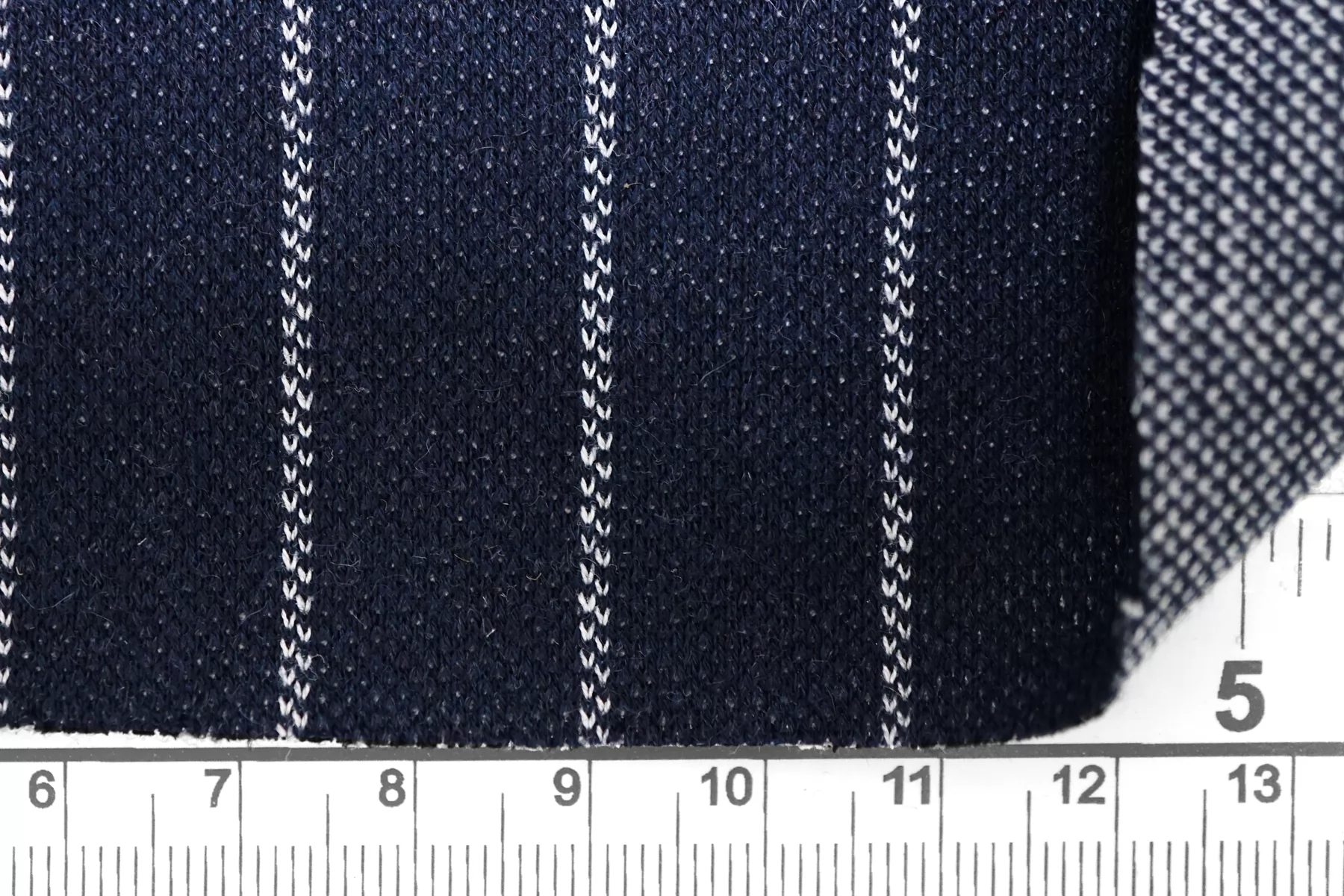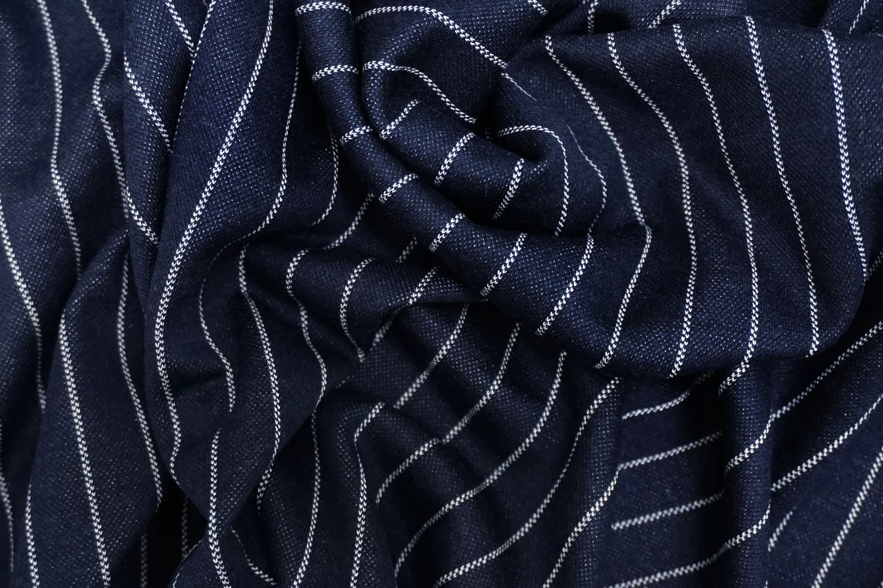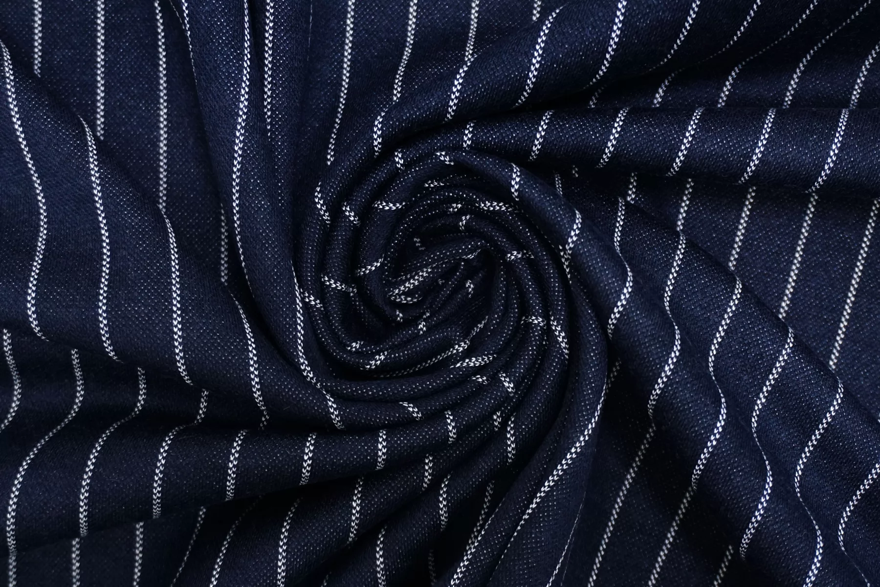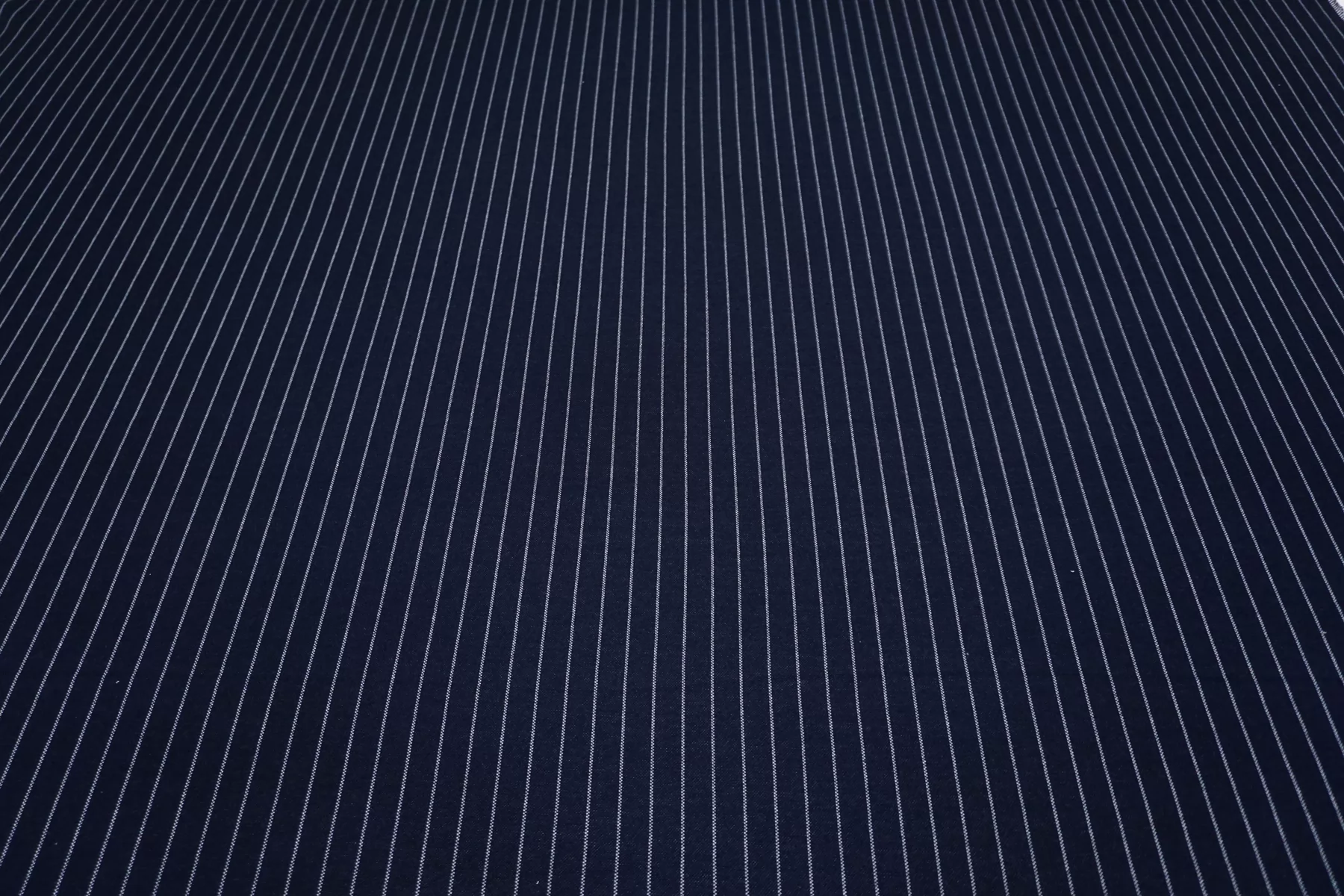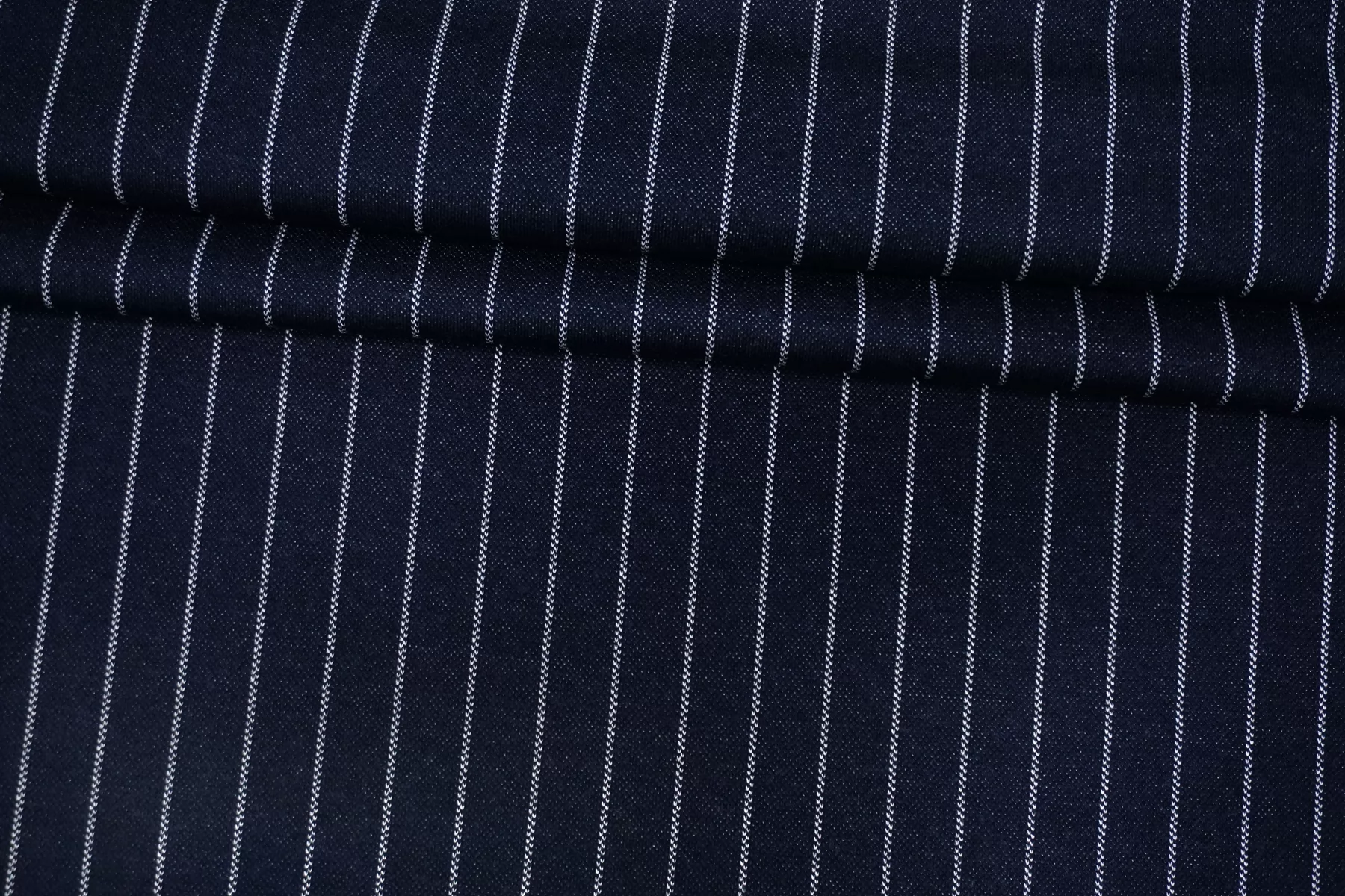 Классный итальянский трикотаж из хлопка с небольшой добавкой кашемира и шёлка. Цвет тёмно-синий в тонкую белую полоску (вдоль кромки). Материал тактильно приятный, гладкий и мягкий. Вязка тянется, но не сильно. Совсем не колется. Пластичный. Просвечивает минимально в один слой, в изделии заметно не будет. Прекрасно драпируется и держит форму. Классный вариант на платья, юбки, штаны и домашнюю одежду. Уход деликатный.