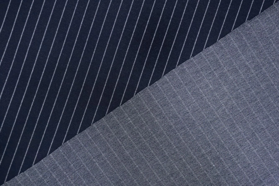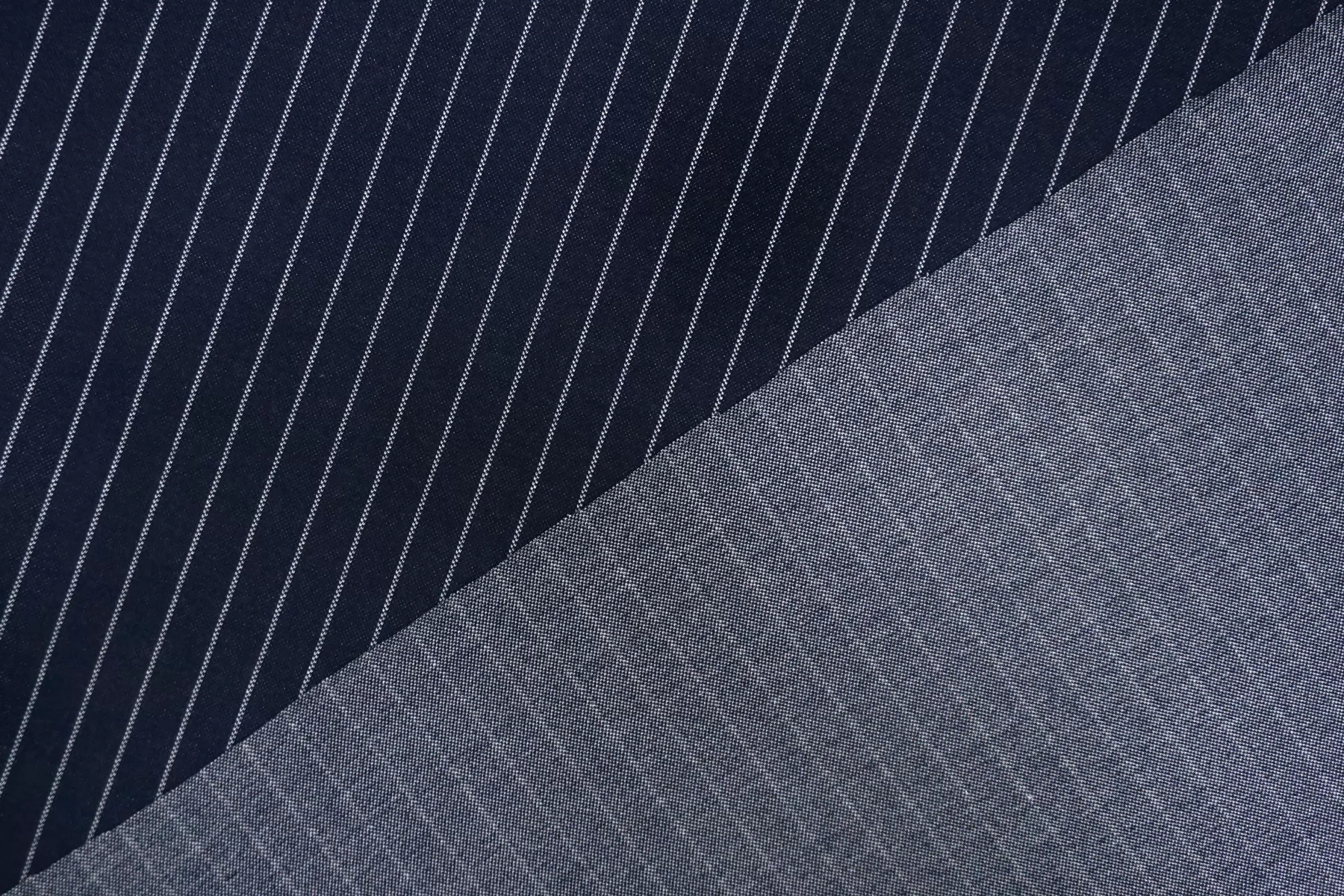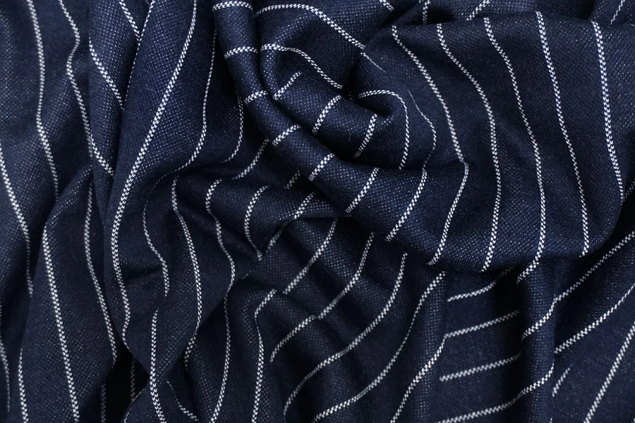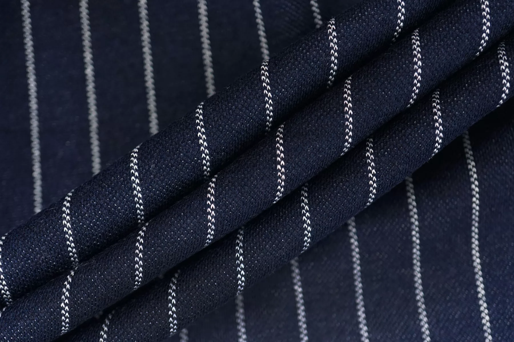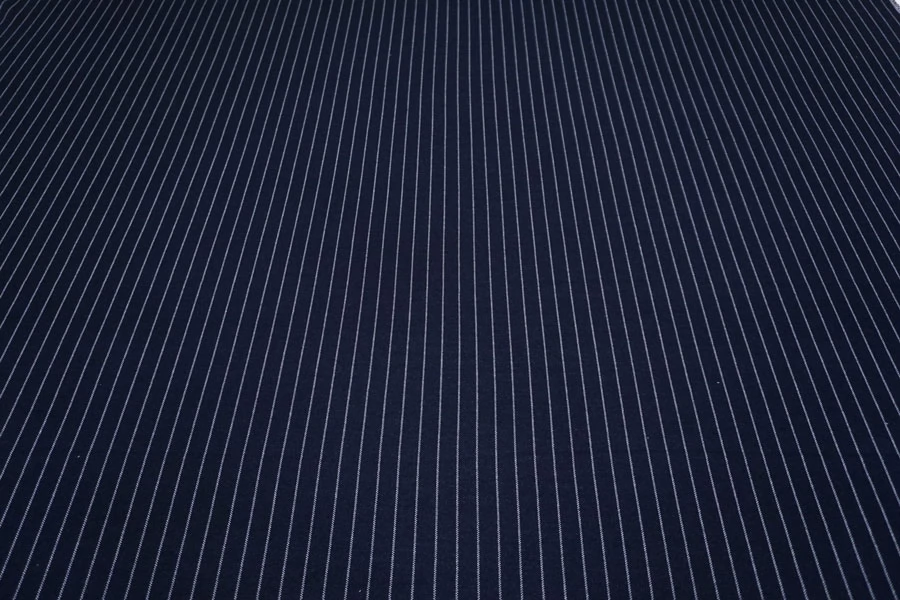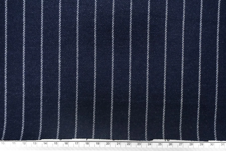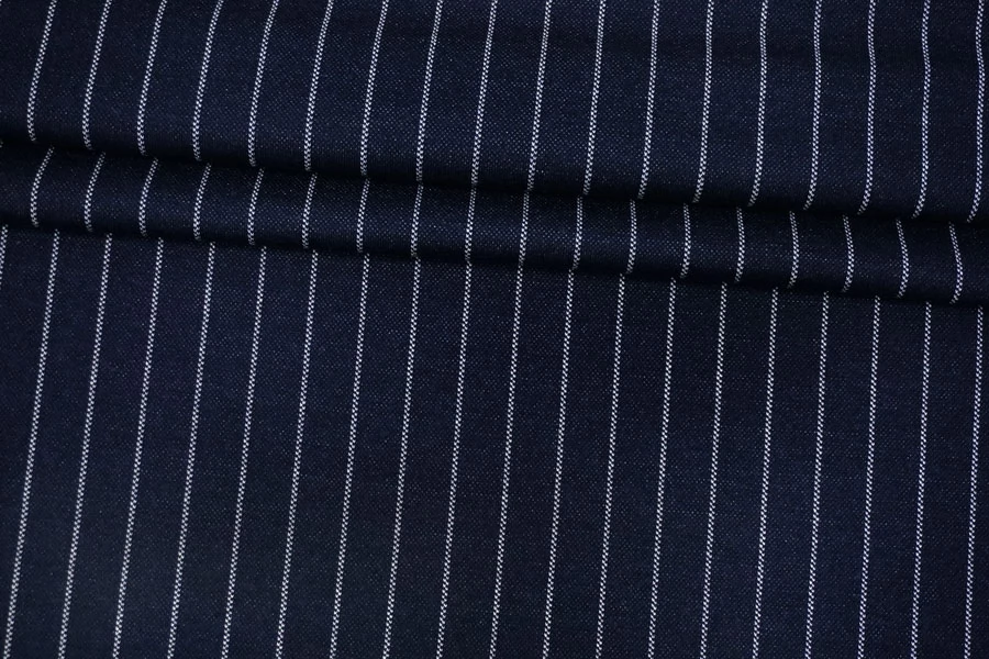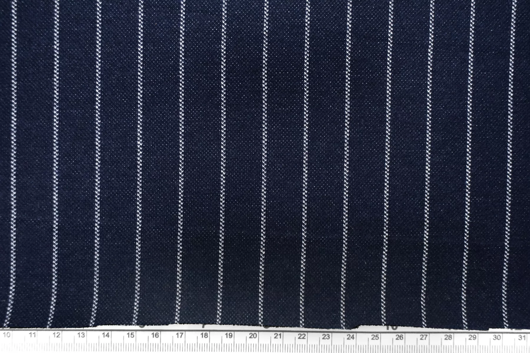 Классный итальянский трикотаж из хлопка с небольшой добавкой кашемира и шёлка. Цвет тёмно-синий в тонкую белую полоску (вдоль кромки). Материал тактильно приятный, гладкий и мягкий. Вязка тянется, но не сильно. Совсем не колется. Пластичный. Просвечивает минимально в один слой, в изделии заметно не будет. Прекрасно драпируется и держит форму. Классный вариант на платья, юбки, штаны и домашнюю одежду. Уход деликатный.
