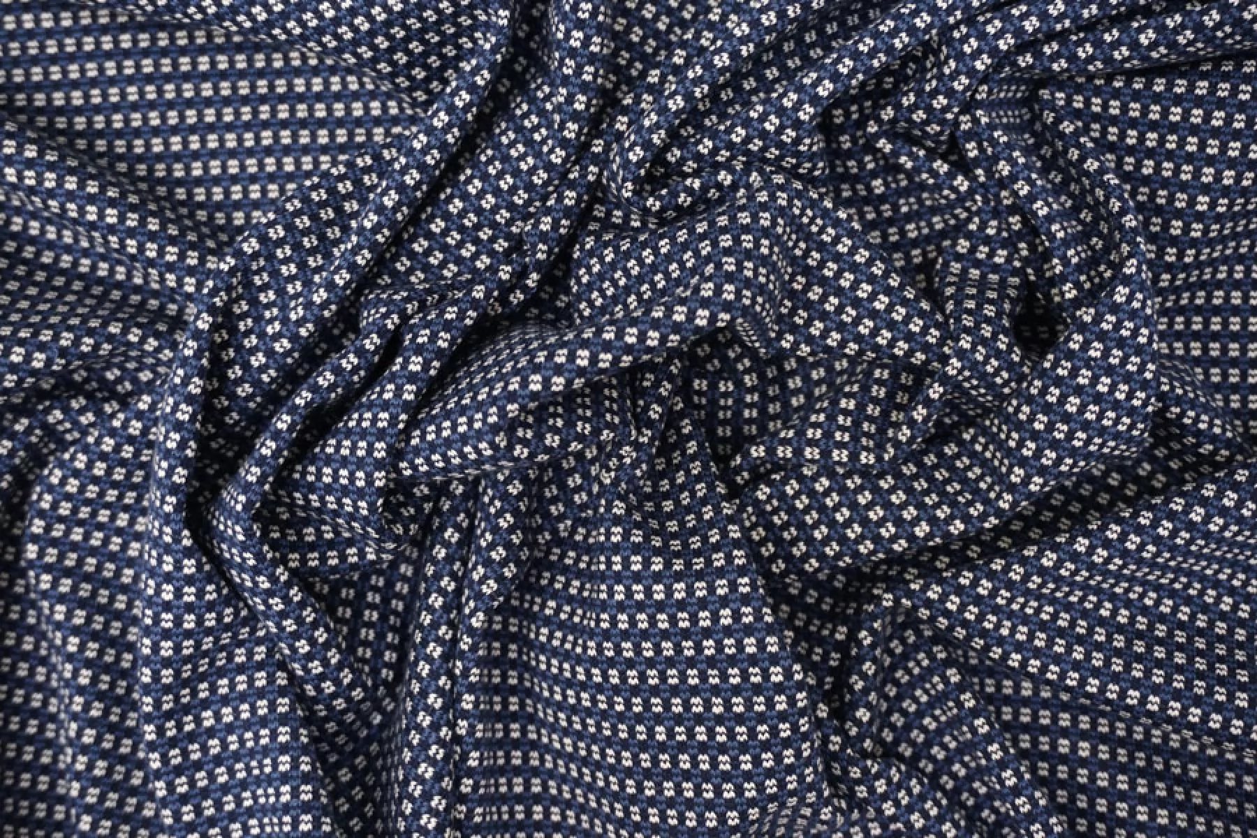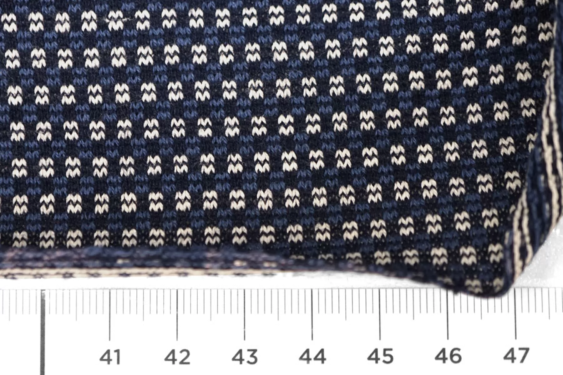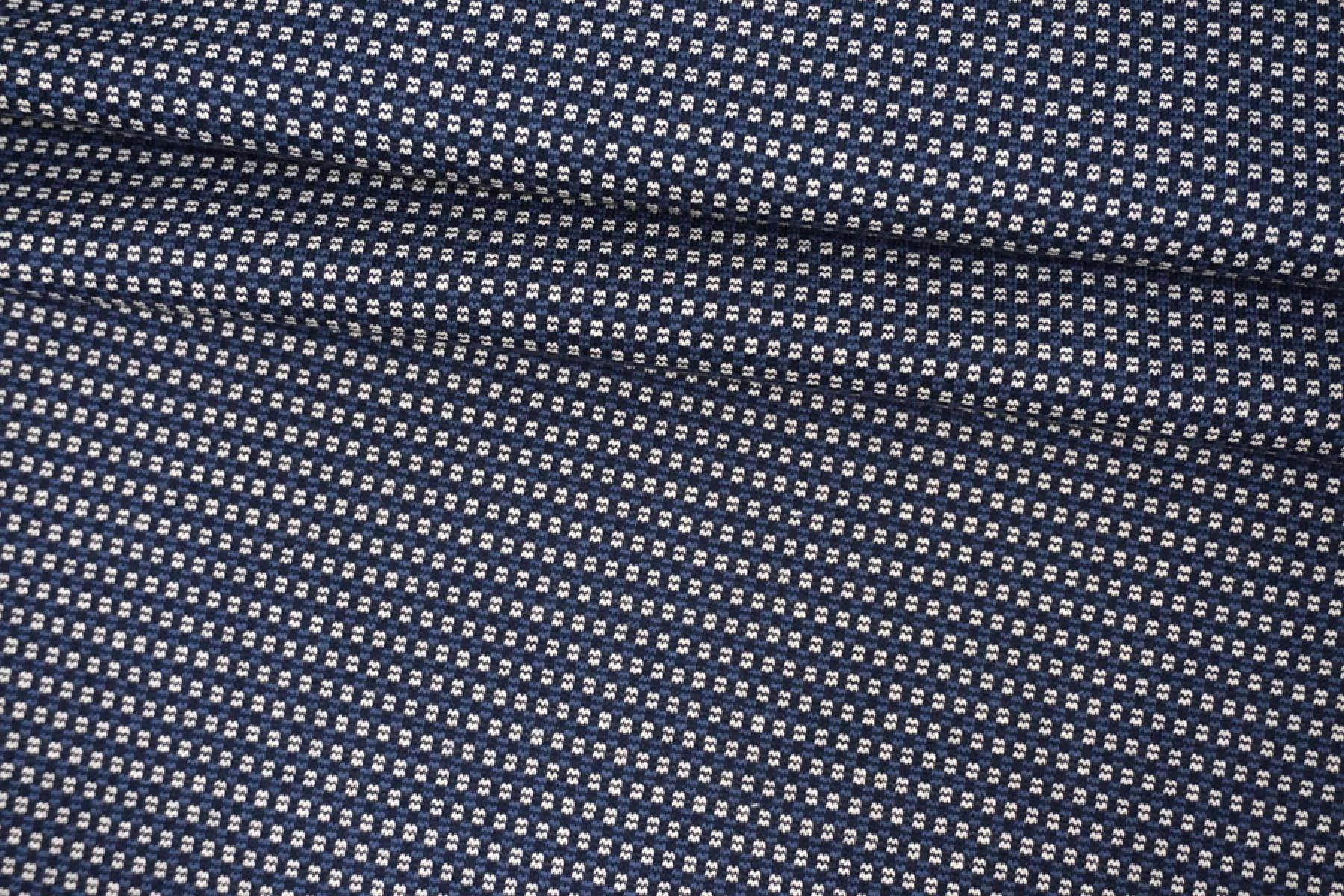 Трикотаж из хлопка с орнаментальным узором из нитей белого, темно-синего и синего цвета. Тактильно суховат, изнанка шероховатая. Немного просвечивает. Тянется неплохо, пластичный. Средней плотности. Отличный вариант для пошива кофты, платья, юбки.
