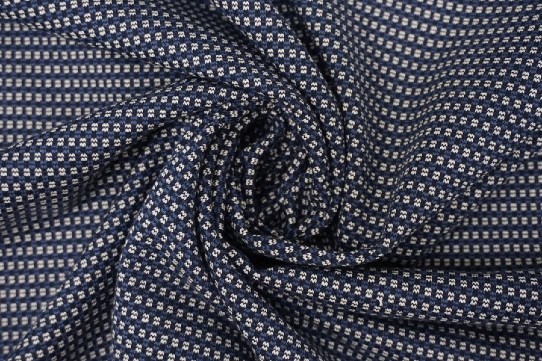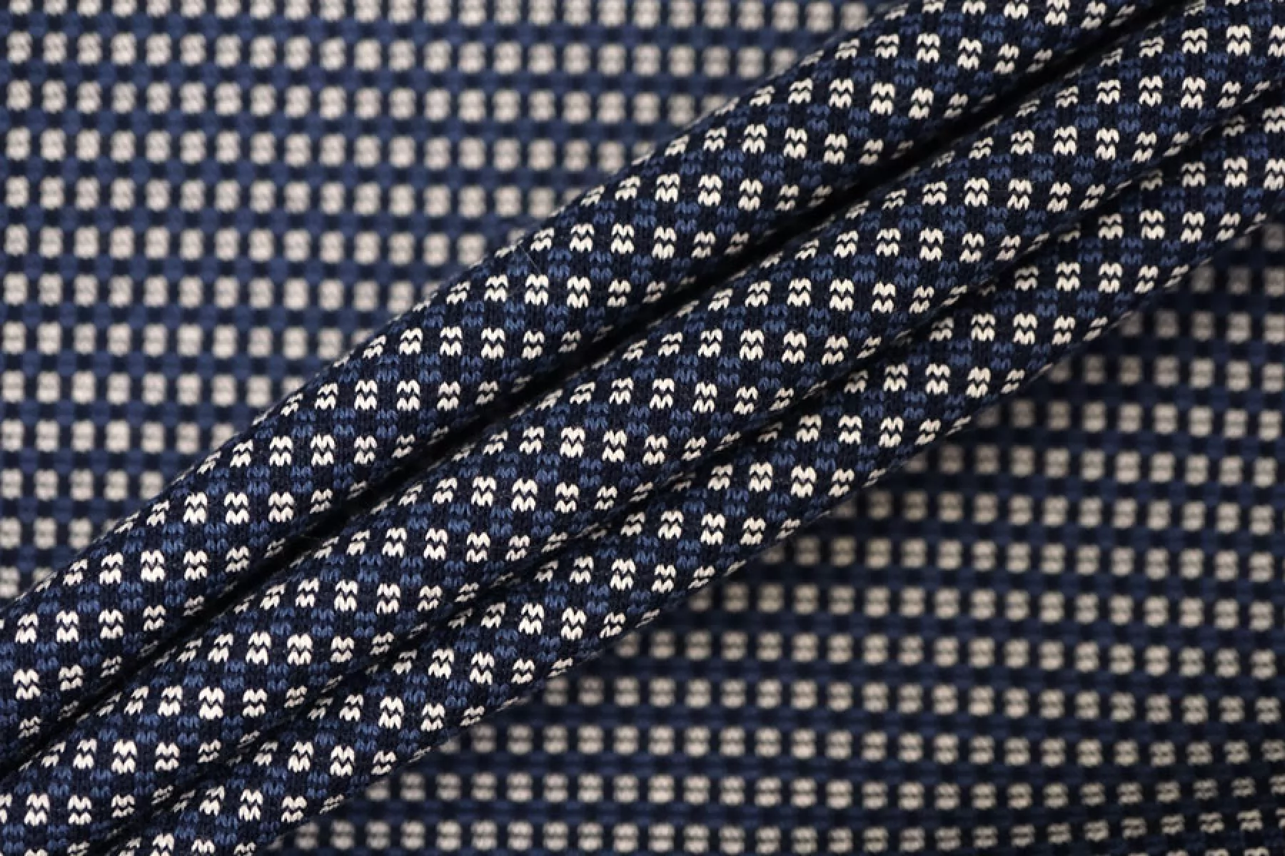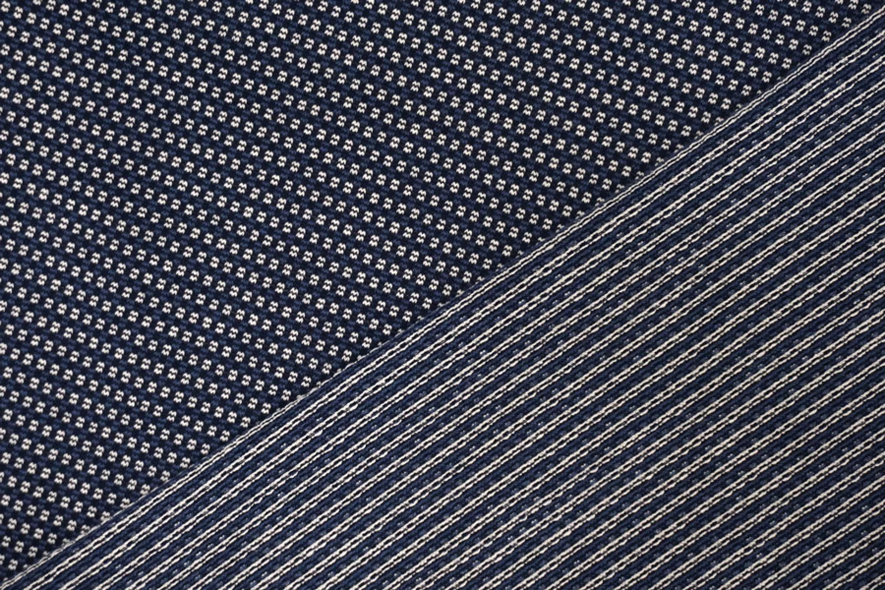 Трикотаж из хлопка с орнаментальным узором из нитей белого, темно-синего и синего цвета. Тактильно суховат, изнанка шероховатая. Немного просвечивает. Тянется неплохо, пластичный. Средней плотности. Отличный вариант для пошива кофты, платья, юбки.
