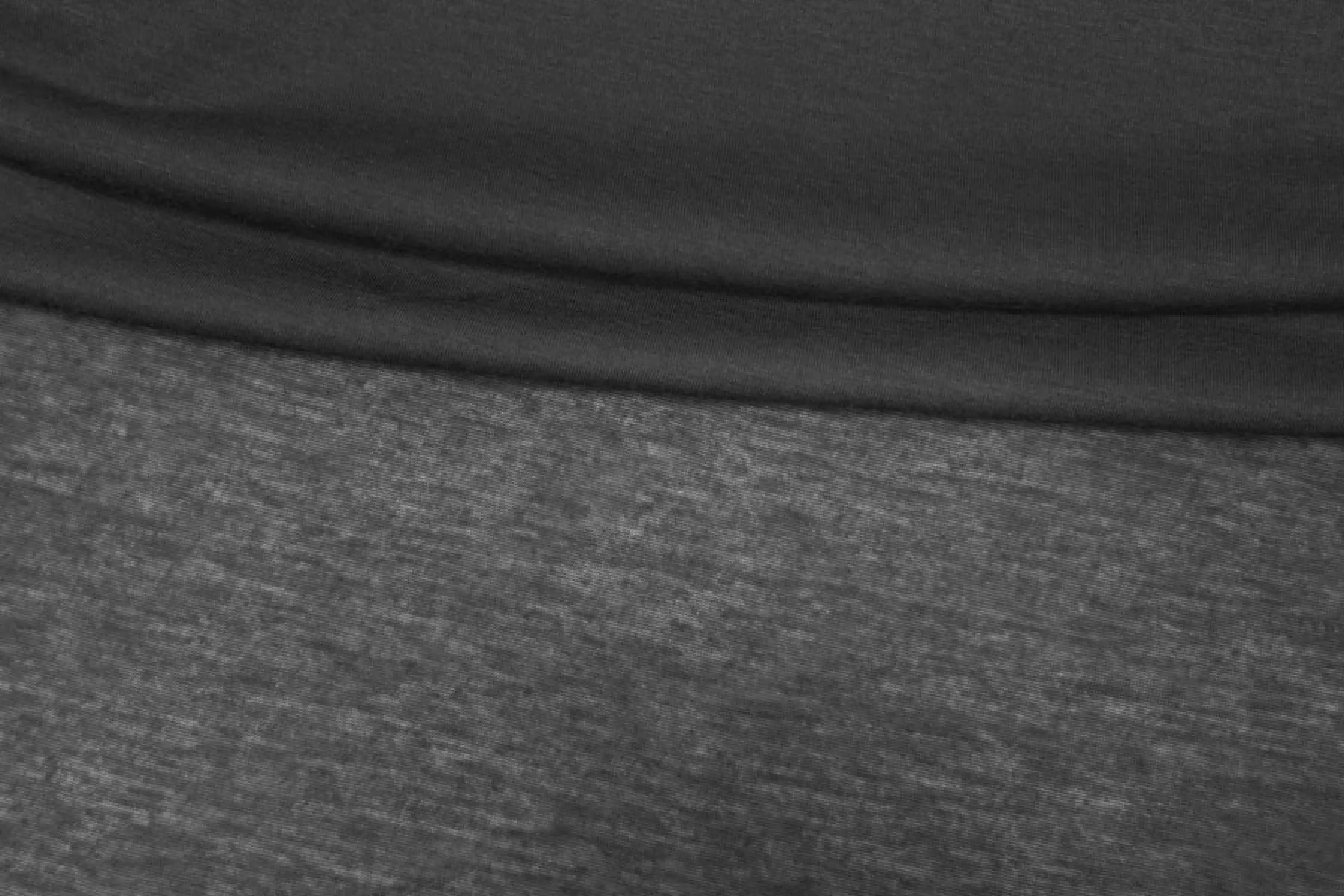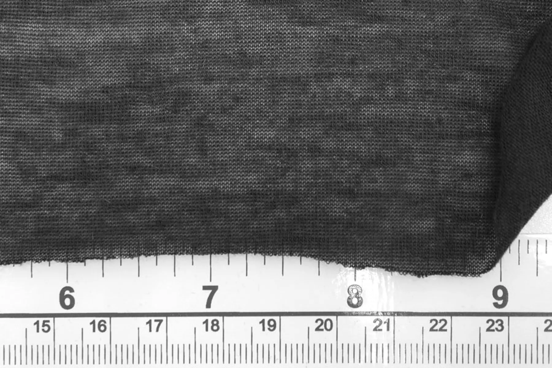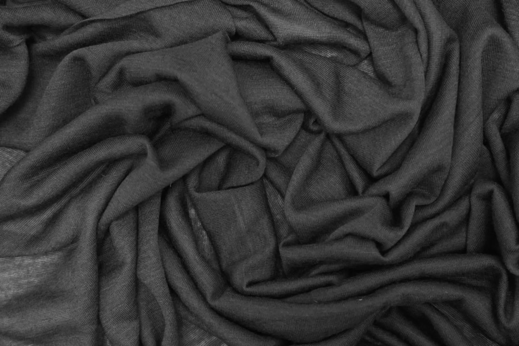 Прекрасный трикотаж - кулирная гладь, из хлопка с добавкой шерсти и шёлка, в темном сером цвете. Тонкий, просвечивающий. Хорошо тянется за счет плетения. Тактильно очень приятный, гладкий, шерсть не ощущается. Пластичный, форму не держит. Очень комфортный к телу. Можно использовать для пошива маек, футболок, платьев, туник. Уход деликатный.