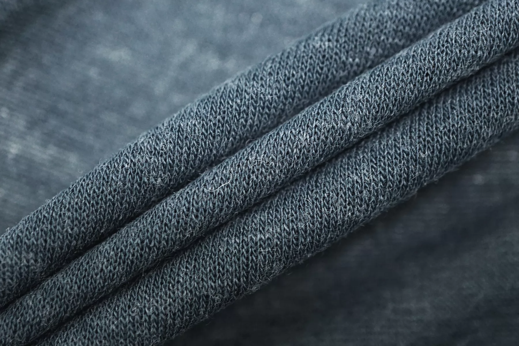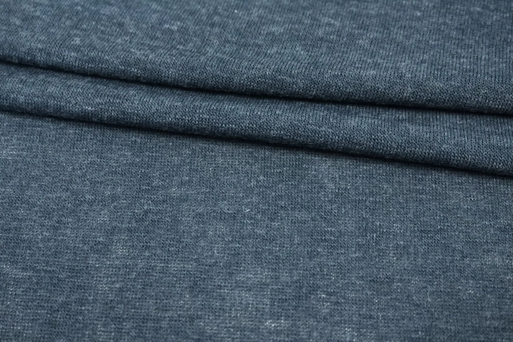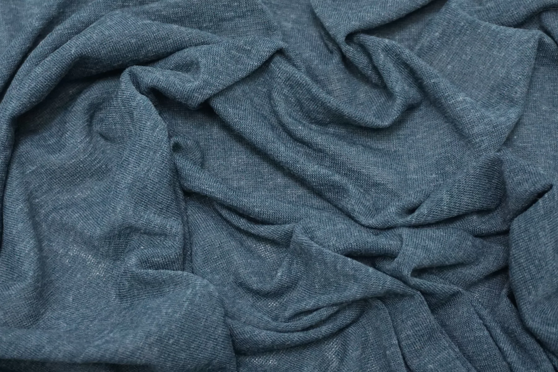 Трикотаж из хлопка с шерстью, в приглушённом, не ярком бирюзовом цвете. Тактильно чуть суховат, слегка колется. Просвечивает силуэт. Хорошо тянется за счет плетения и эластана. Пластичный, форму не держит. Можно использовать для пошива лонгсливов, маек, футболок, платьев, туник. Уход деликатный.