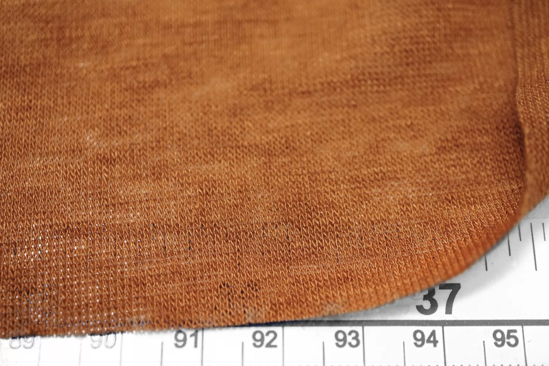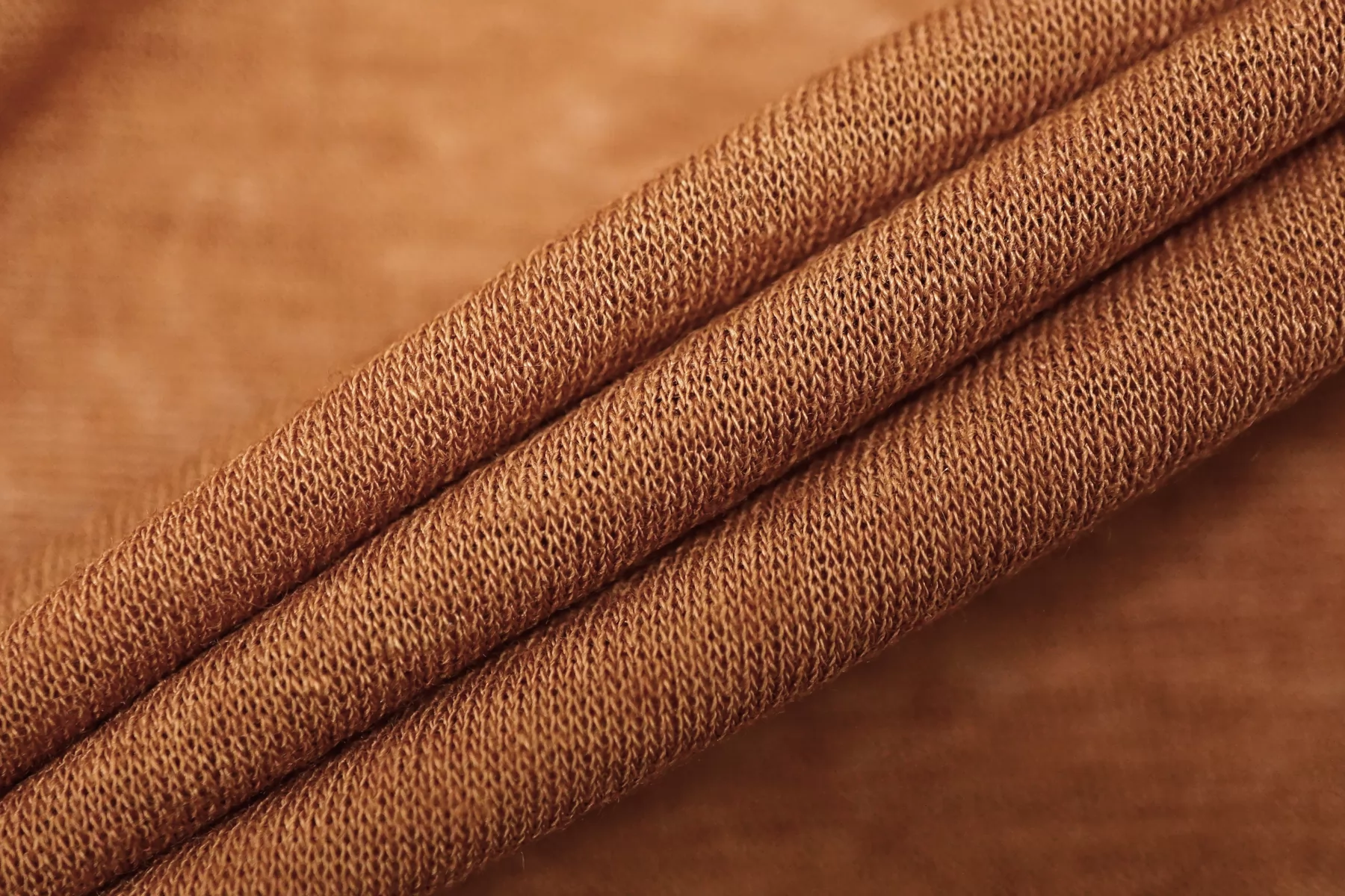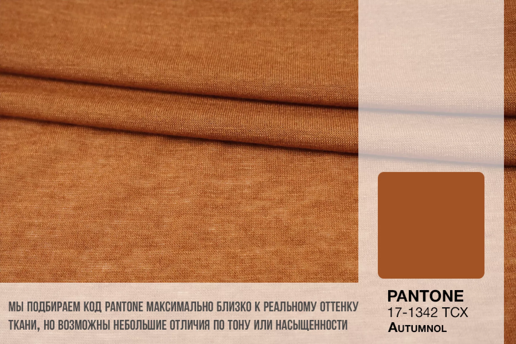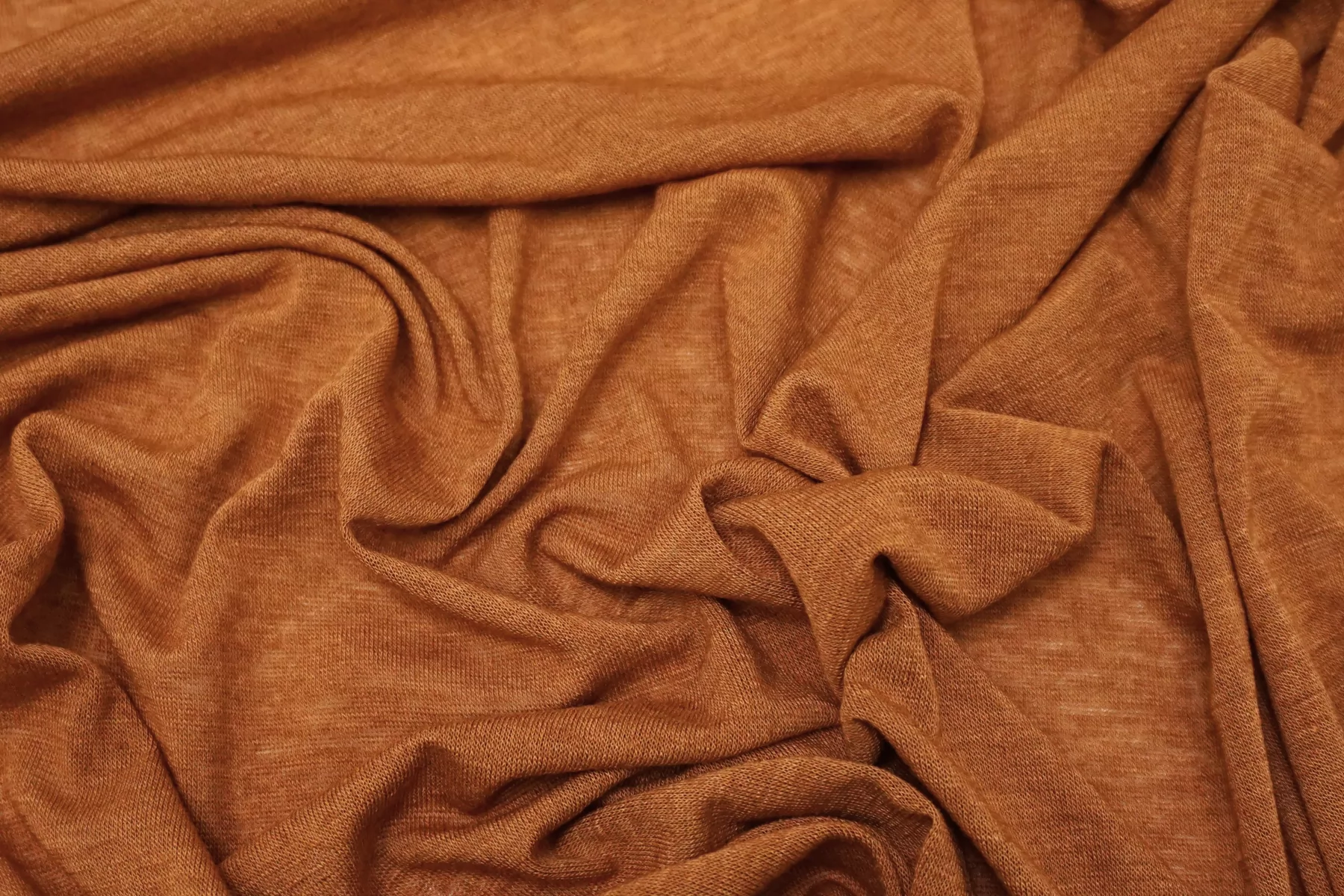 Трикотаж из хлопка с шерстью, в приглушённом, в приглушенном терракотовом оттенке с оранжевым подтоном. Тактильно чуть суховат, слегка колется. Просвечивает силуэт. Хорошо тянется за счет плетения и эластана. Пластичный, форму не держит. Можно использовать для пошива лонгсливов, маек, футболок, платьев, туник. Уход деликатный.