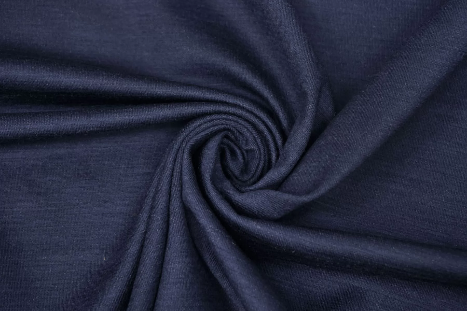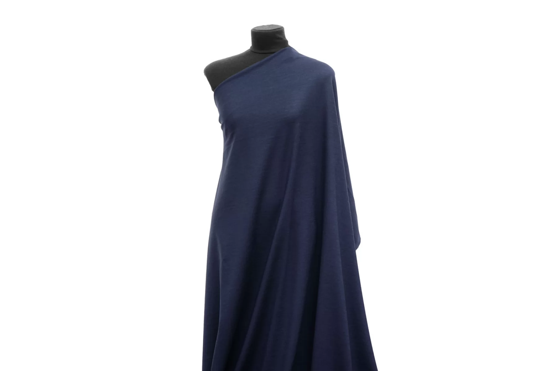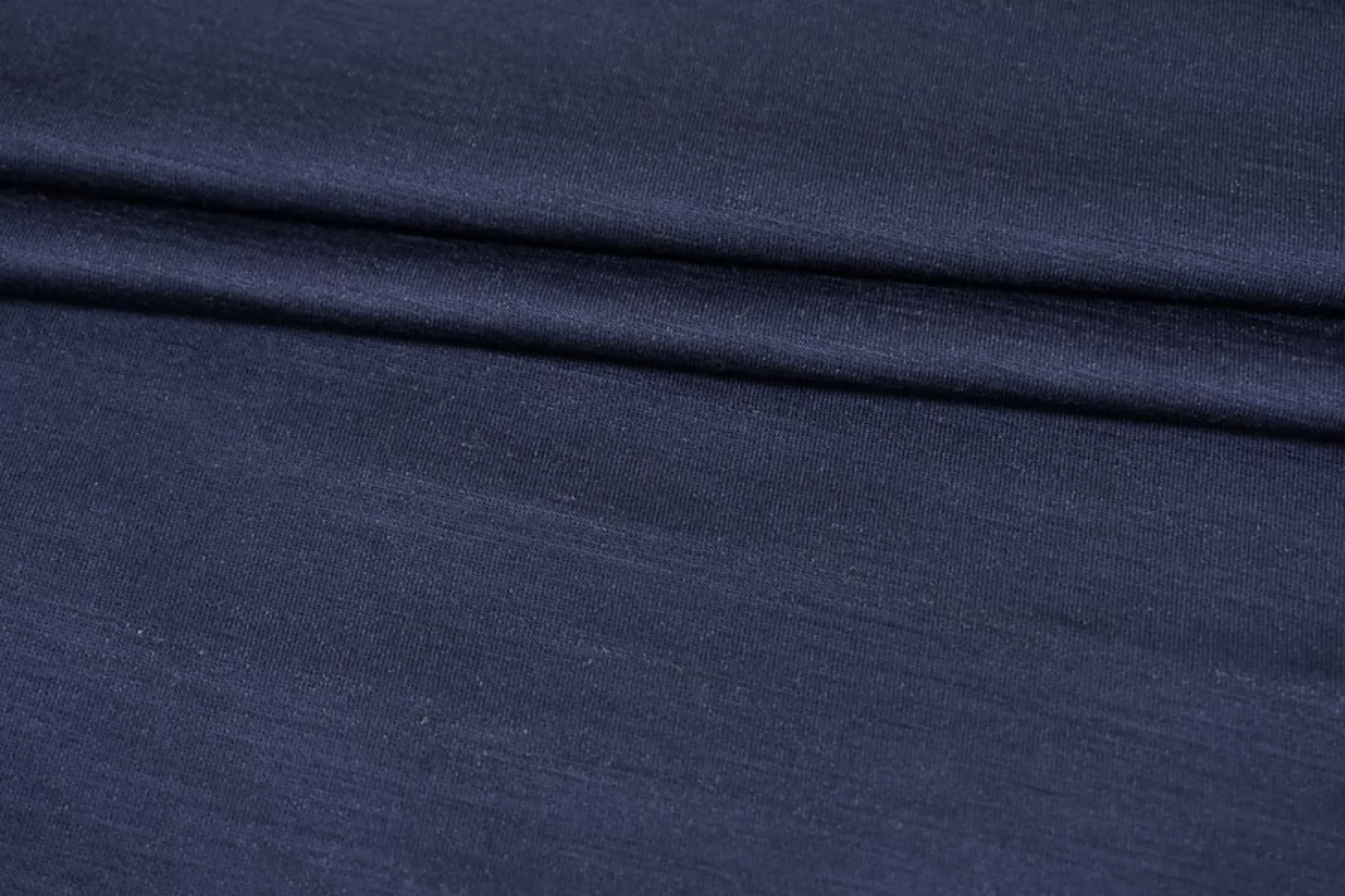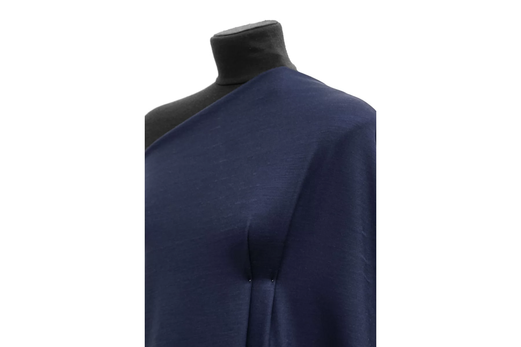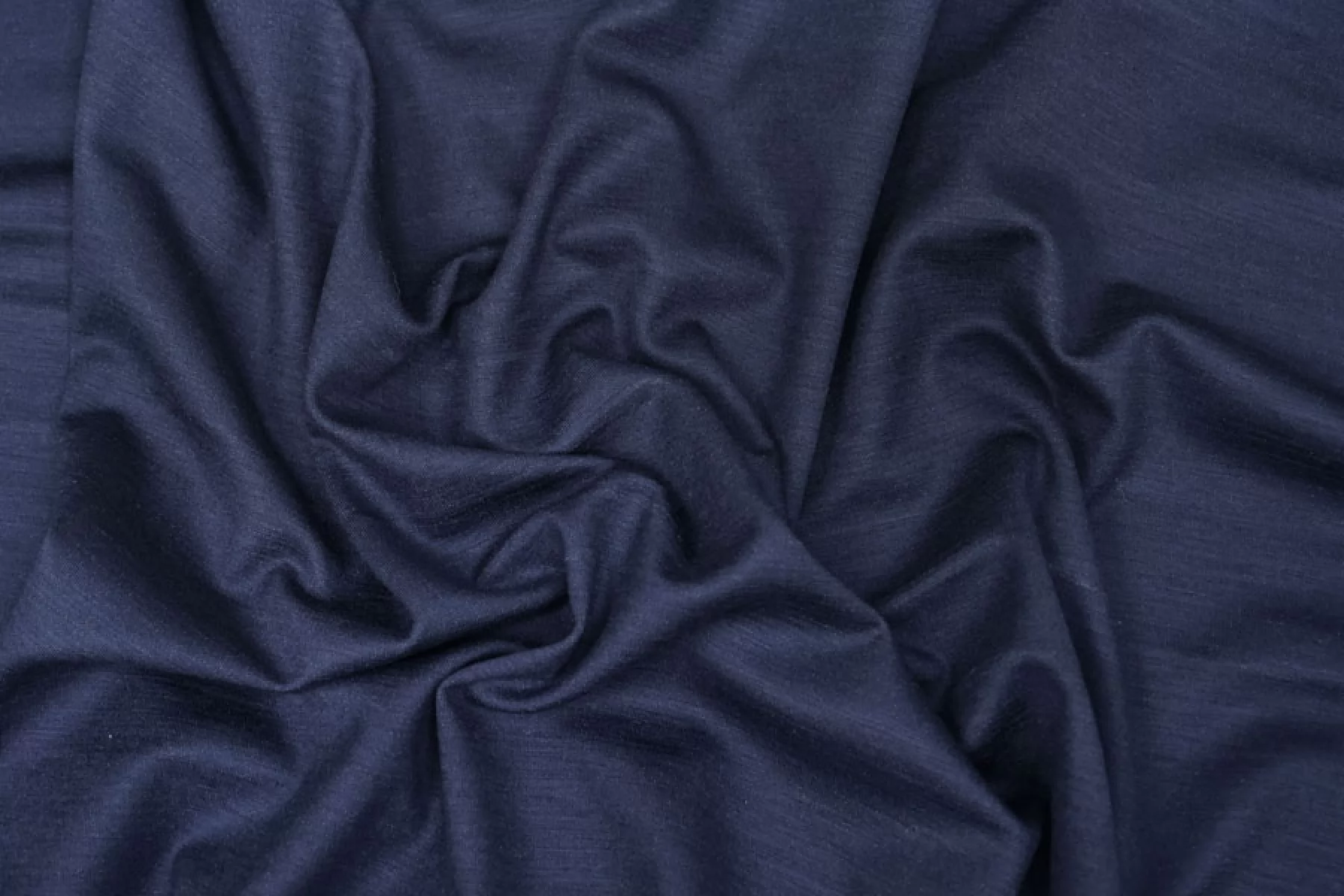 Классный итальянский шерстяной трикотаж синего цвета. Материал тактильно приятный, гладкий и мягкий. Неплохо тянется за счет плетения и эластана. Совсем не колется.Пластичный. Не просвечивает. Прекрасно драпируется и держит форму. Классный вариант на майки, футболки, платья, туники, штаны и домашнюю одежду. Уход деликатный.