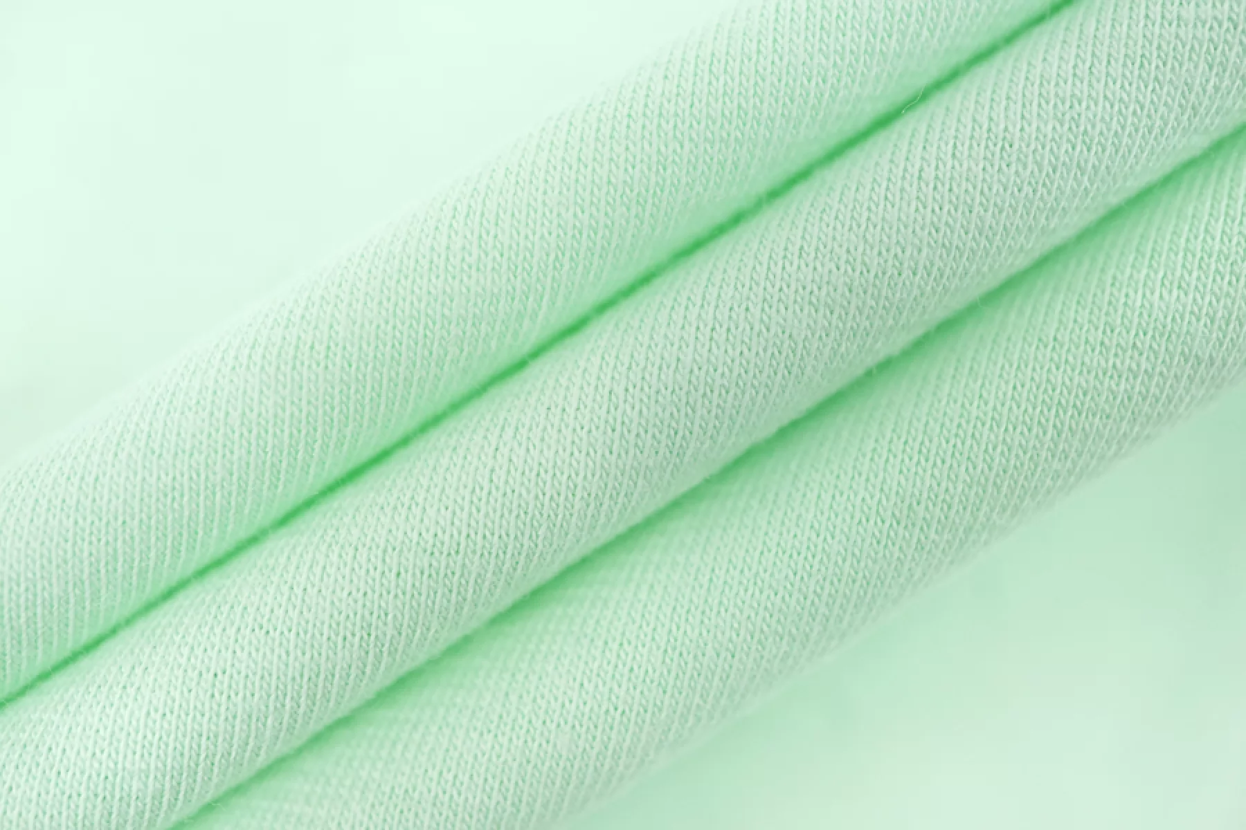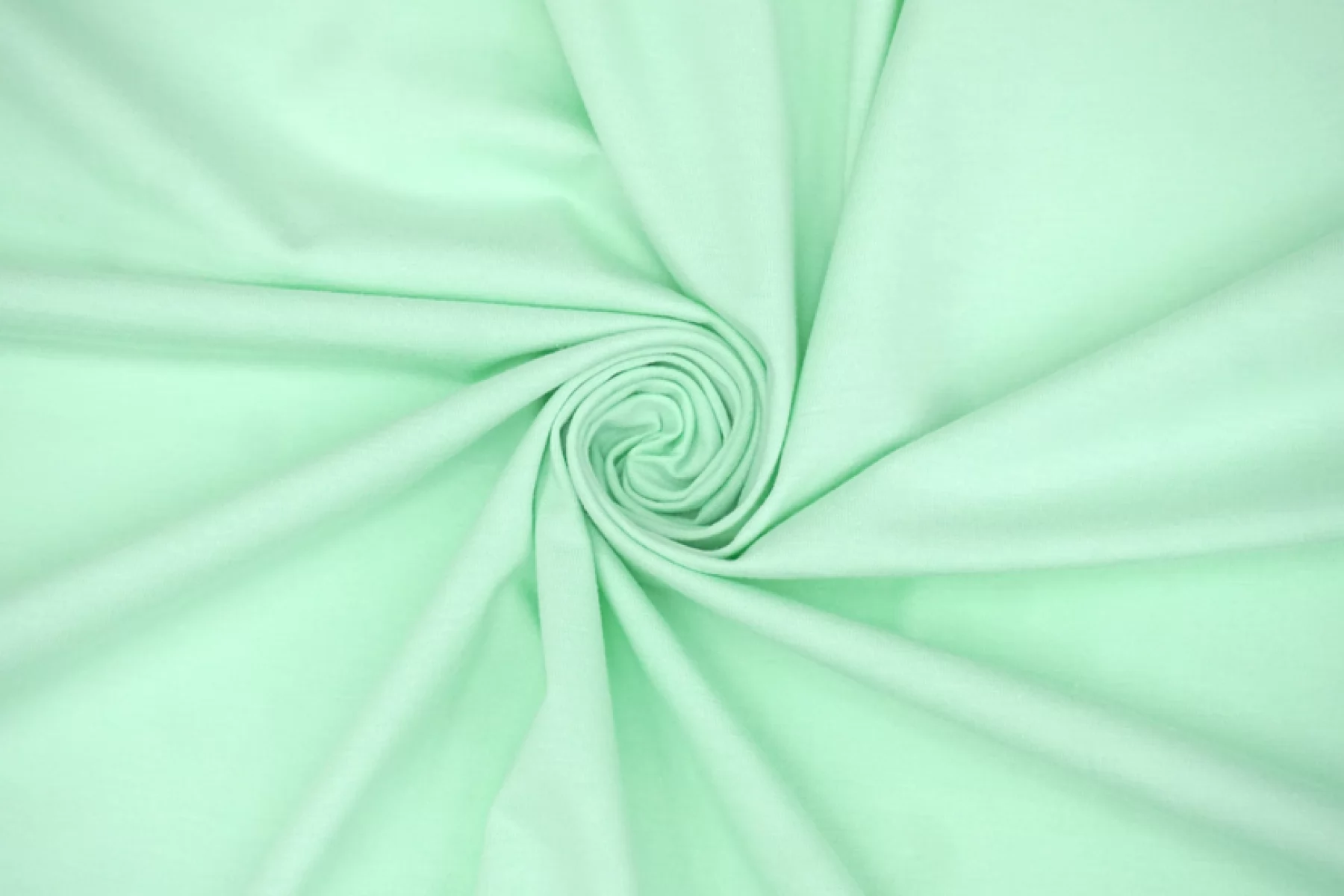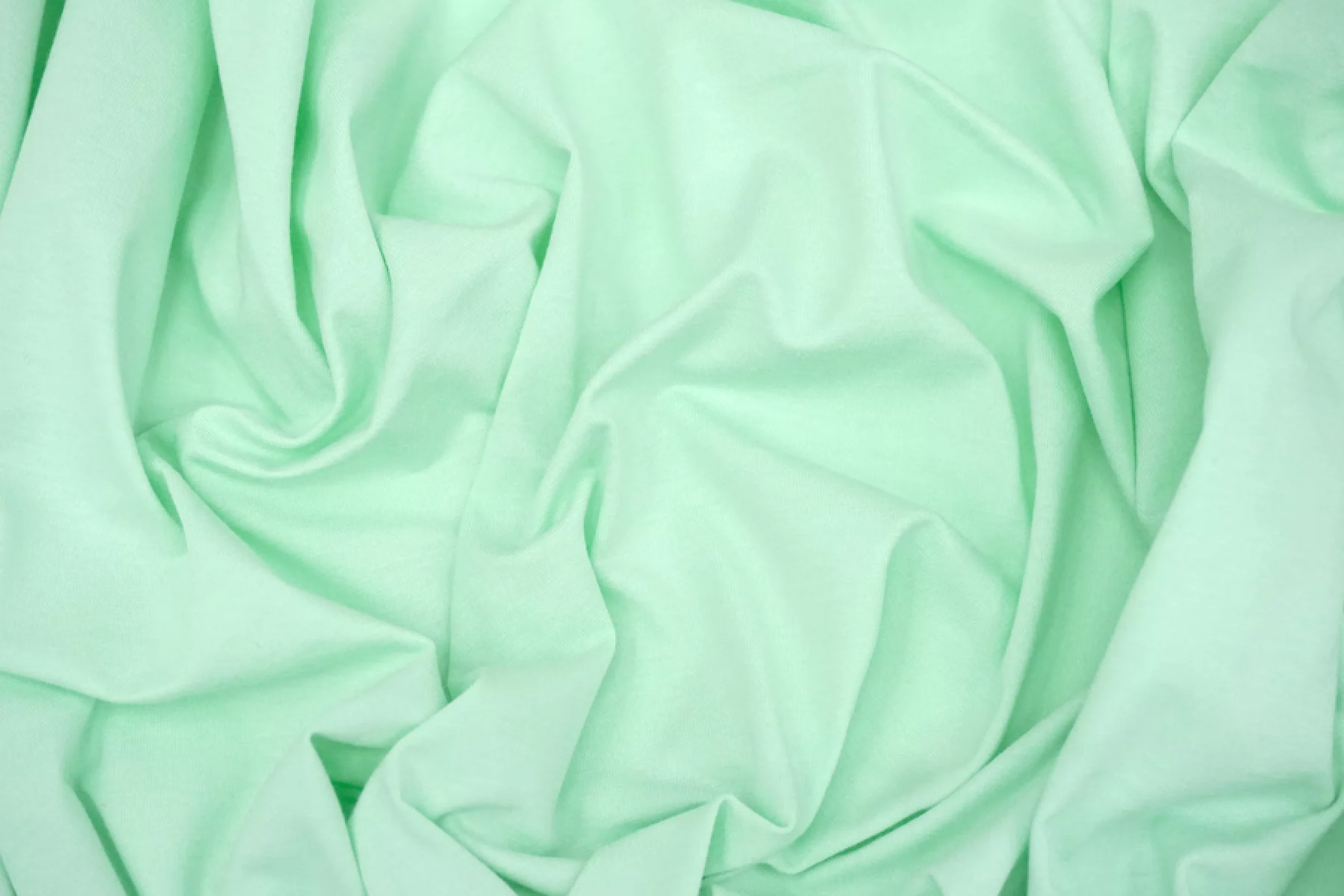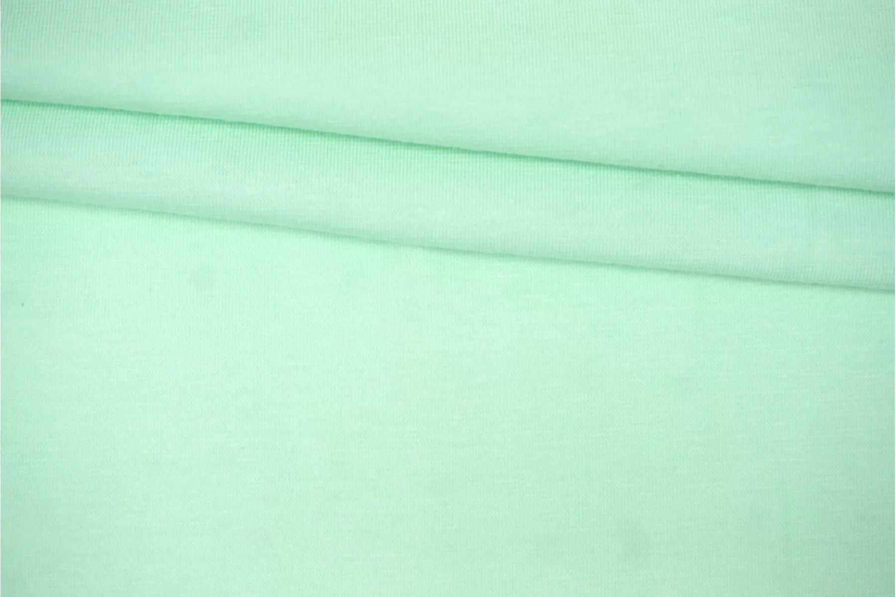 Хлопковый трикотаж, кулирная гладь, мятного цвета. Материал тактильно приятный и мягкий, тонкий. Очень хорошо тянется. Пластичный. Просвечивает при растяжении. Выглядит свежо. Отлично драпируется. Шьем майки, футболки, платья, туники и домашнюю одежду.