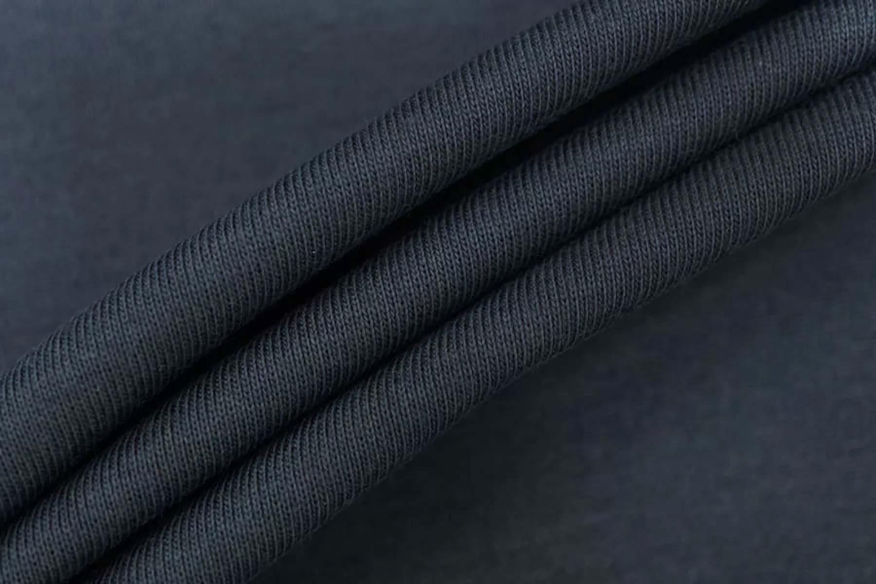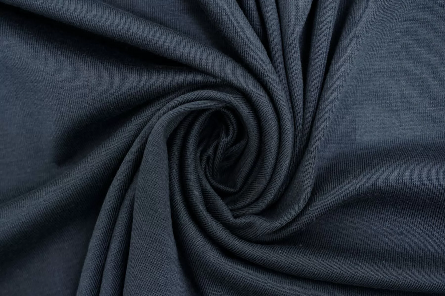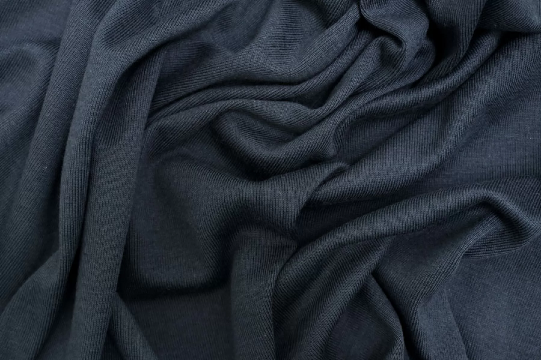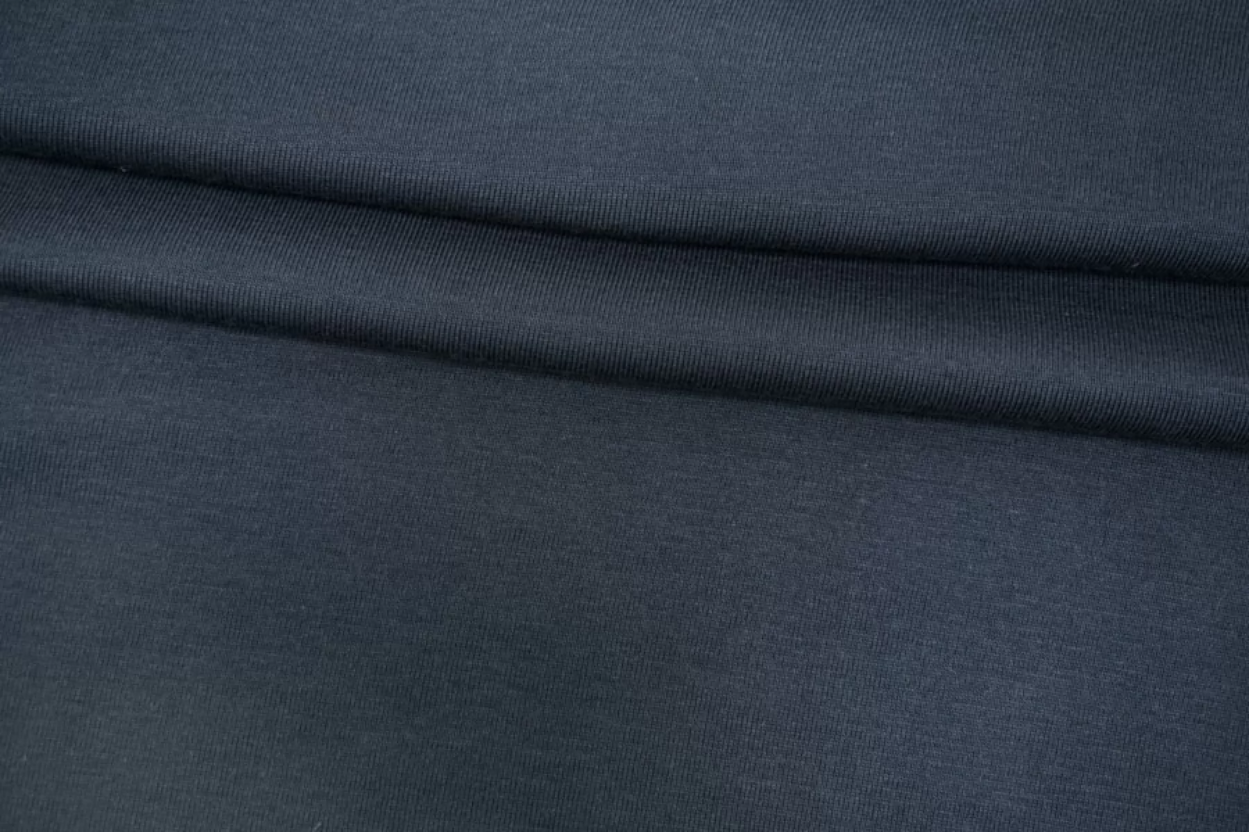 Итальянский хлопковый трикотаж в тёмно-сером цвете, по вязке ближе к рибане. Есть синеватый подтон. Материал пластичный, мягкий, гладкий, очень приятный к телу. Плотный, но тонкий. Немного просвечивает. Практически не мнется. Отлично тянется. Подойдет для пошива майки, футболки, топа.