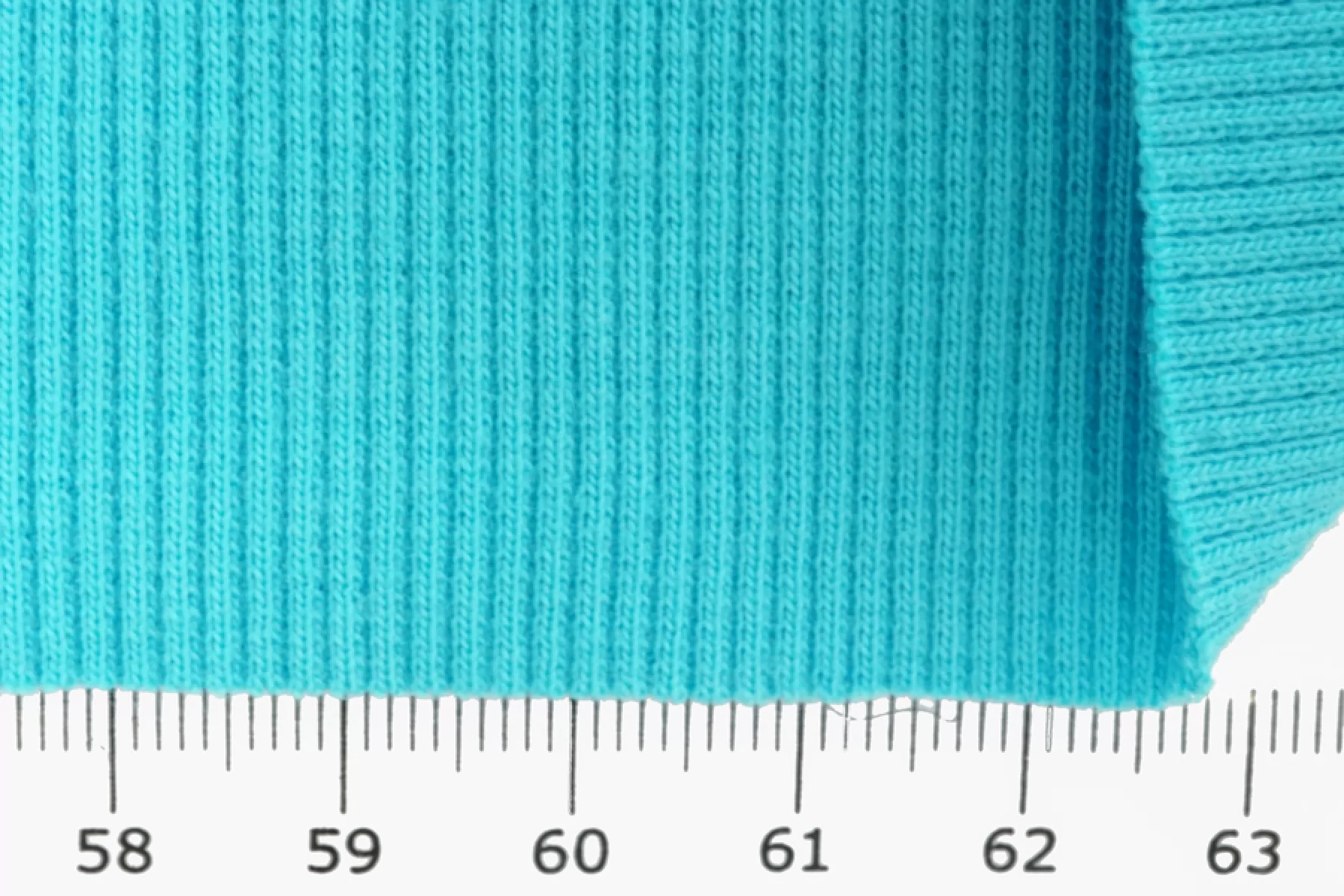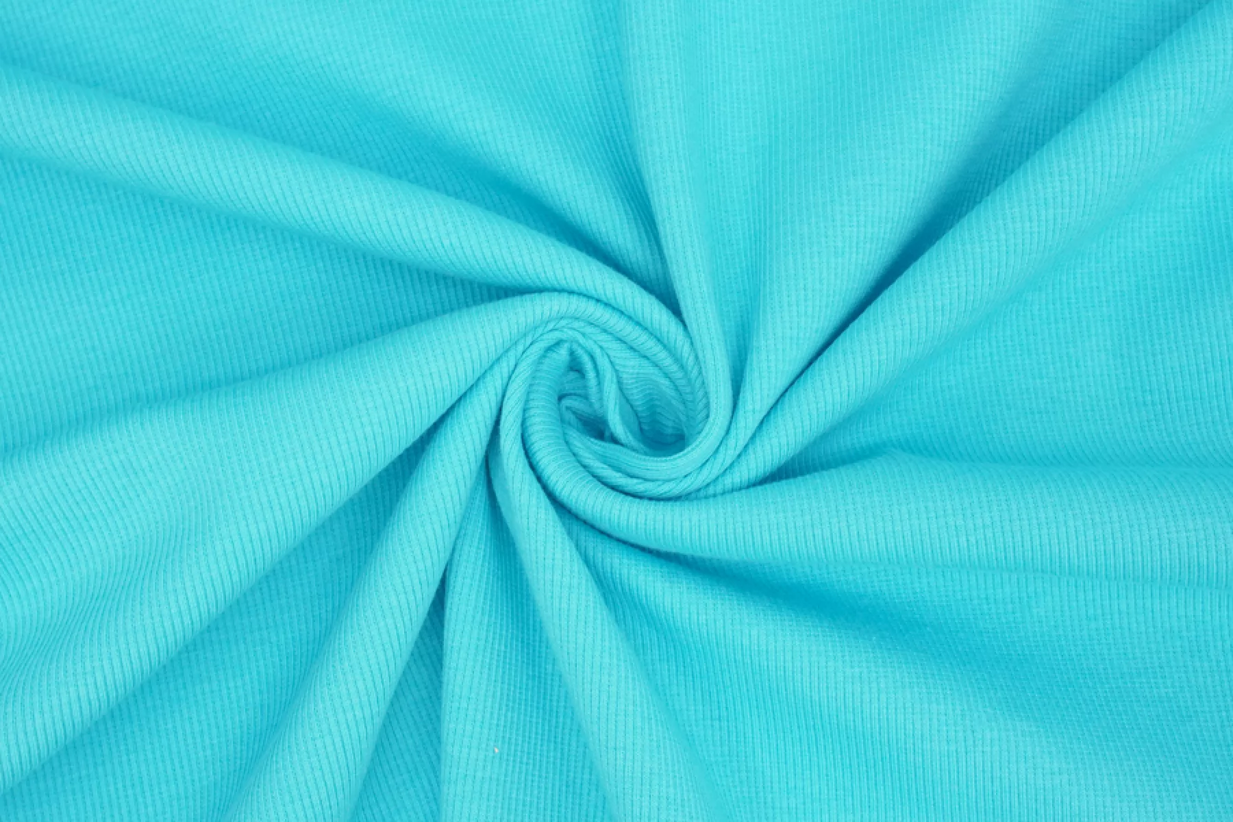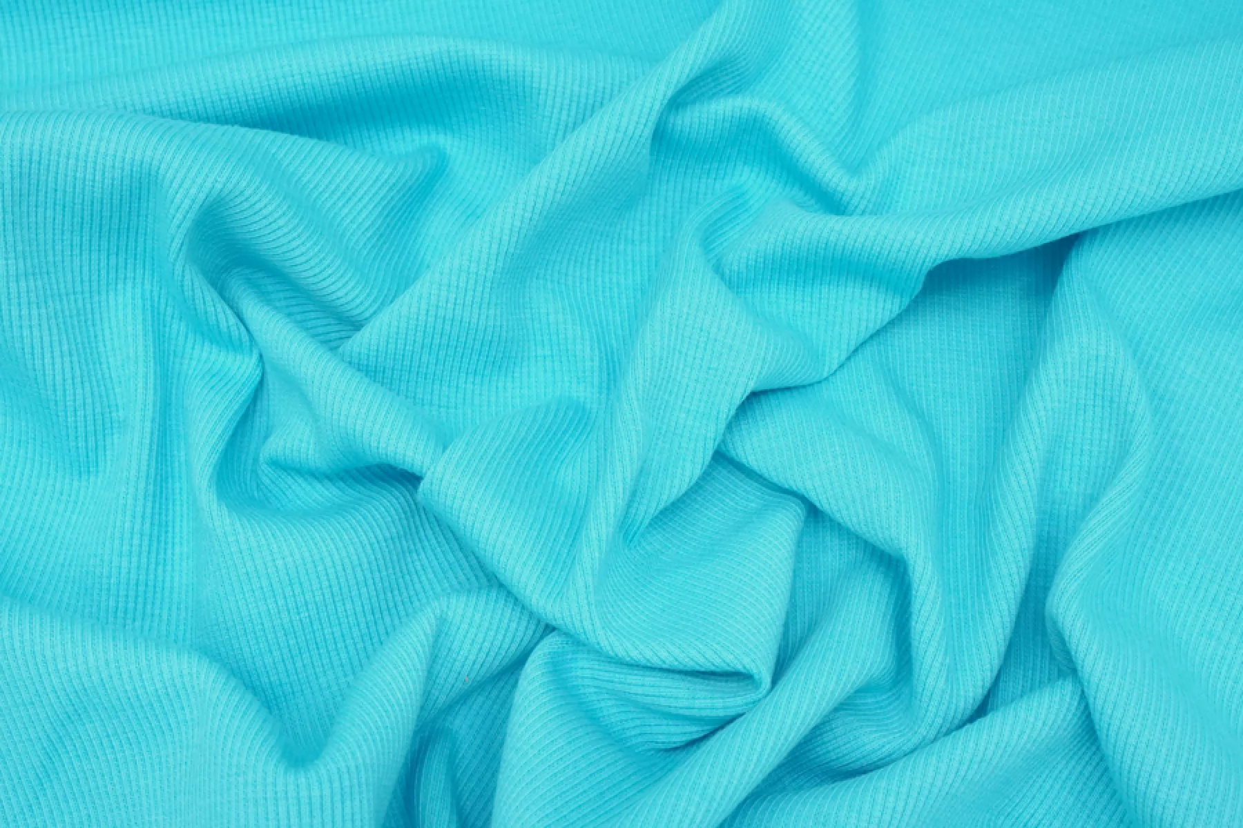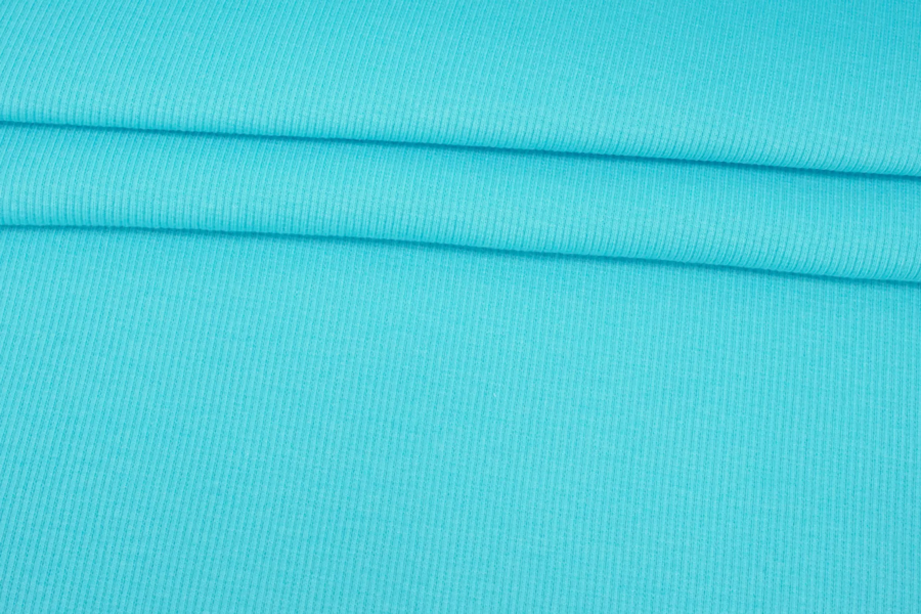 Мягкий хлопковый трикотаж кашкорсе очень красивого голубого оттенка. Мягкий и приятный, с легким лоском. Эластичный и пластичный. Отлично тянется за счет плетения и небольшого содержания эластана. Слегка просвечивает при растяжении. Форму не держит. Сминается, но восстанавливается. Прекрасно подойдет на майки, топы, водолазки и кофты, свободные платья, детские изделия, а также на обработку манжет и горловин.