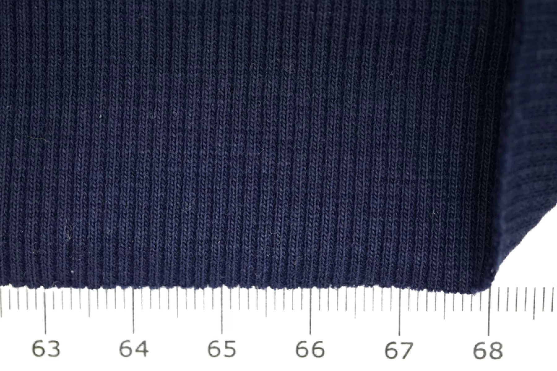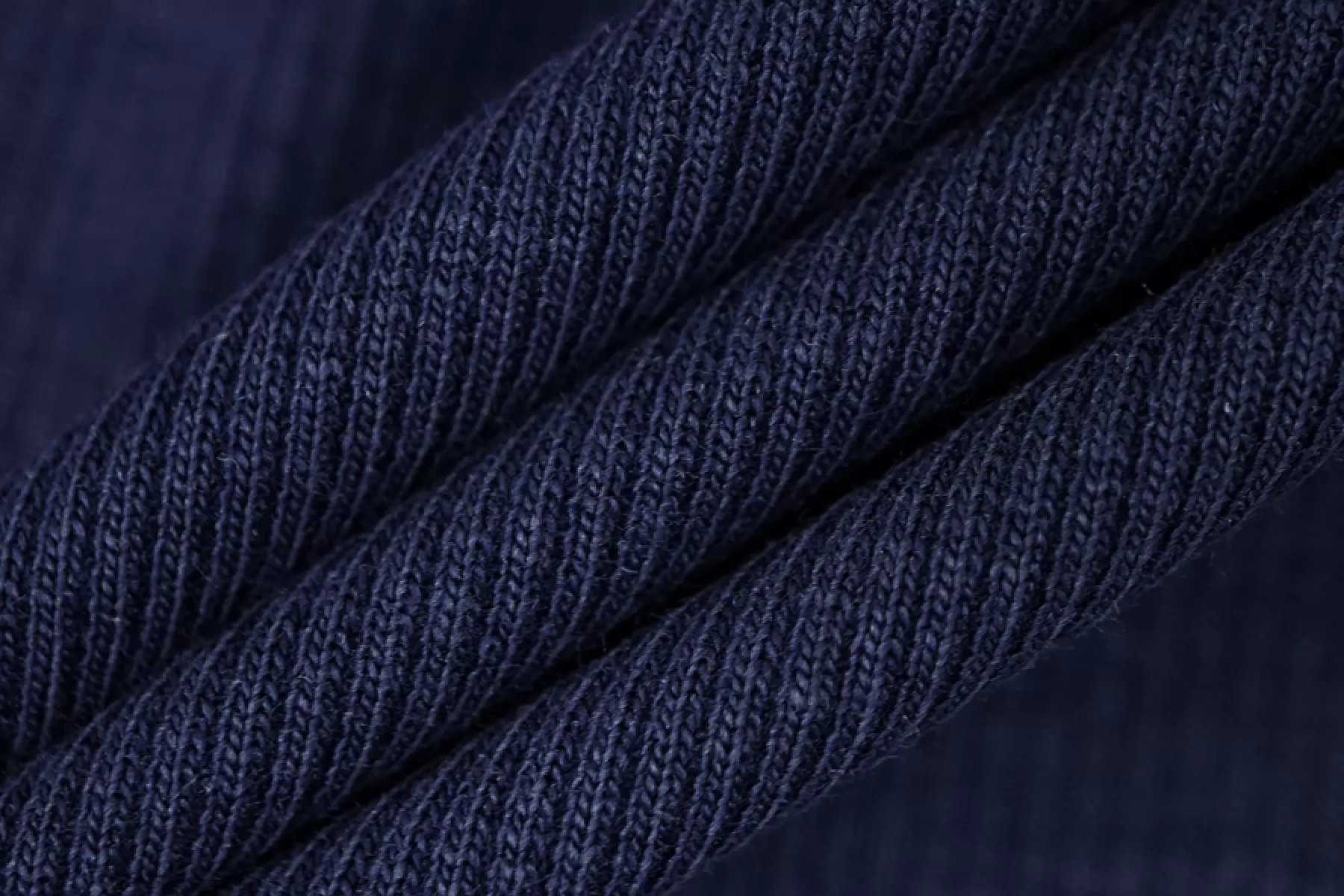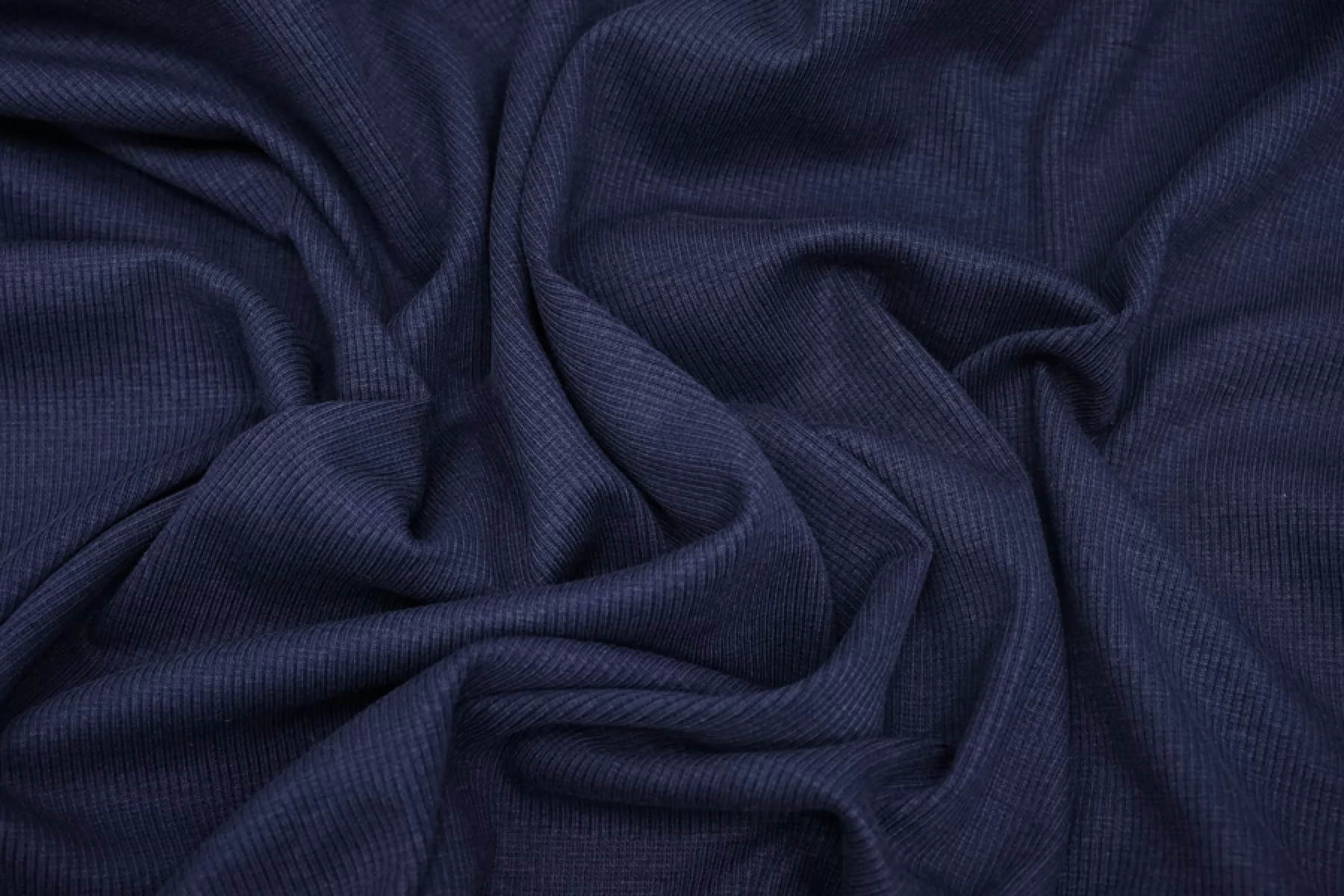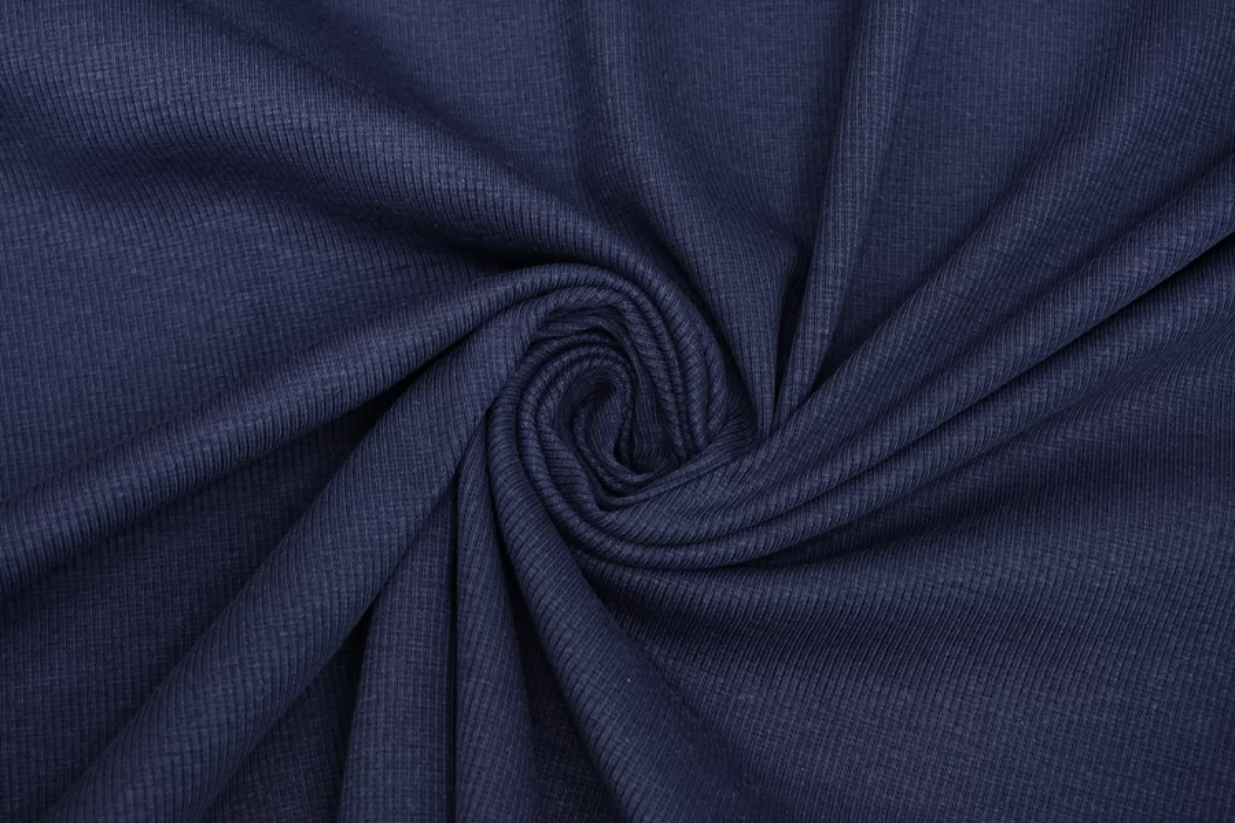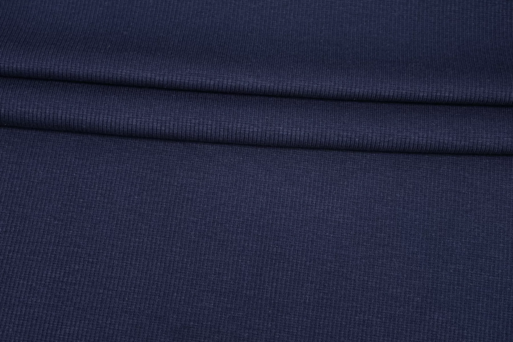 Хлопковый трикотаж кашкорсе в темно-синем оттенке. Эластичный и пластичный. Плотненький. Отлично и слегка упруго тянется за счет плетения и эластана. Слегка просвечивает силуэт при растяжении. Форму не держит. Сминается, но восстанавливается. Отличный вариант на майки, топы, водолазки, платья, юбки и кофты, а также подойдет для детской одежды.