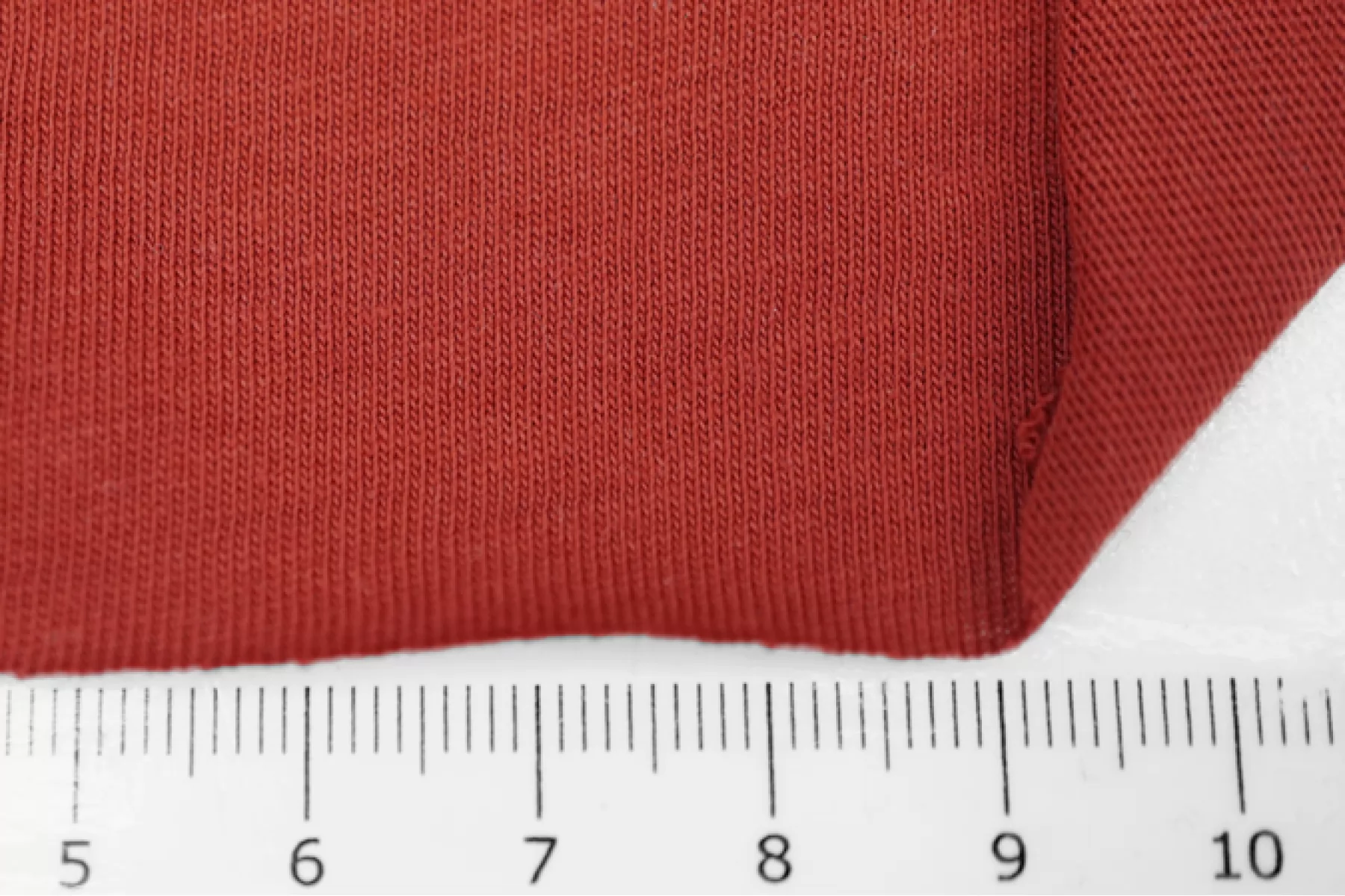 Хлопковый трикотаж, кулирная гладь, оттенка брусники. Материал тактильно приятный, очень мягкий. Просвечивает силуэт на просвет. Ткань пластичная, неплохо тянется. Отлично драпируется, красива в складках. Шьем майки, футболки, платья, туники и домашнюю одежду.