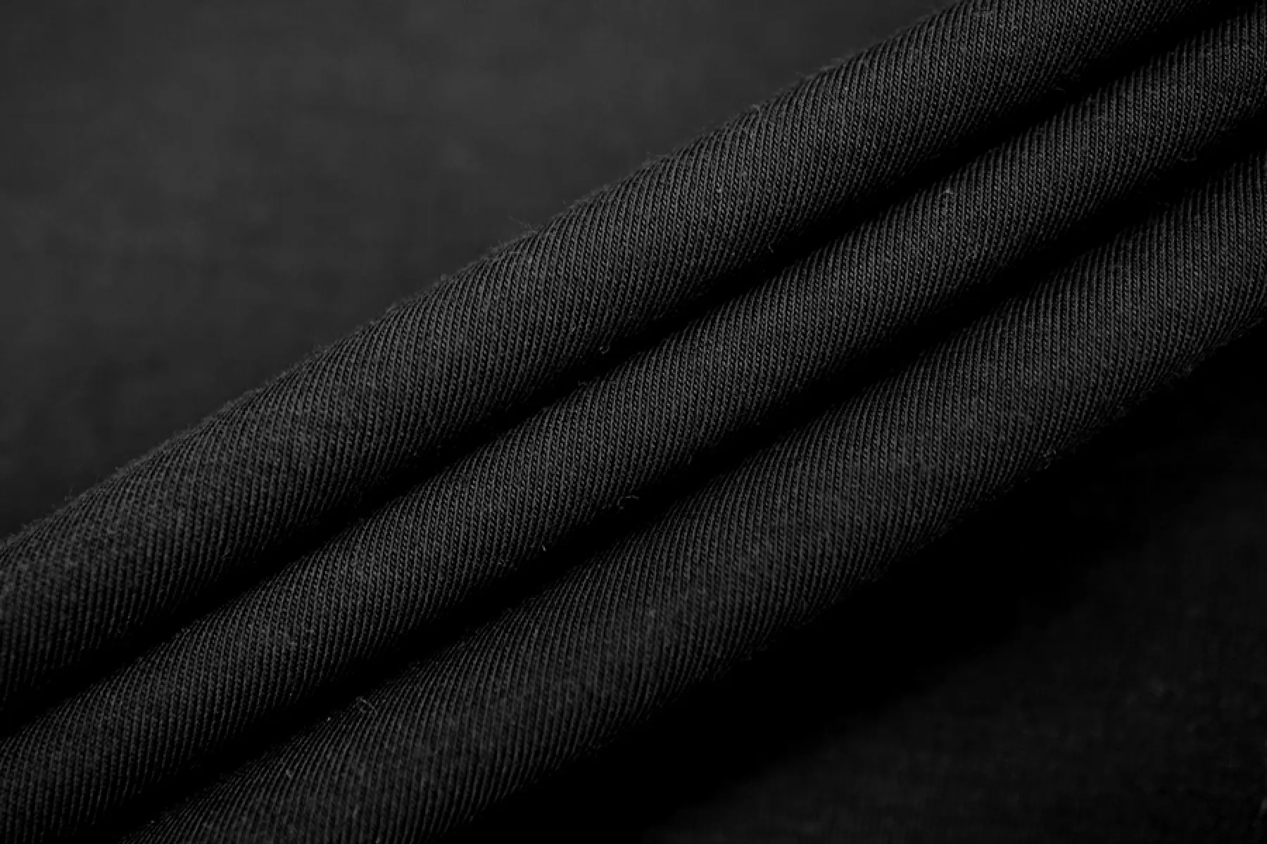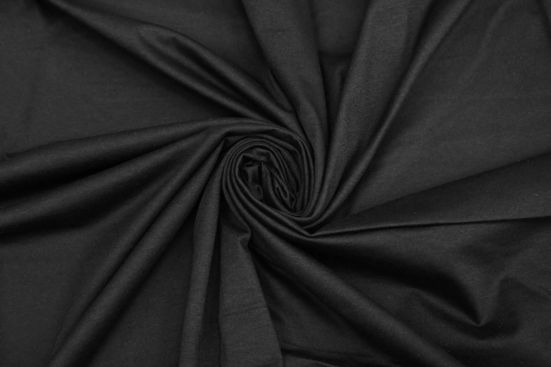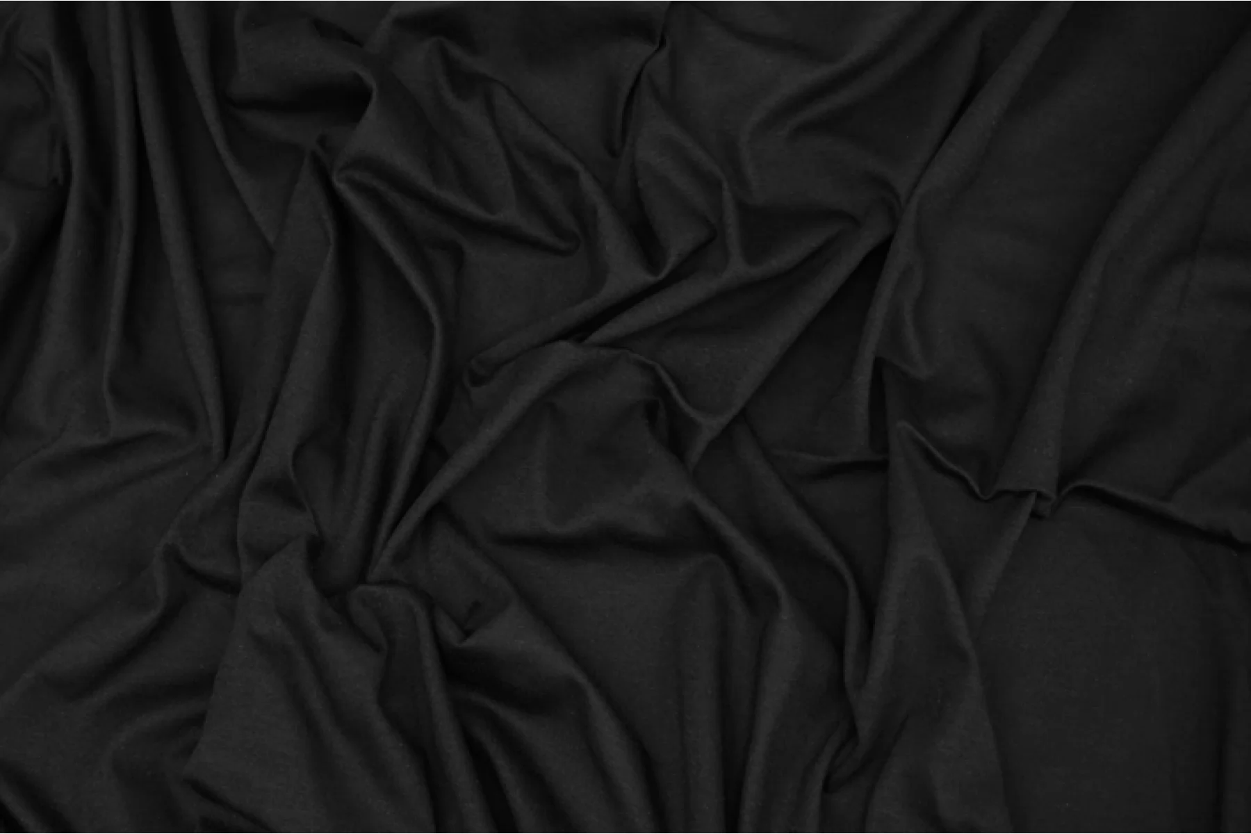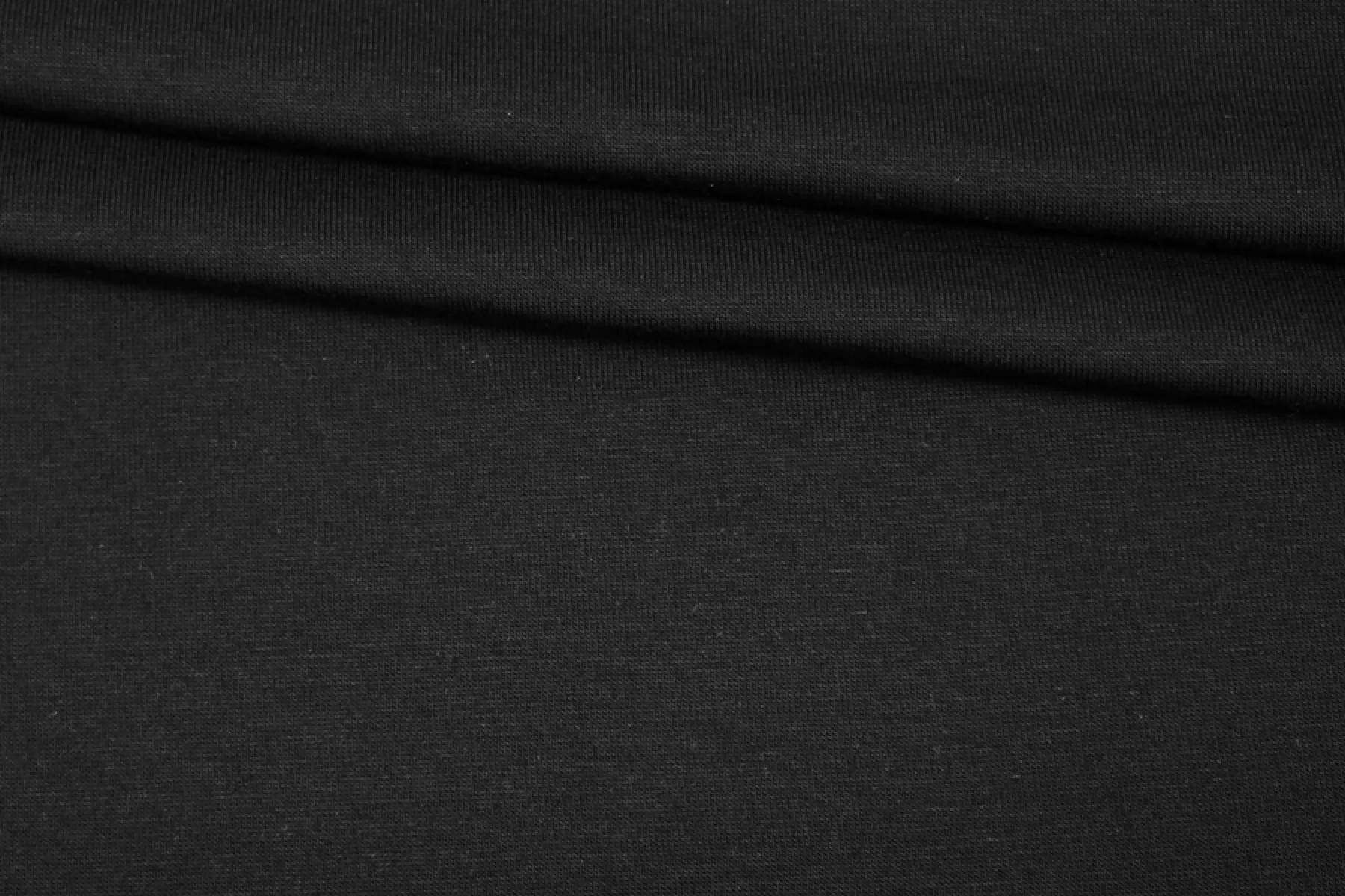 Хлопковый трикотаж классического черного цвета, кулирная гладь. Материал тактильно плотненький, приятный. Слегка просвечивает силуэт на просвет. Немного мнется, но восстанавливается. Ткань пластичная, с легким лоском, немного тянется за счет плетения. Подойдет на майки, футболки, платья и домашнюю одежду.