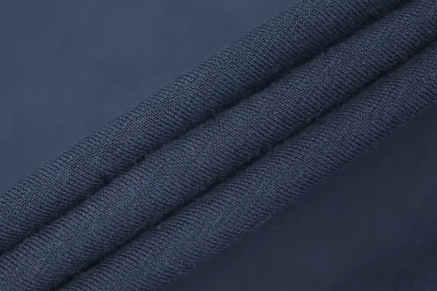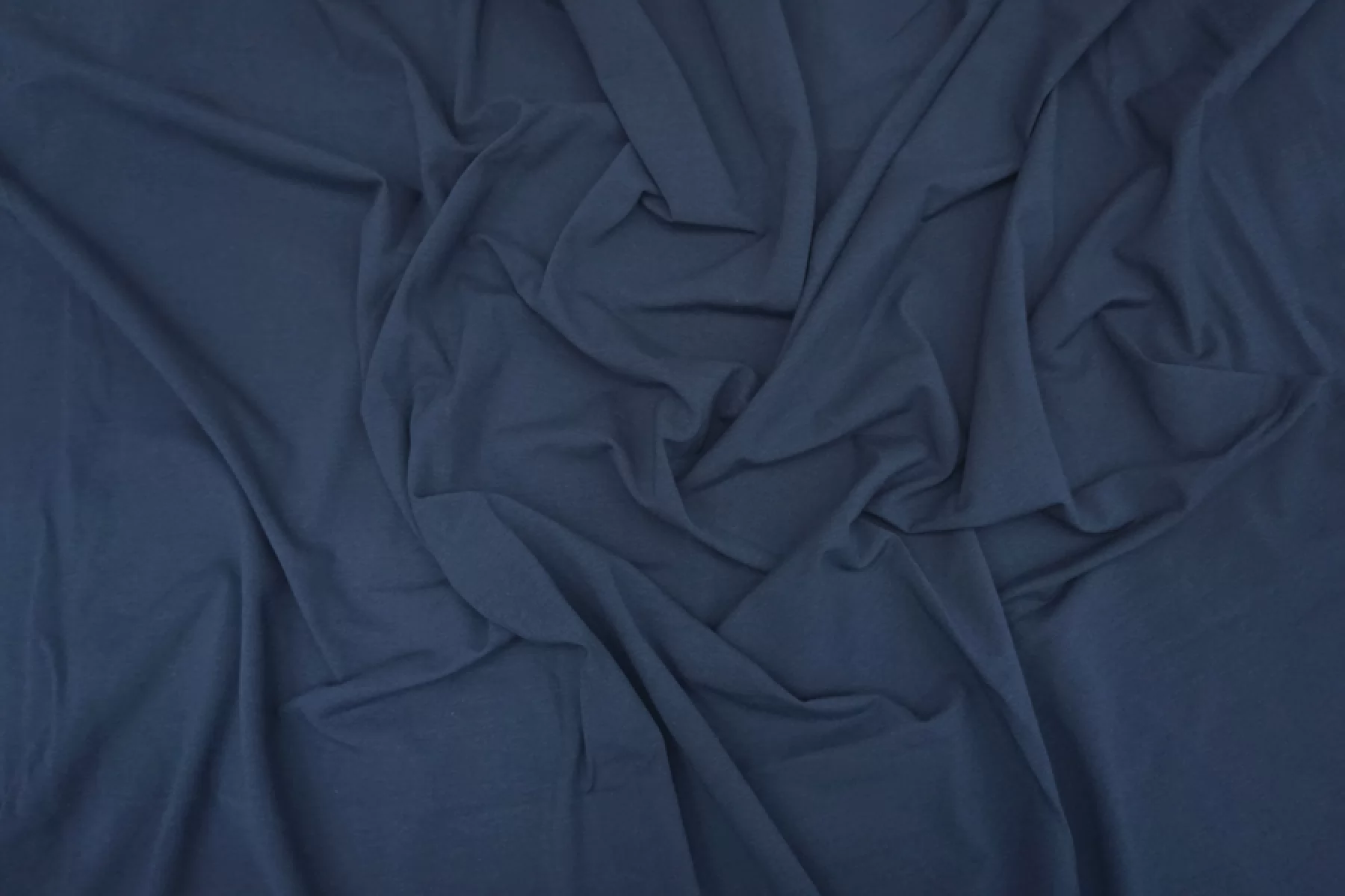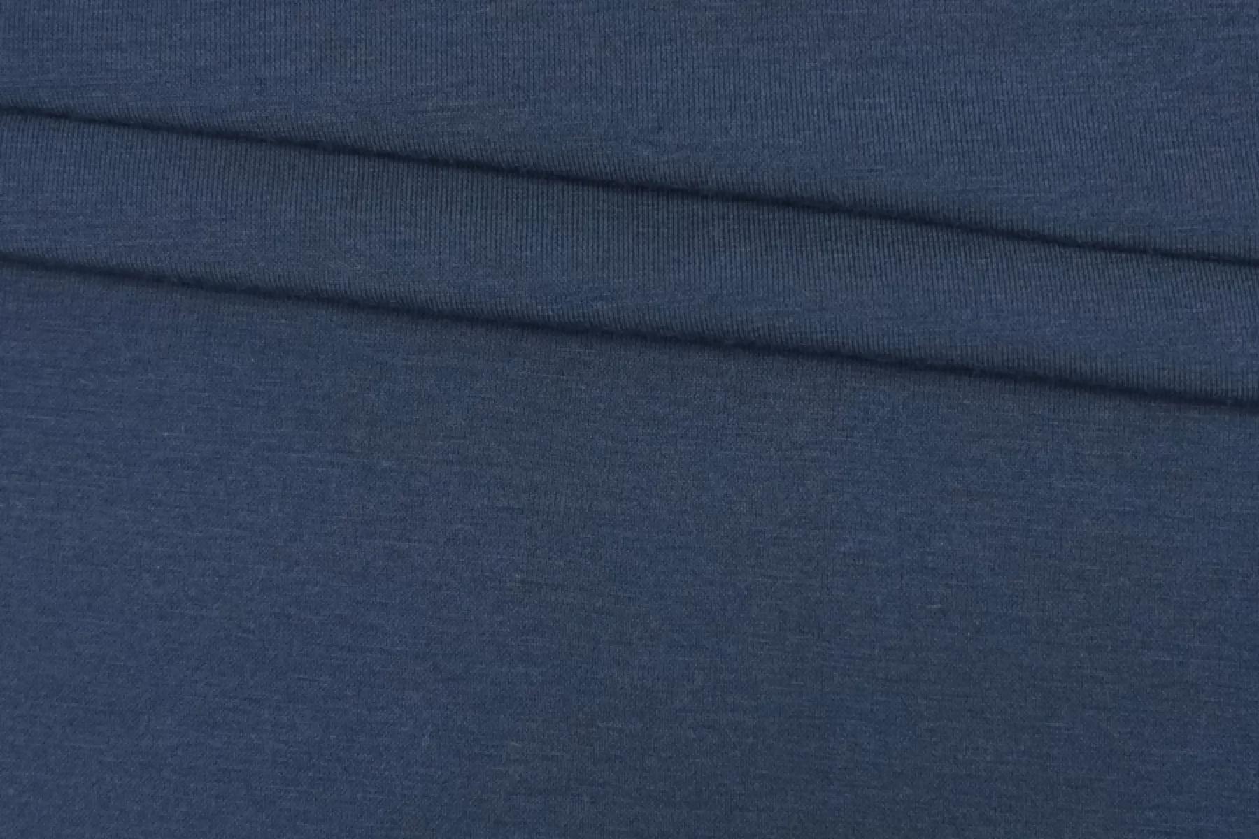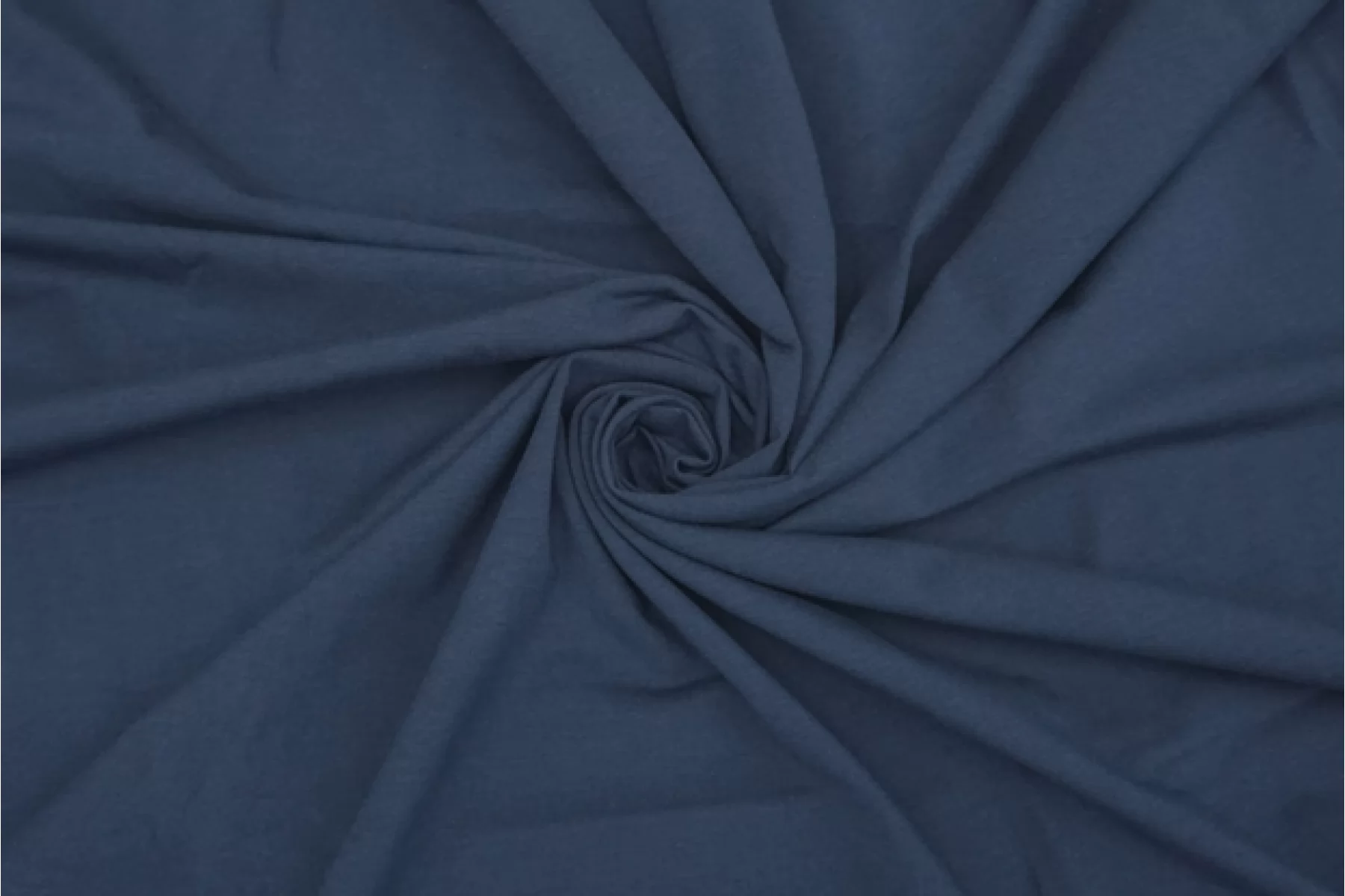 Хлопковый трикотаж, кулирная гладь, припыленно-синего оттенка. Материал тактильно приятный, мягкий. Просвечивает только при растяжении. Ткань пластичная, очень хорошо тянется. Отлично драпируется, красива в складках. Шьем майки, футболки, платья, туники и домашнюю одежду.