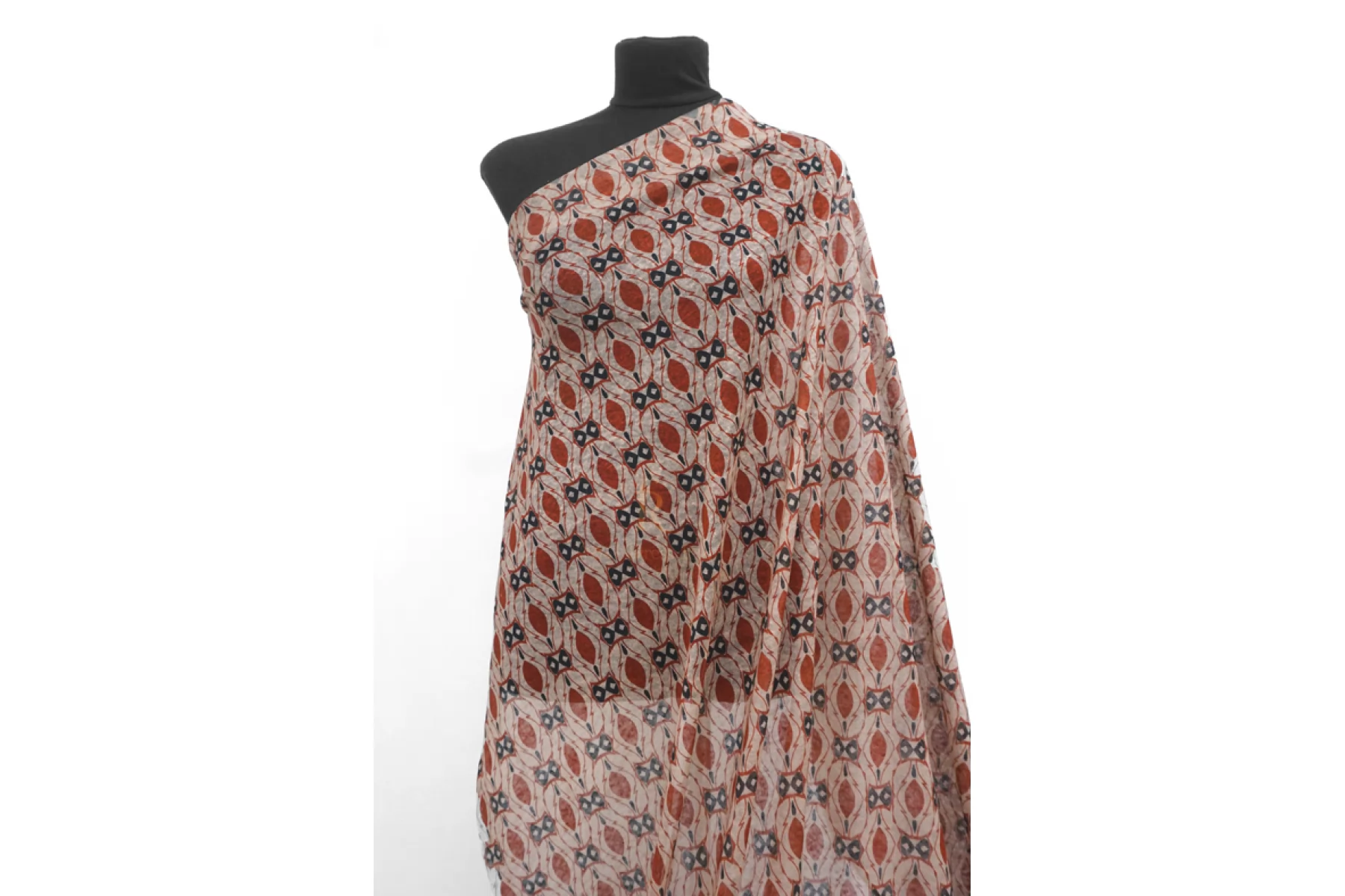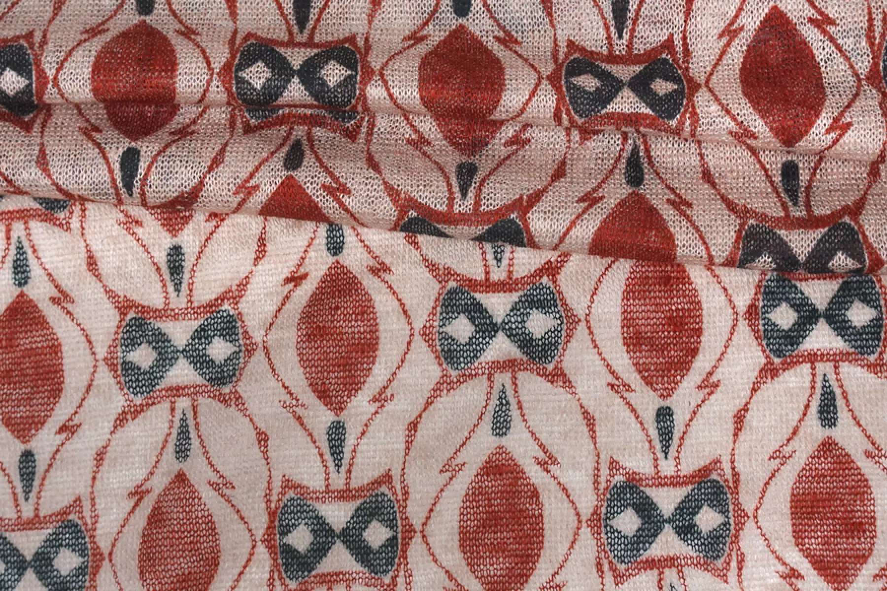 Льняной трикотаж - кулирная гладь с принтом в виде абстракции напоминающей сов. Необычный цвет приглушенно бежево-розовый с кирпичным контуром узора и черными "глазами сов". Трикотаж довольно тонкий и сильно просвечивает, пластичный. Подойдет для пошива майки, футболки, топа, платья, юбки (с подкладом).