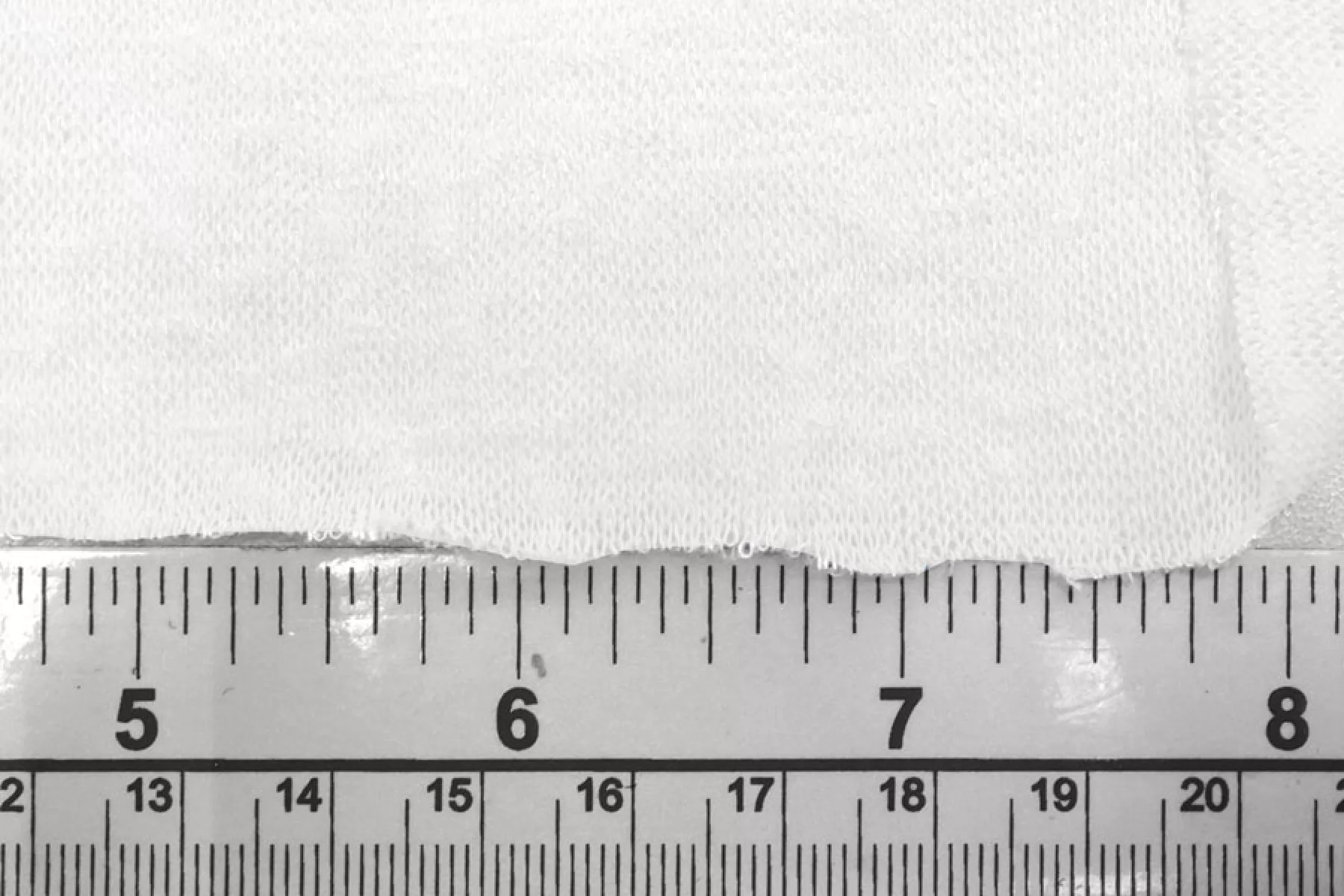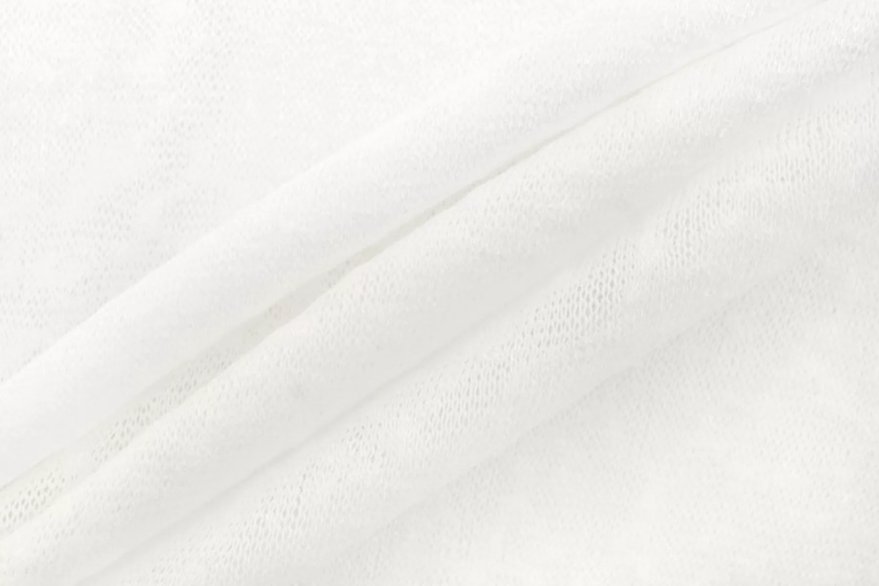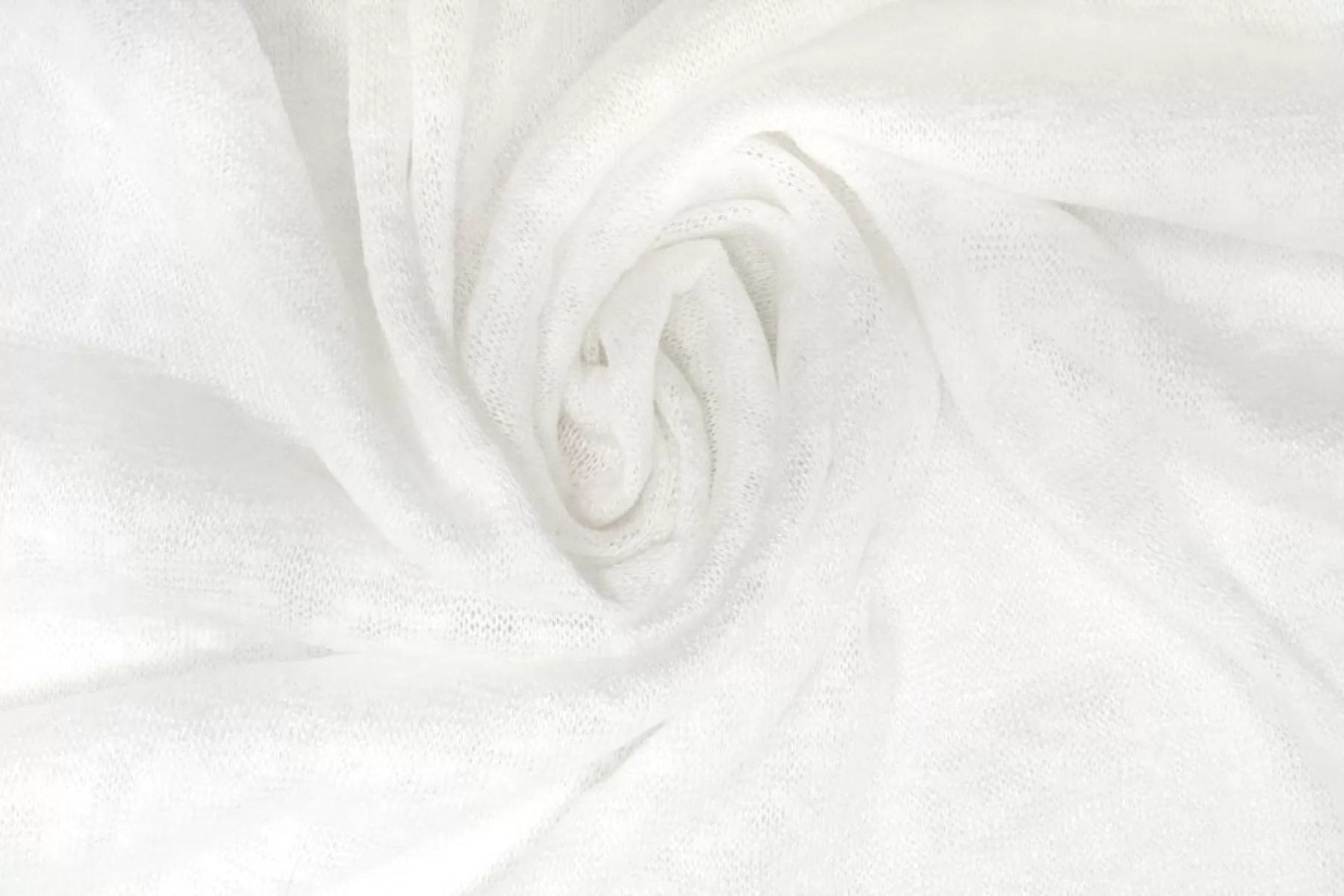 Прекрасный льняной трикотаж с добавлением ацетата в белом цвете. Есть некая фактура, ощущается тактильно. С красивым блеском. Тактильно немножко жестковатый с лицевой стороны, с изнанки мягкий и приятный. Тонкий. Просвечивает. Практически не мнется. Пластичный. Тянется благодаря плетению. Подойдет для пошива майки, футболки, топа, платья, юбки (учитывайте, что просвечивает).