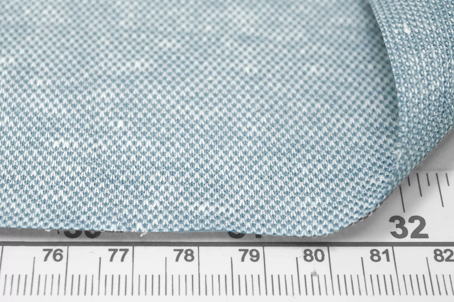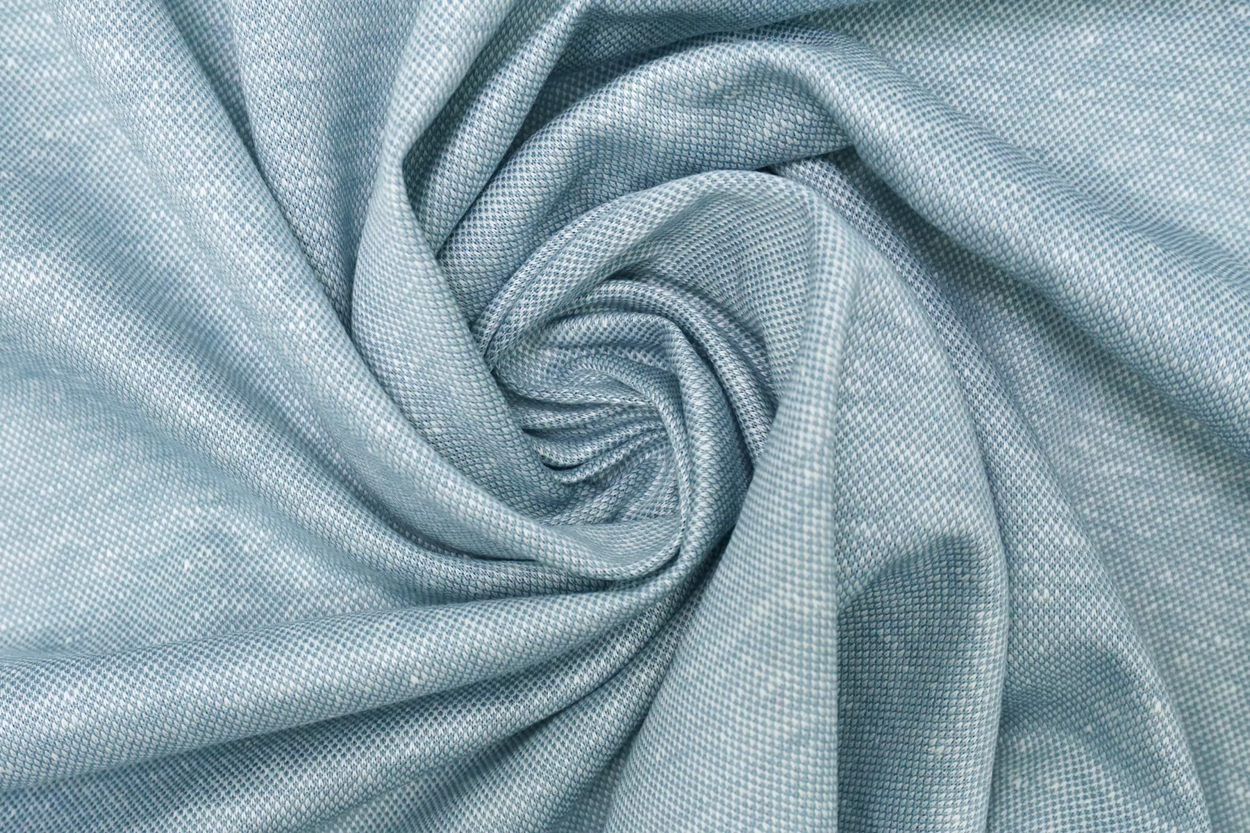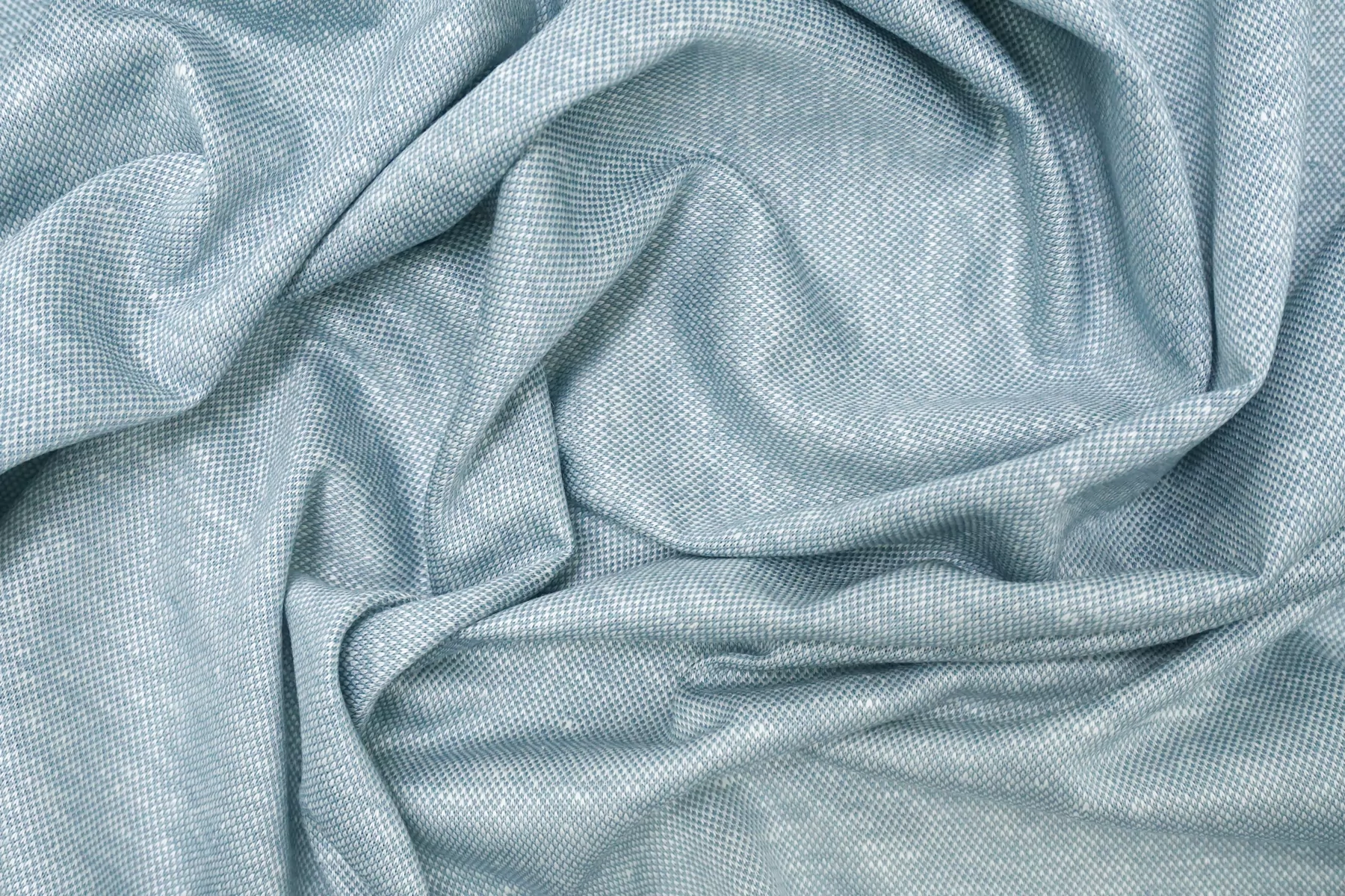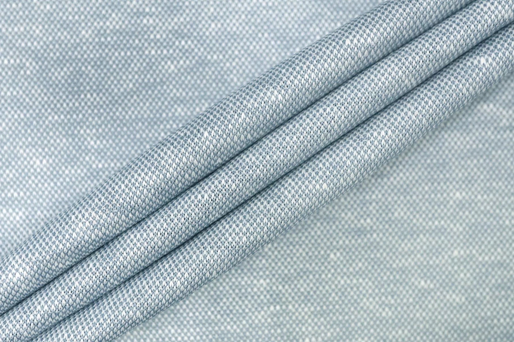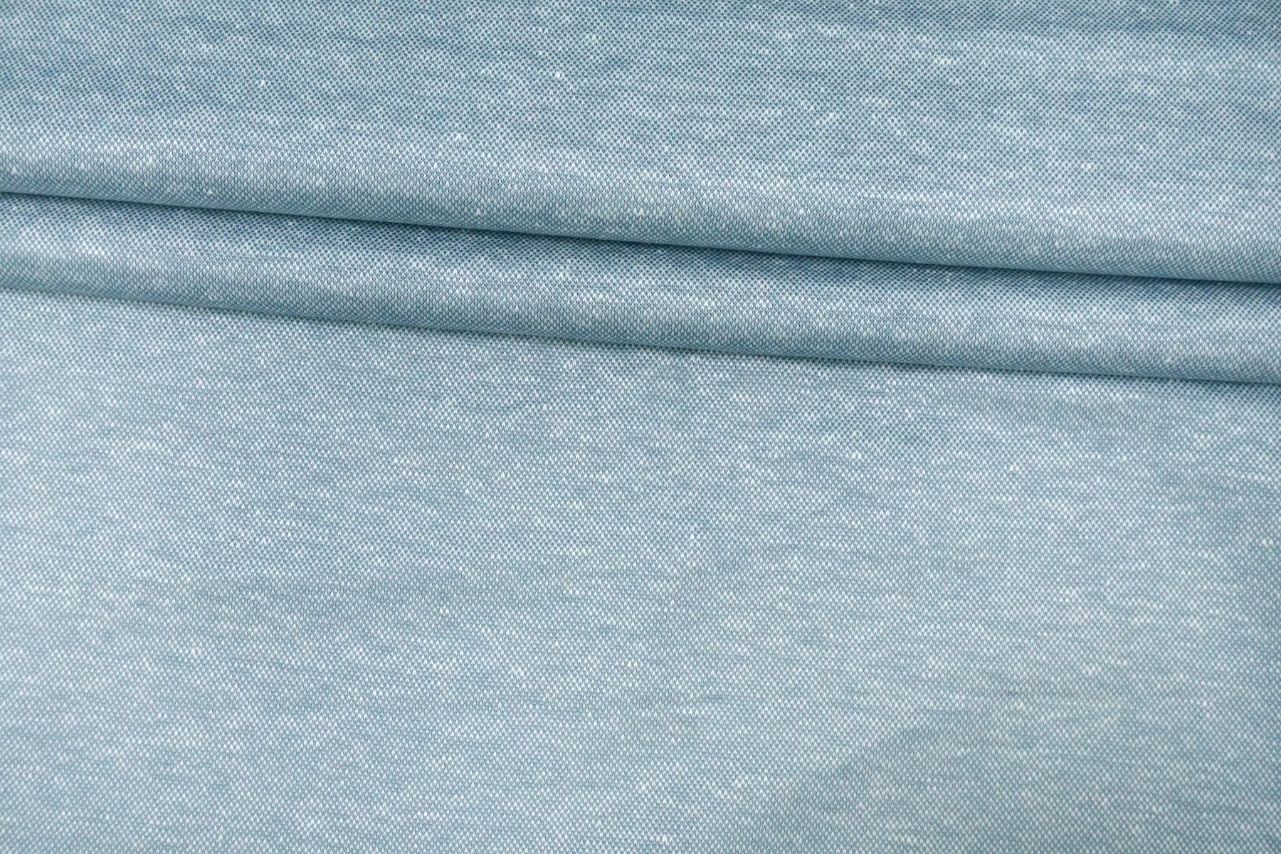 Трикотаж пике из льна с добавкой хлопка, нити голубого и белого цвета. Материал суховатый, ощущается фактура плетения, средней плотности. Немного просвечивает в один слой. Немного тянется благодаря плетению. Материал пластичный, хорошо драпируется и умеренно держит форму. Мнется умеренно. Идеальный вариант для пошива футболок-поло, платьев-футболок, шорт. Отличная ширина.