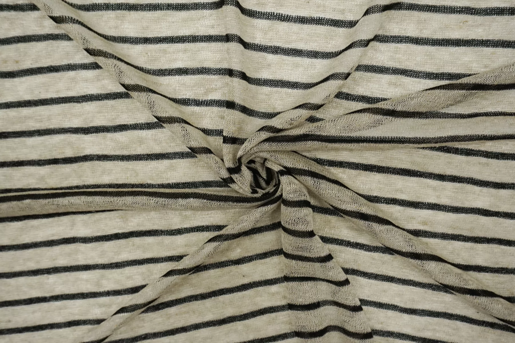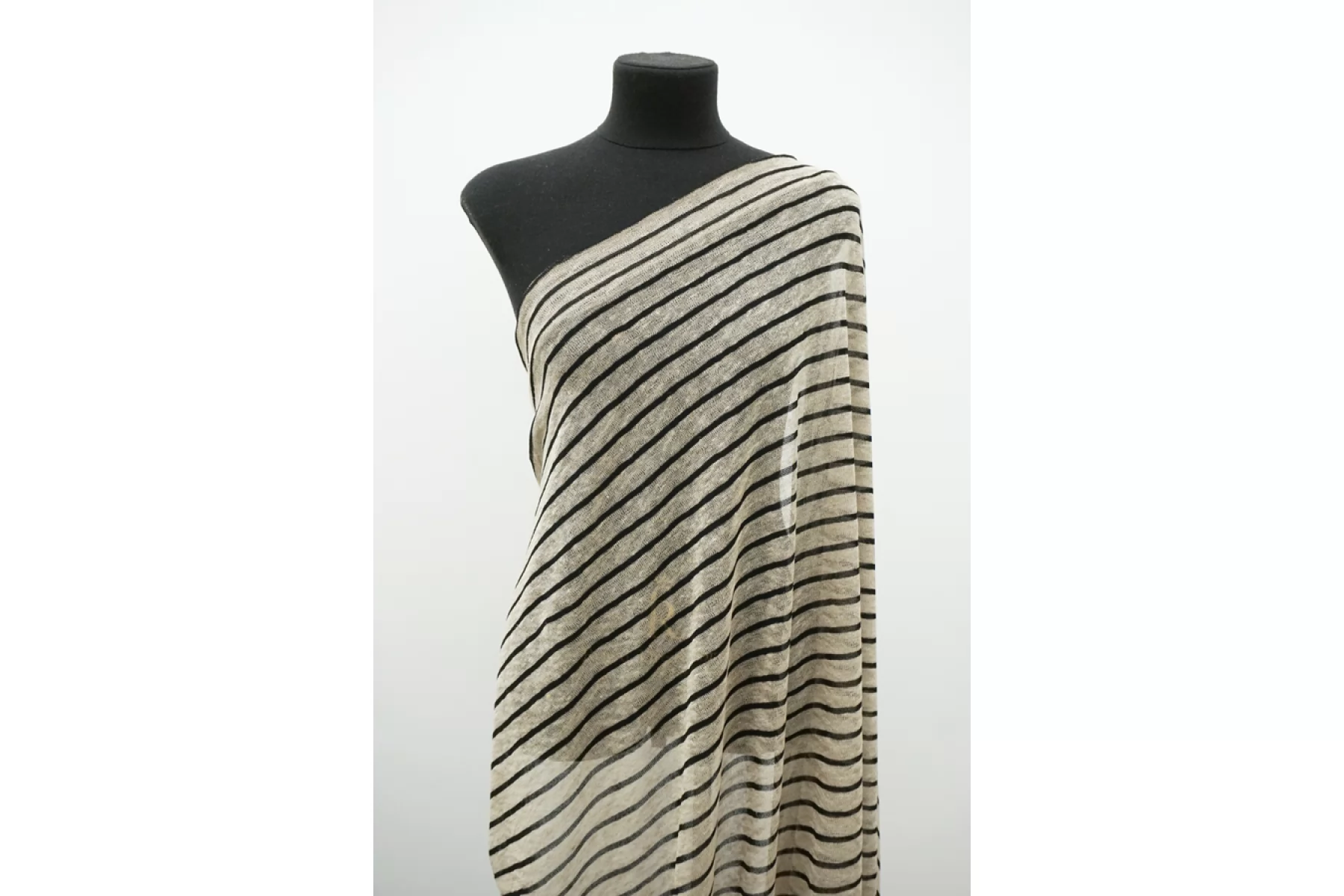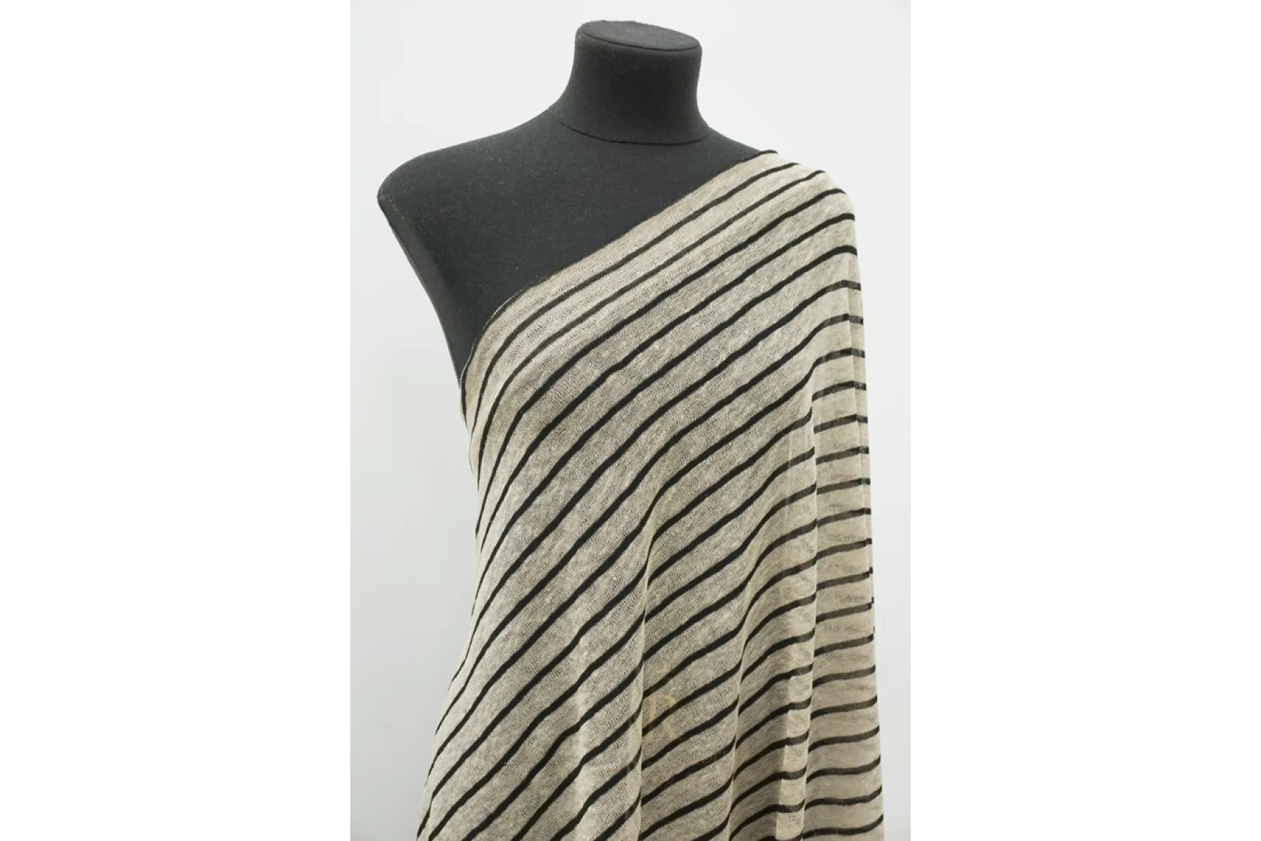 Льняной трикотаж - кулирная гладь. Узор-полоска черного и бежевого цвета, которая проходит поперек кромки. Трикотаж просвечивает, пластичный. Подойдет для пошива майки, футболки, топа, платья, юбки (учитывайте что просвечивает).