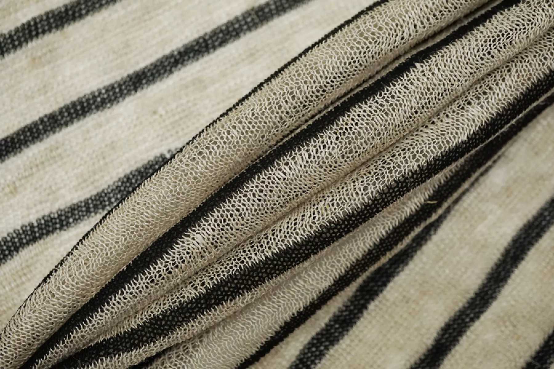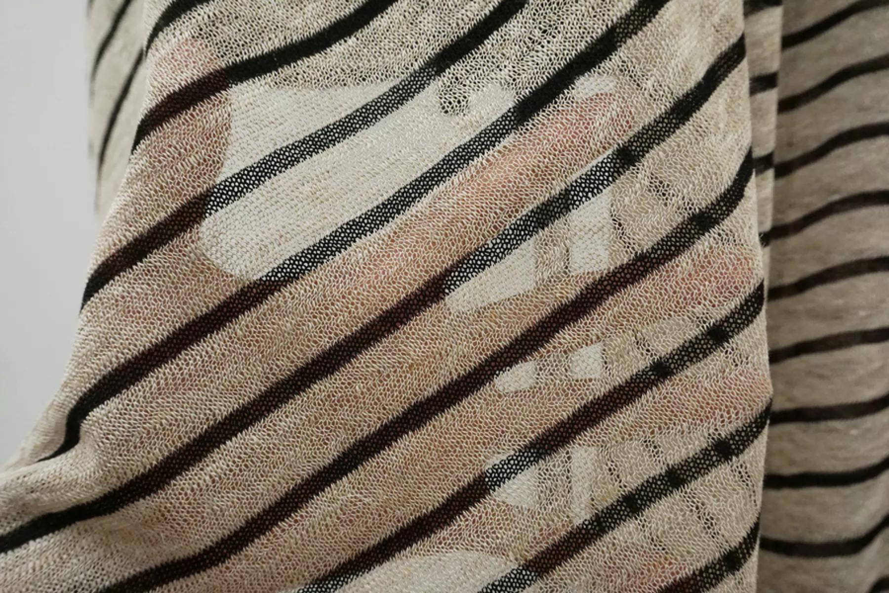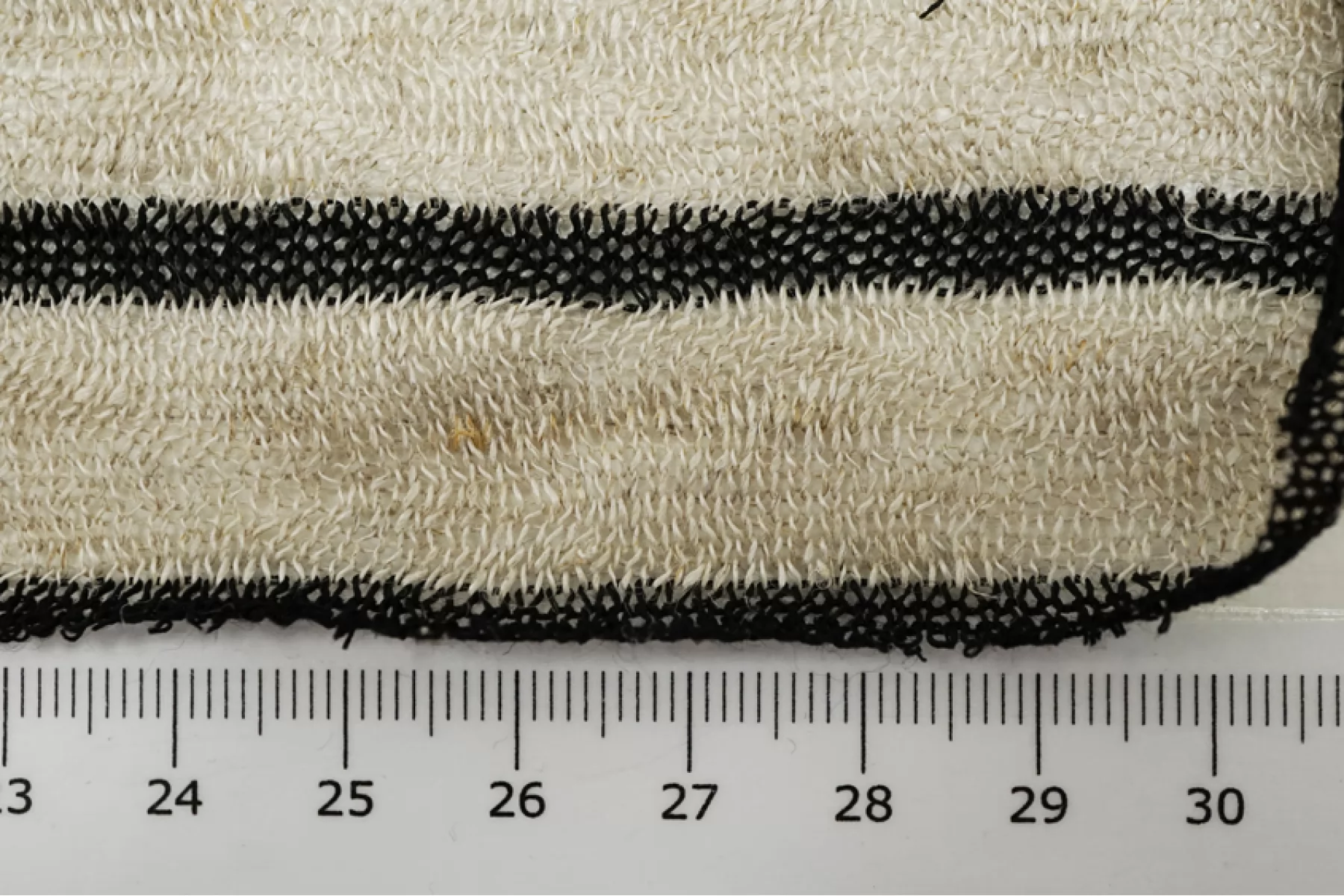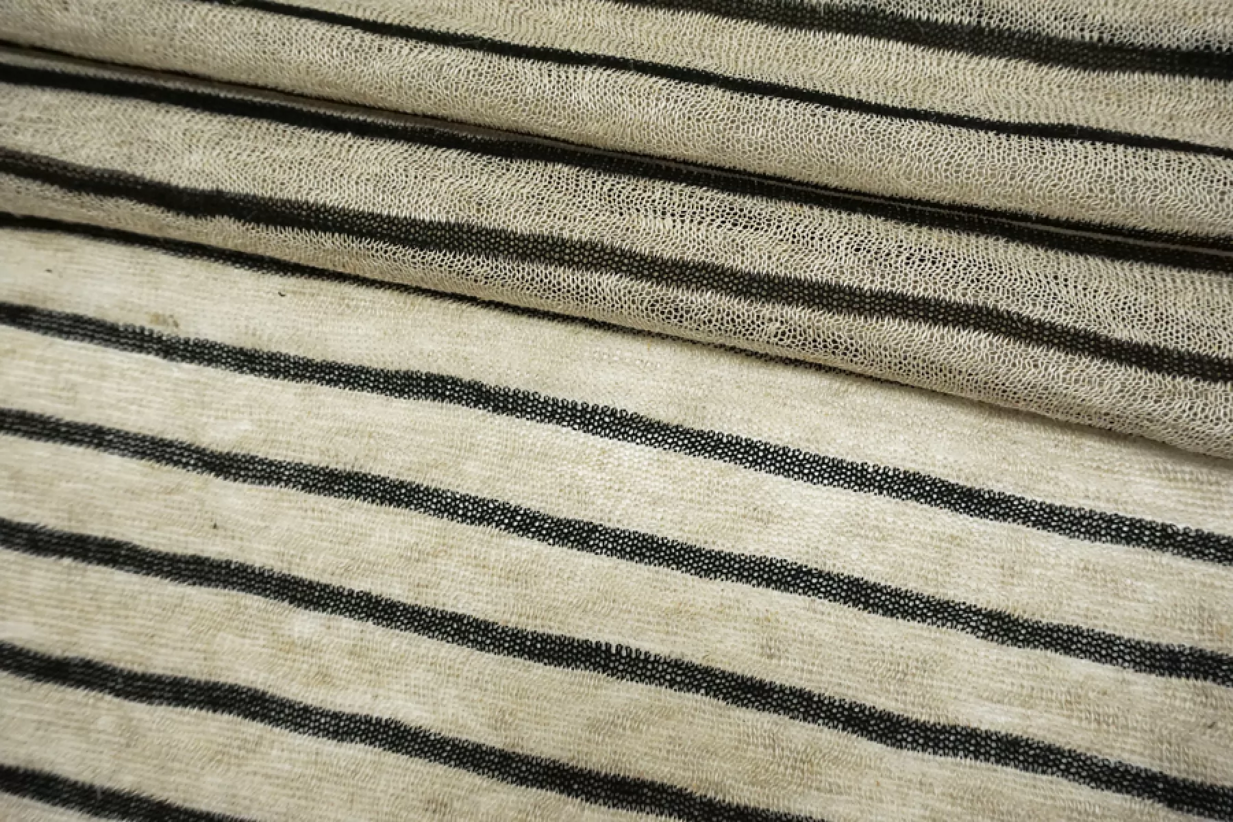 Льняной трикотаж - кулирная гладь. Узор-полоска черного и бежевого цвета, которая проходит поперек кромки. Трикотаж просвечивает, пластичный. Подойдет для пошива майки, футболки, топа, платья, юбки (учитывайте что просвечивает).