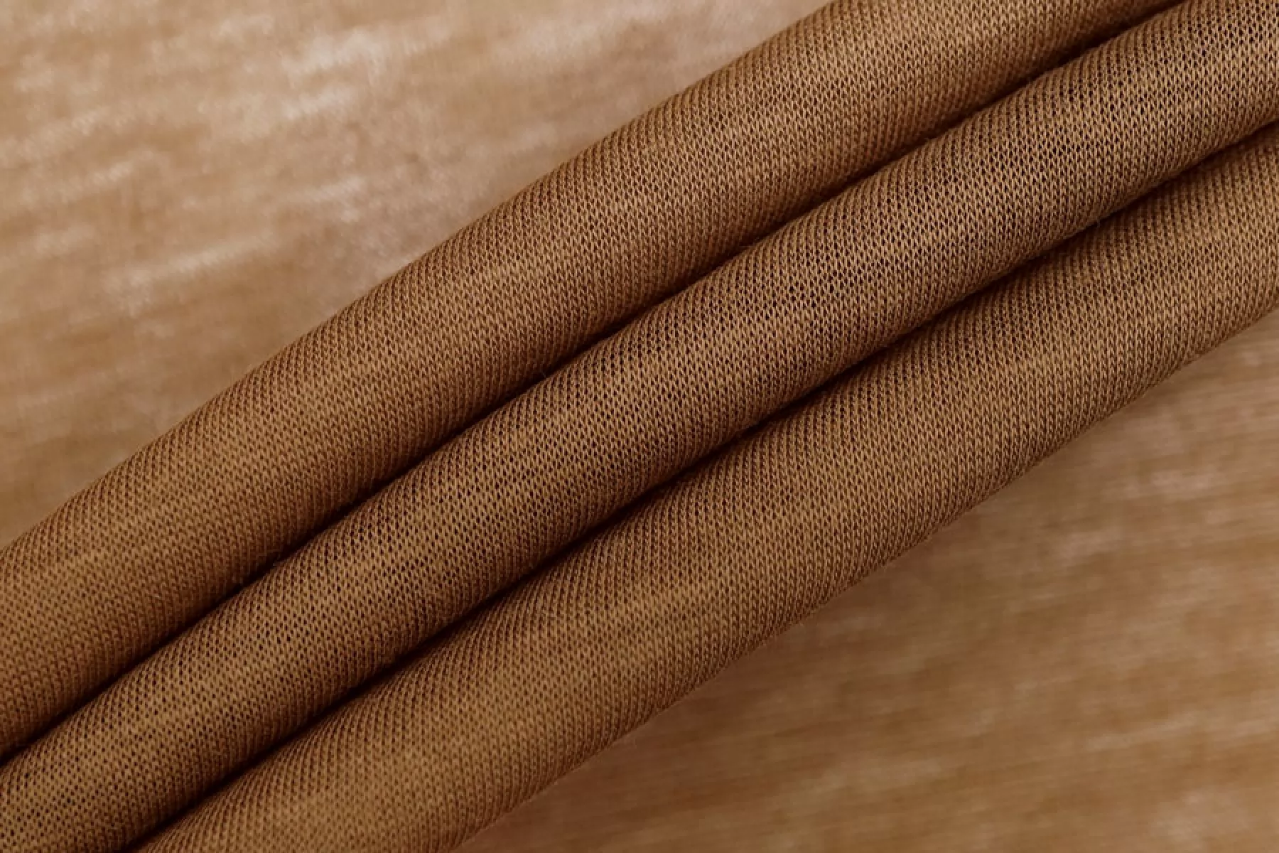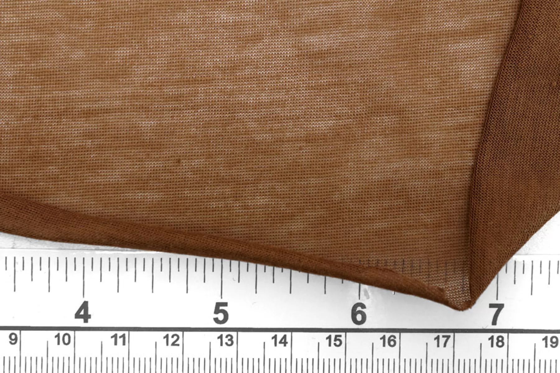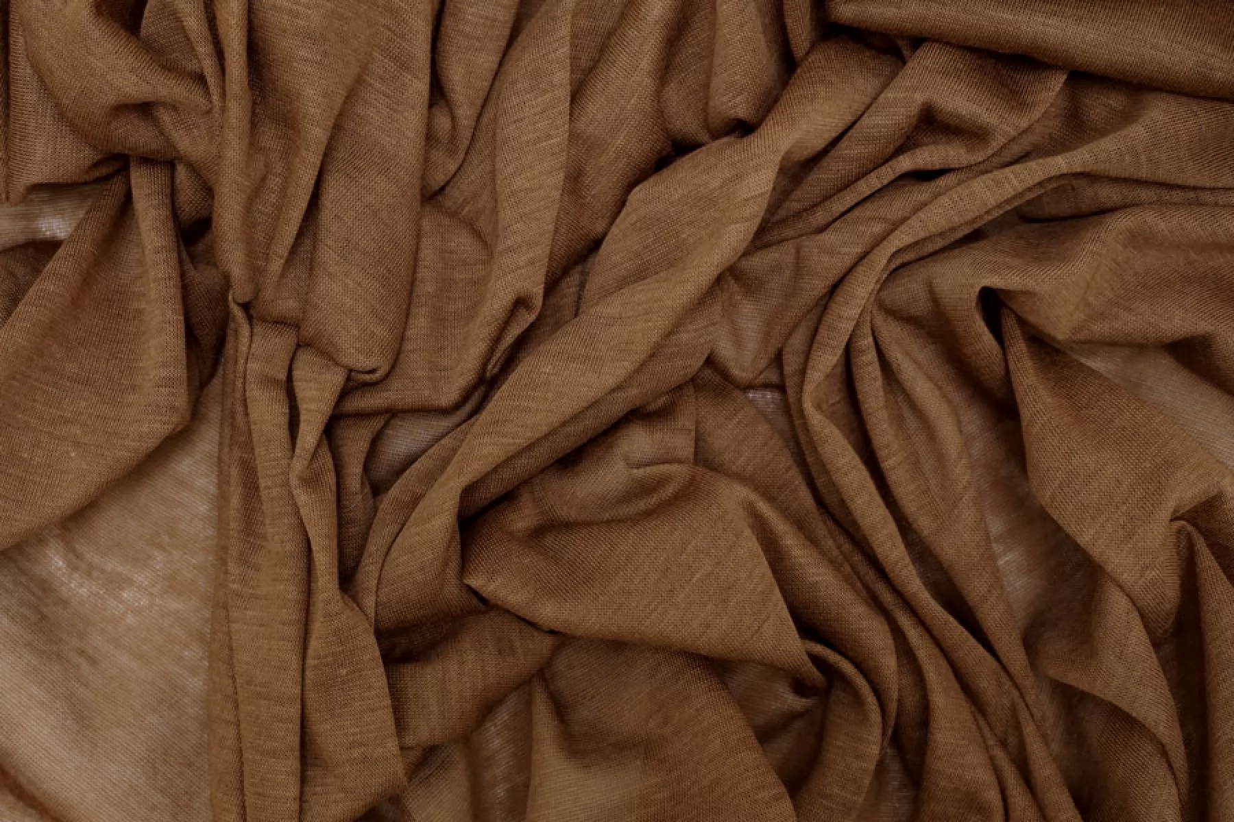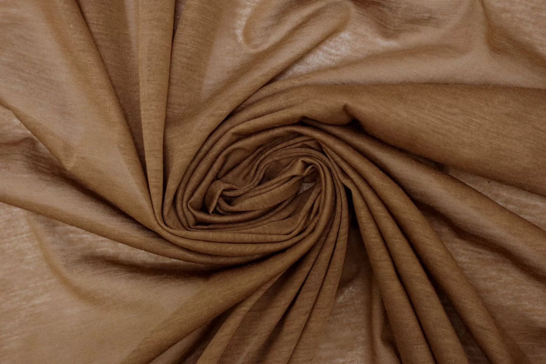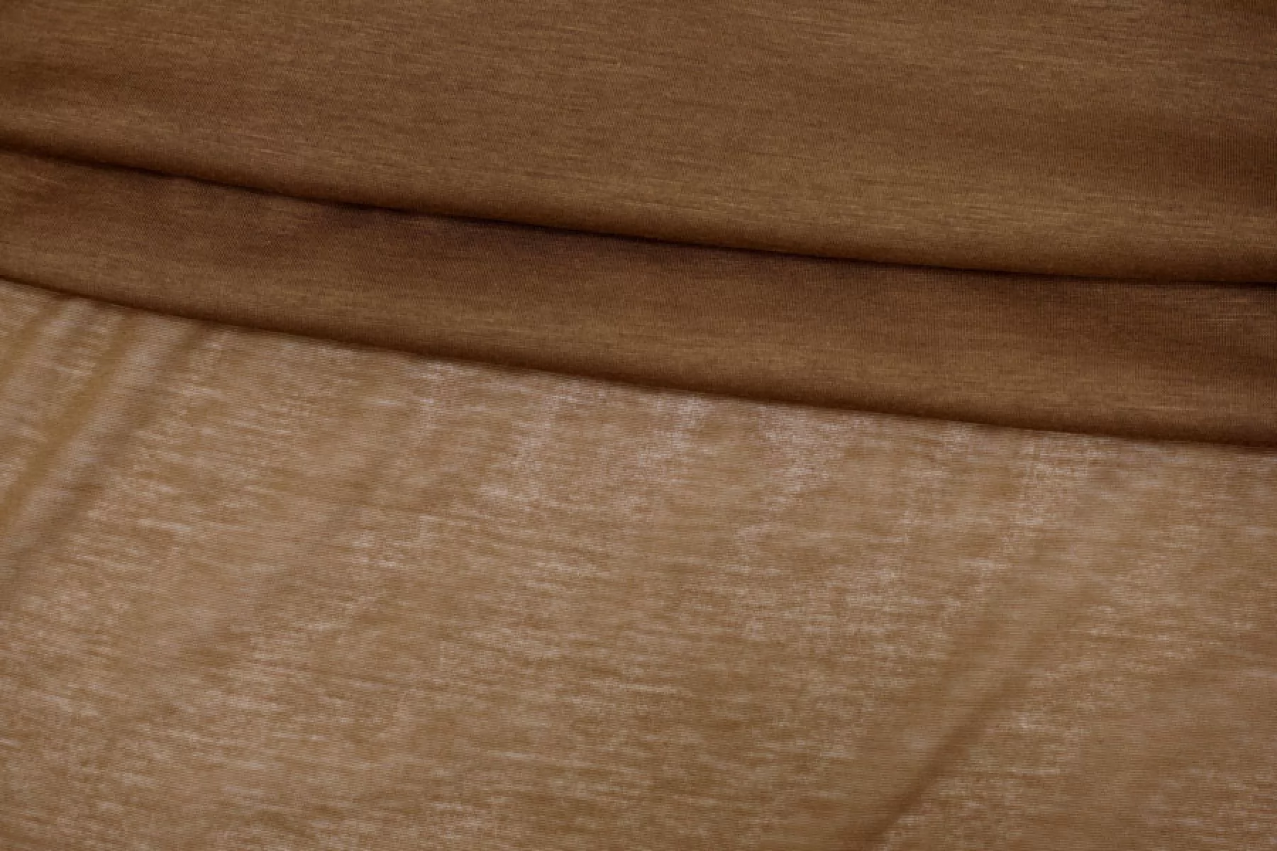 Трикотаж из модала - кулирная гладь, коричневого цвета. Эластичный, тонкий, просвечивает. Тактильно очень приятный, гладкий. Форму не держит. Можно использовать для пошива маек, лонгсливов, футболок, платьев, туник.