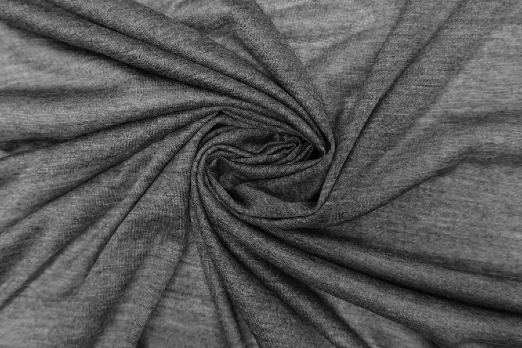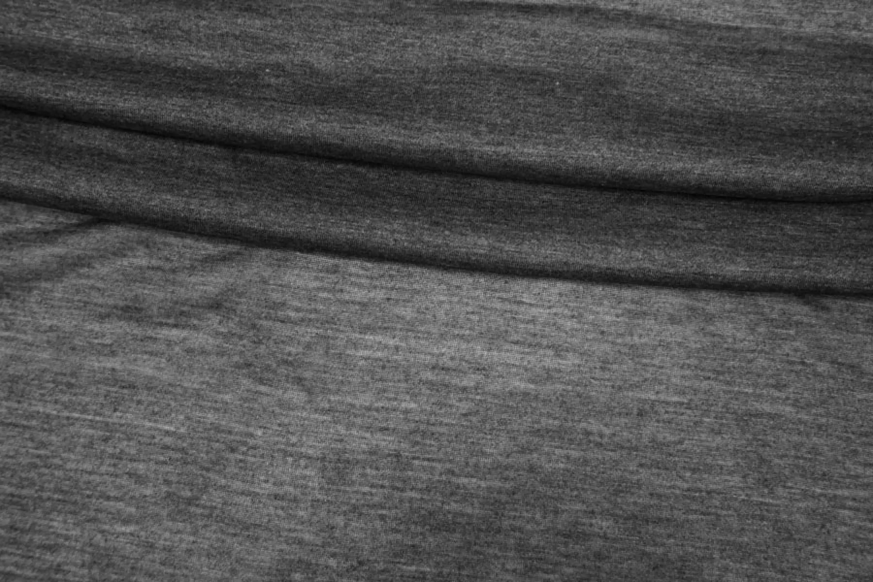 Трикотаж из модала - кулирная гладь, серого меланжевого цвета. Эластичный, тонкий, просвечивает. Тактильно очень приятный, гладкий. Форму не держит. Можно использовать для пошива маек, лонгсливов, футболок, платьев, туник.