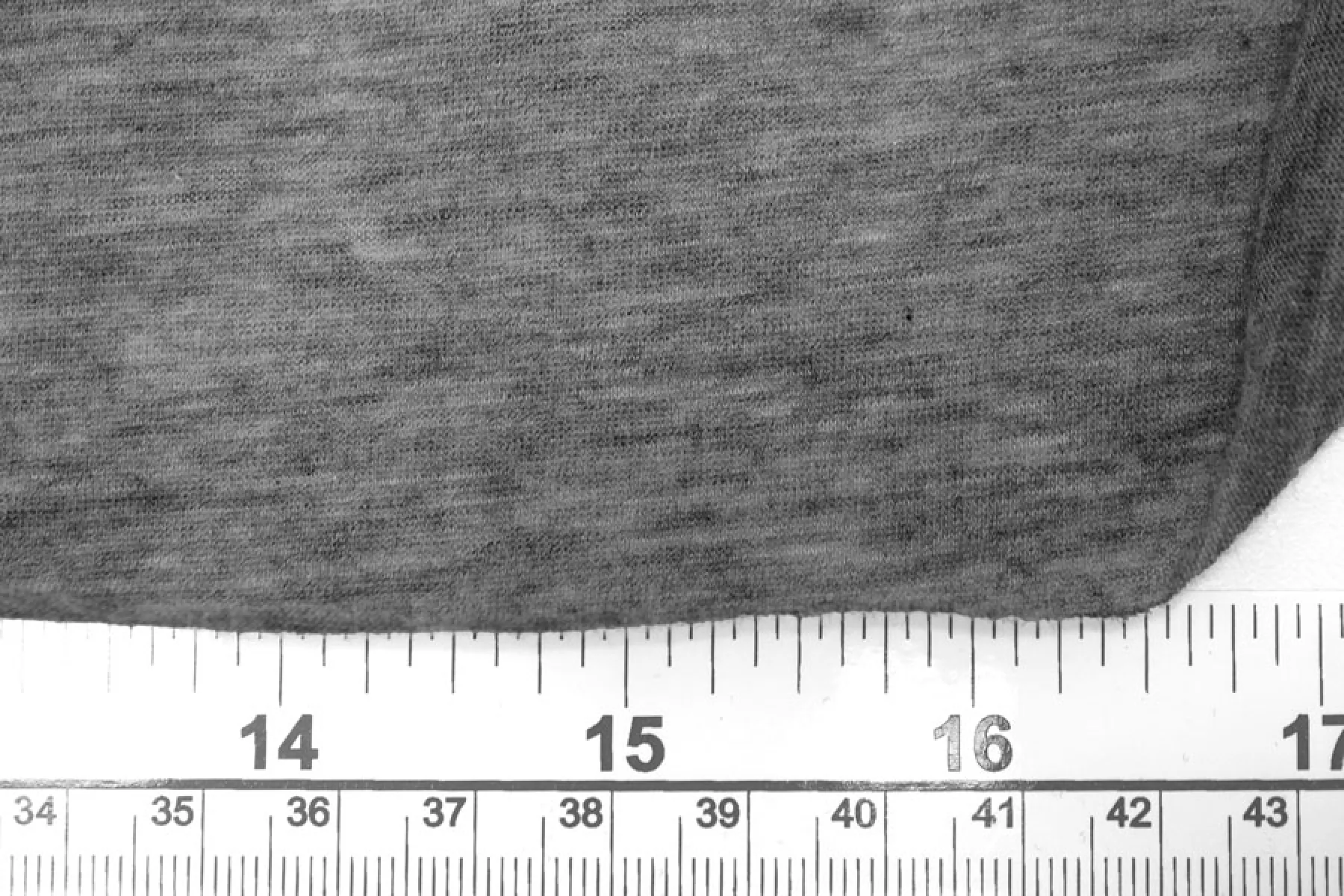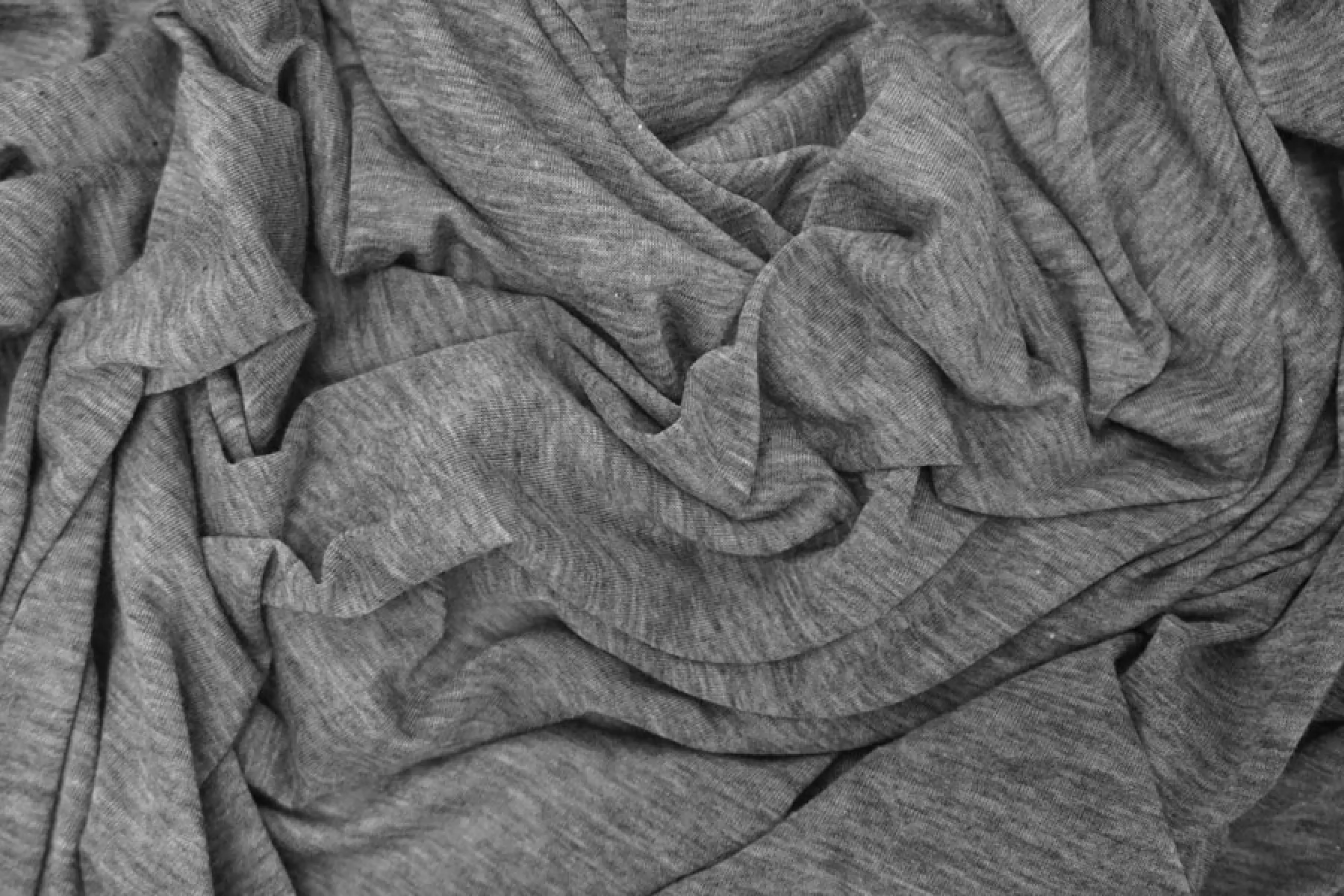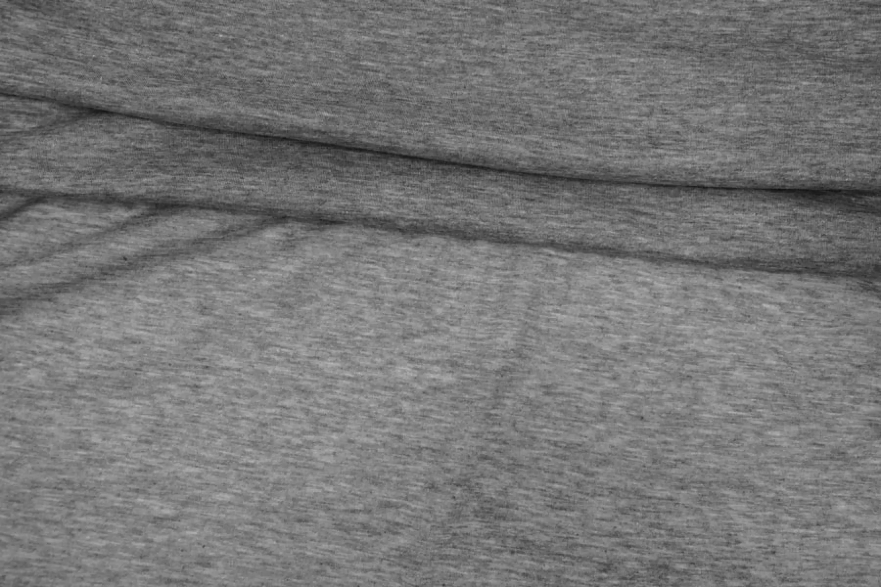 Трикотаж из модала - кулирная гладь, серого меланжевого цвета. Эластичный, тонкий, просвечивает. Тактильно очень приятный, гладкий. Форму не держит. Можно использовать для пошива маек, лонгсливов, футболок, платьев, туник.