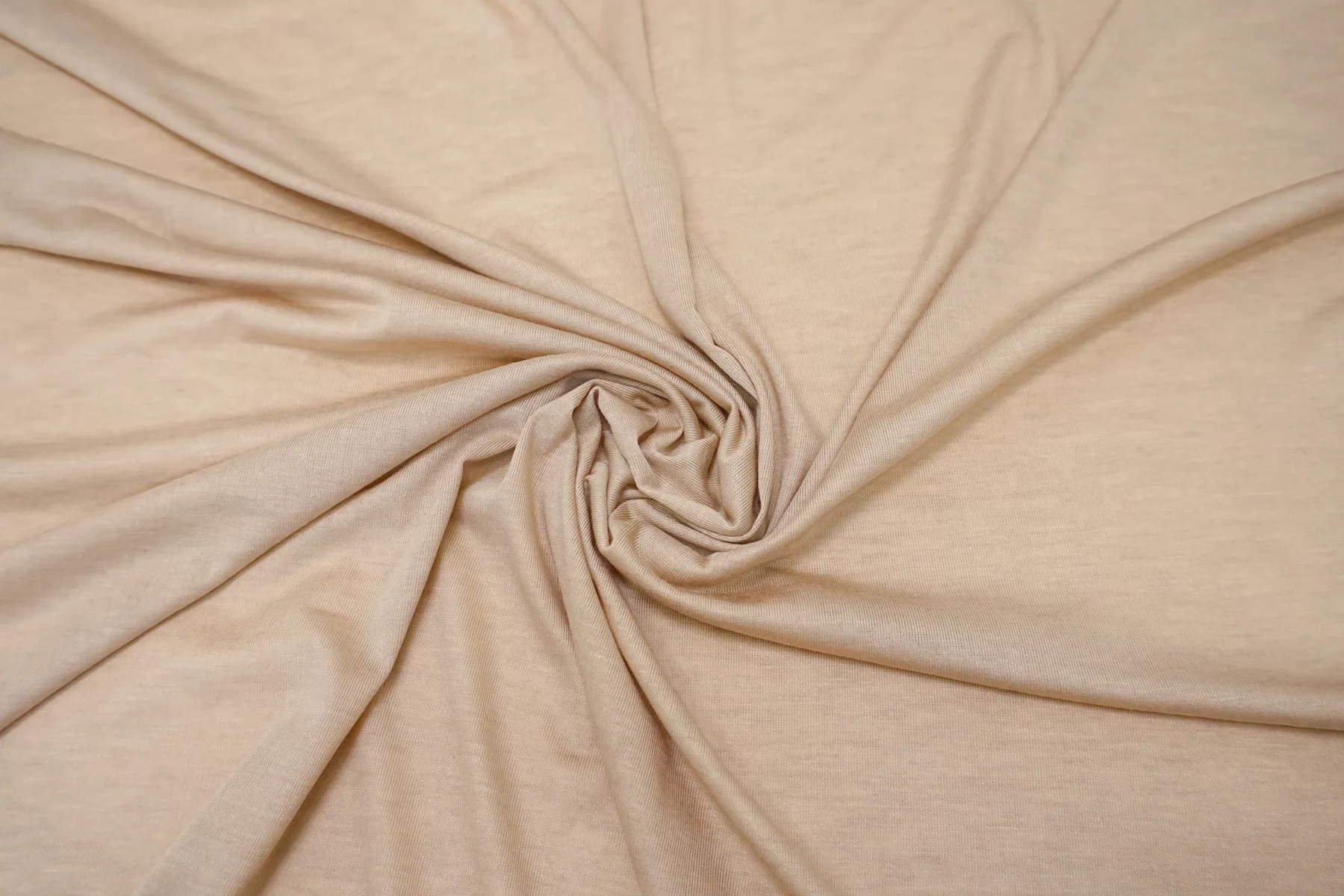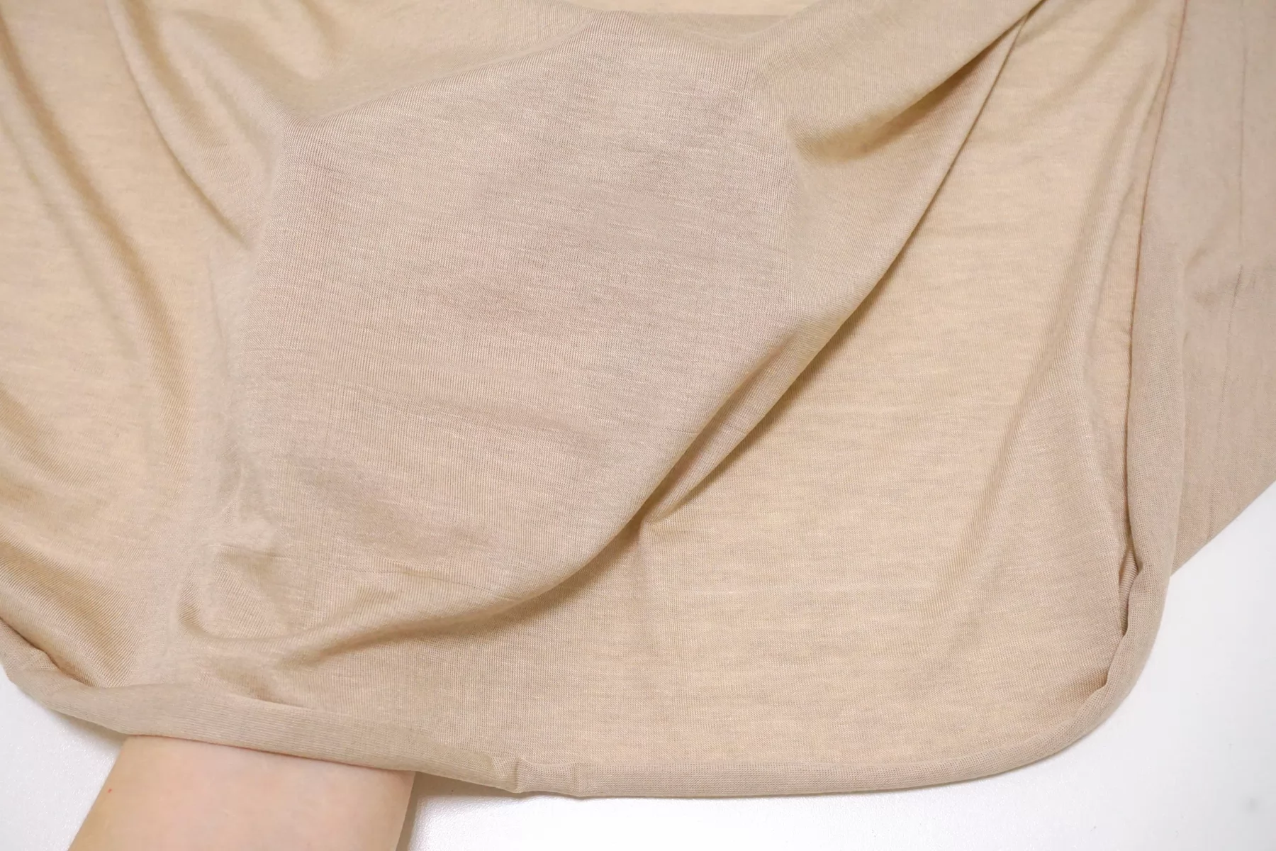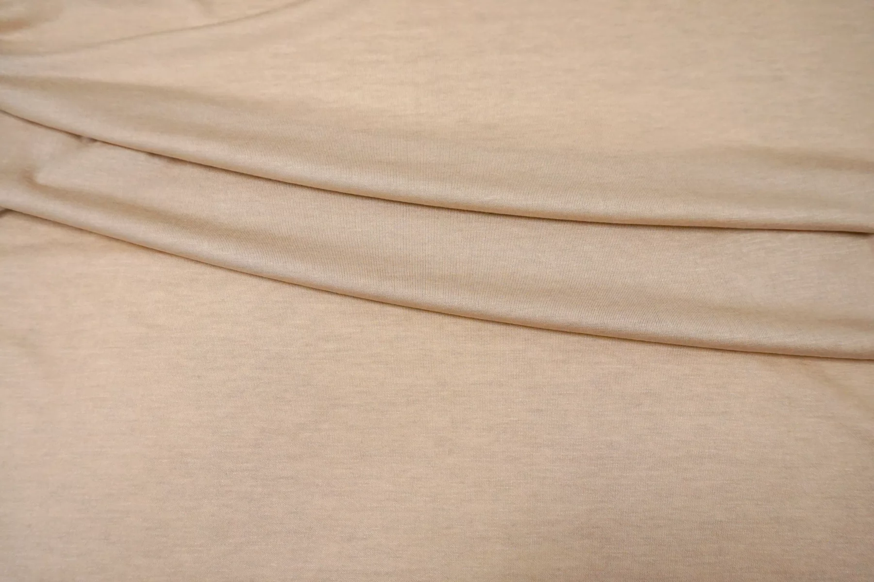 Прекрасный трикотаж - кулирная гладь, из модала с добавлением кашемира, в бежевом оттенке. Тактильно очень приятный, гладкий, шерсть не ощущается. Тонкий, просвечивает (при растяжении становится полупрозрачным). Хорошо тянется. Пластичный, форму не держит. Очень комфортный к телу. Можно использовать для пошива маек, футболок, платьев, туник. Уход деликатный.