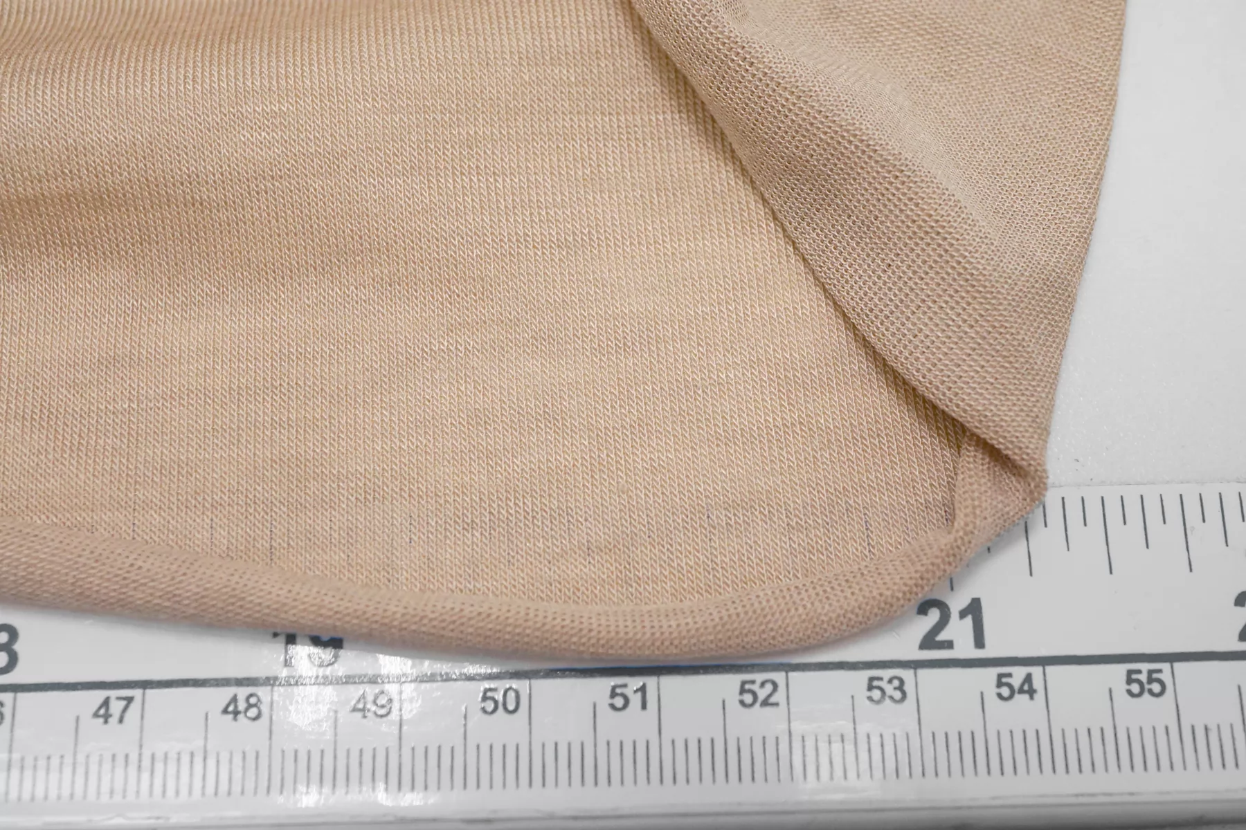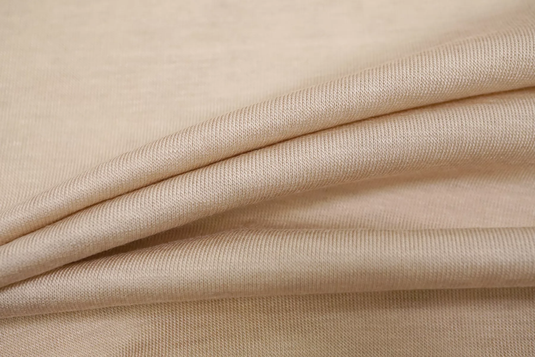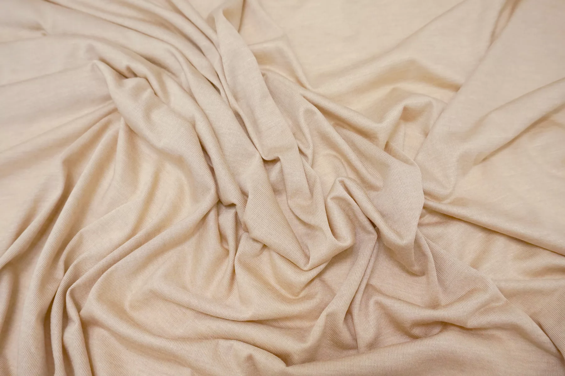 Прекрасный трикотаж - кулирная гладь, из модала с добавлением кашемира, в бежевом оттенке. Тактильно очень приятный, гладкий, шерсть не ощущается. Тонкий, просвечивает (при растяжении становится полупрозрачным). Хорошо тянется. Пластичный, форму не держит. Очень комфортный к телу. Можно использовать для пошива маек, футболок, платьев, туник. Уход деликатный.