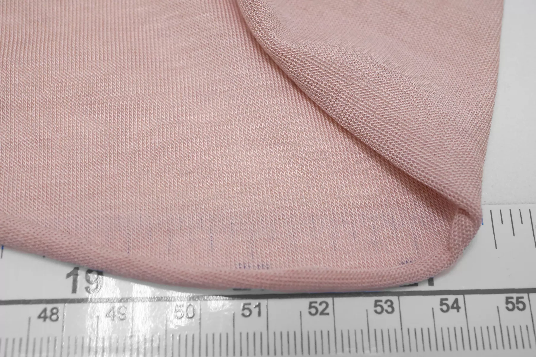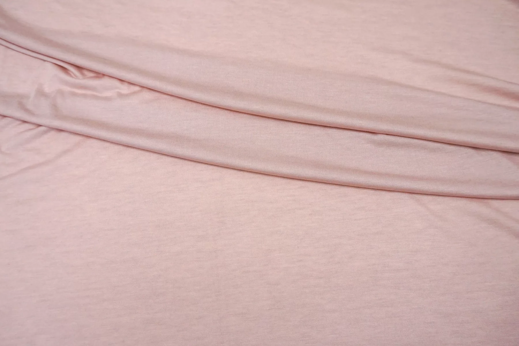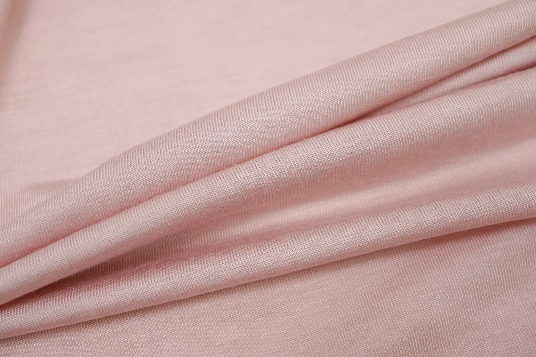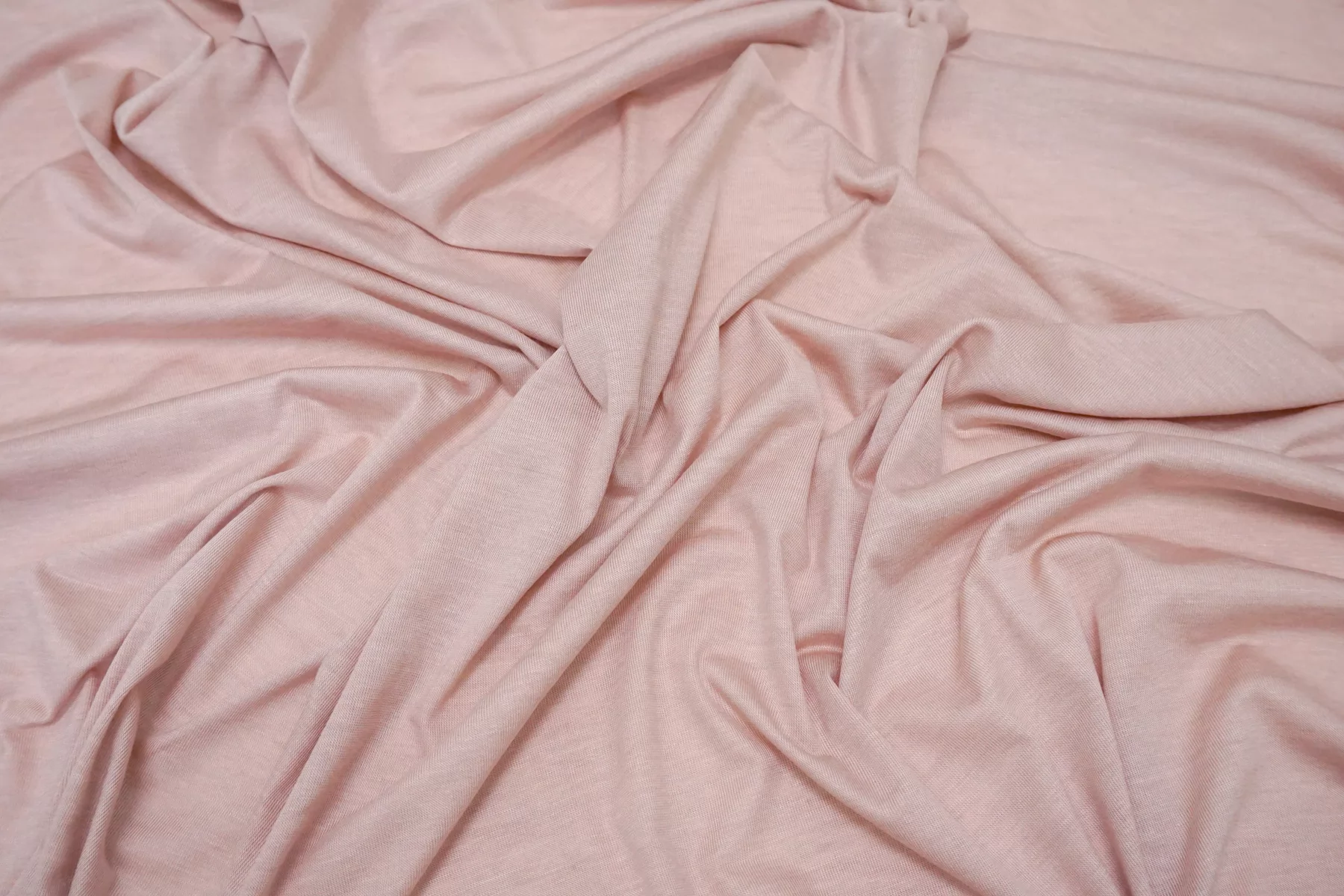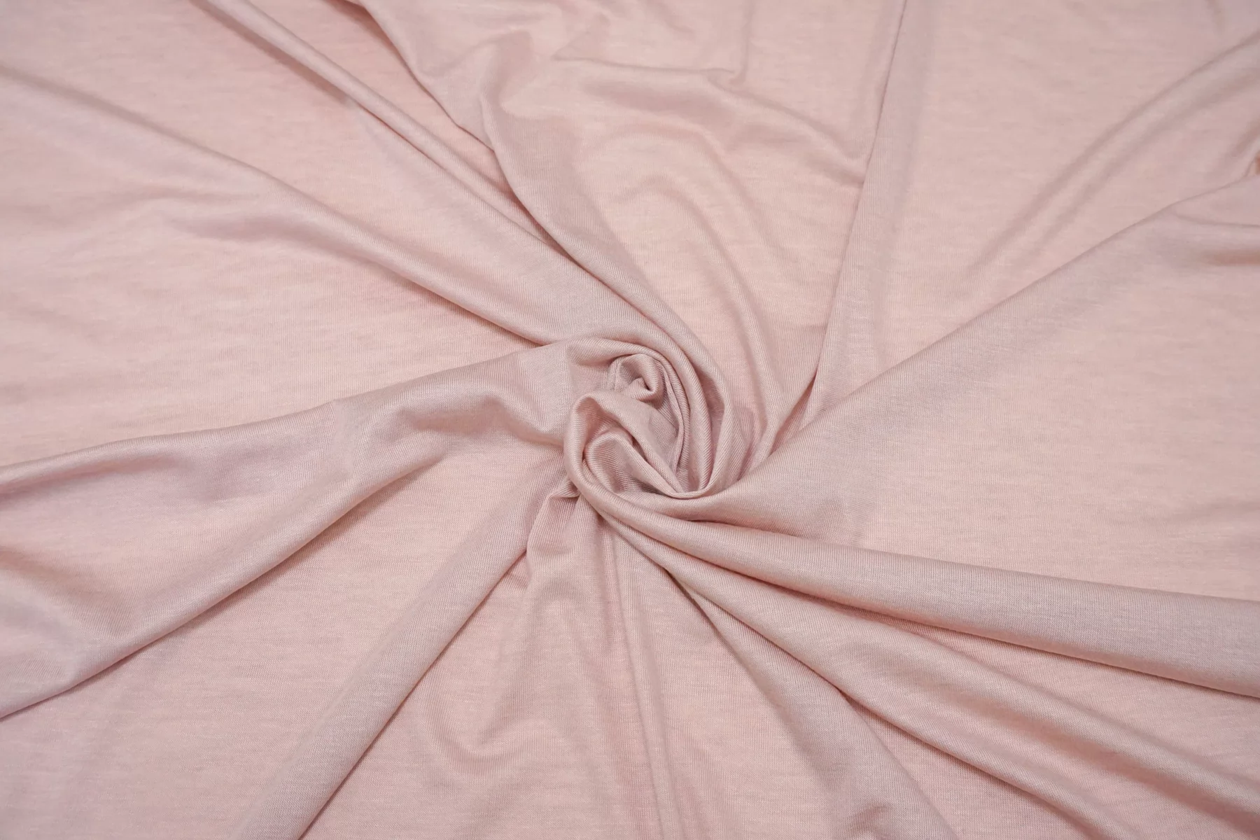 Прекрасный трикотаж - кулирная гладь, из модала с добавлением кашемира, в нежном, чуть припылённом розовом оттенке. Тактильно очень приятный, гладкий, шерсть не ощущается. Тонкий, просвечивает (при растяжении становится полупрозрачным). Хорошо тянется. Пластичный, форму не держит. Очень комфортный к телу. Можно использовать для пошива маек, футболок, платьев, туник. Уход деликатный.