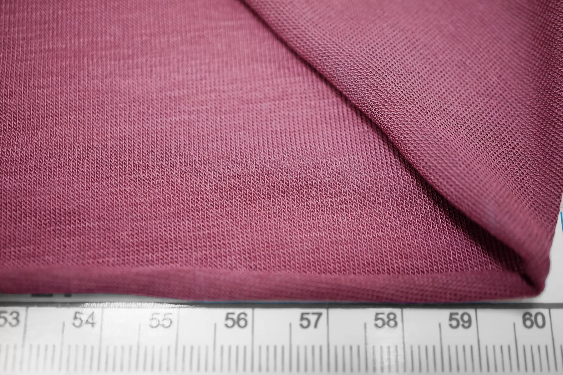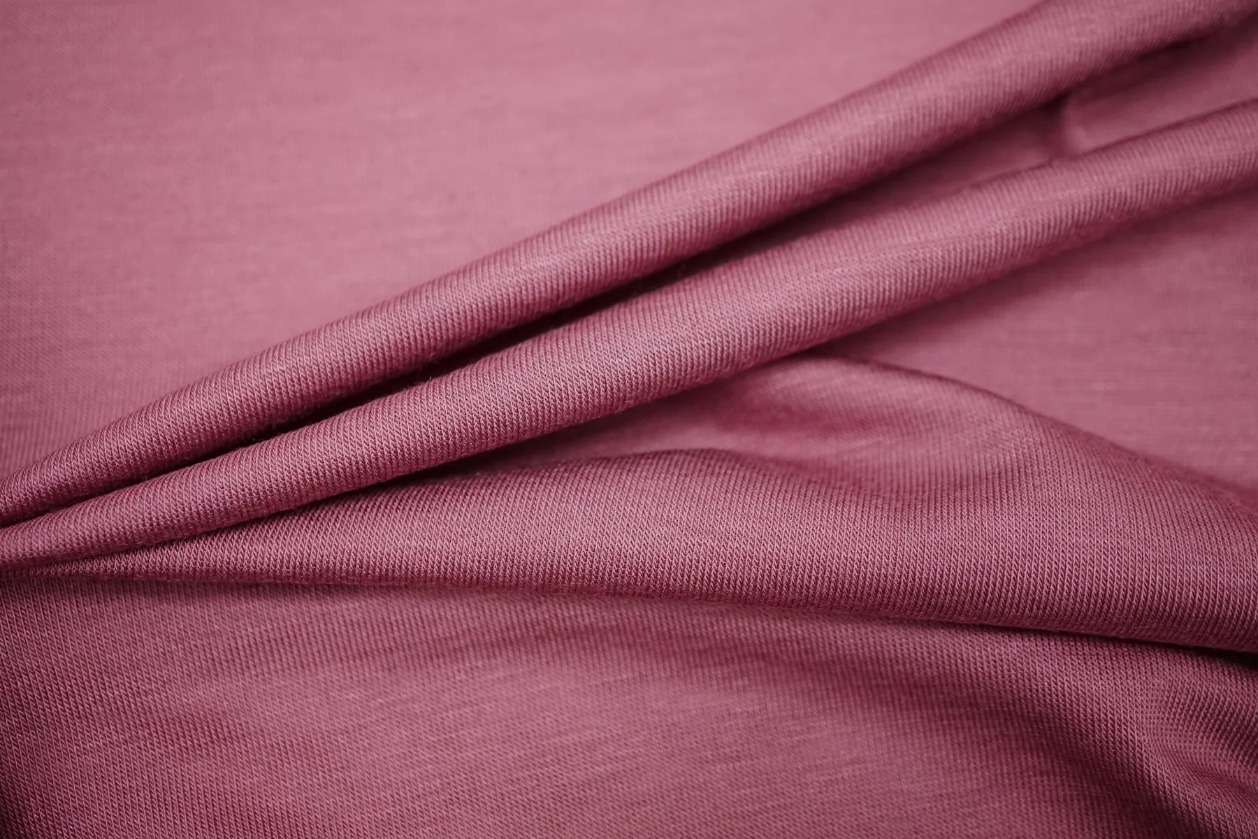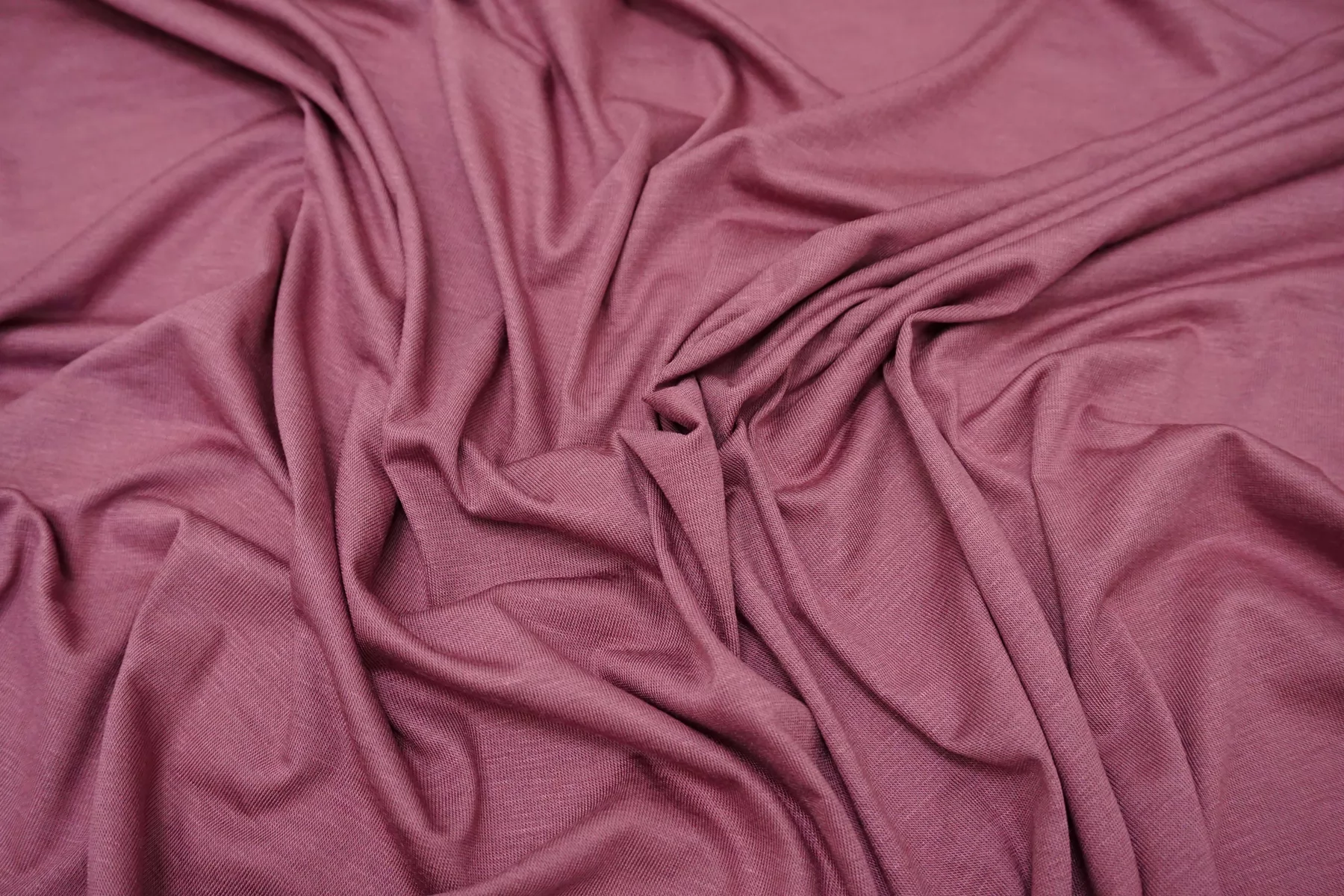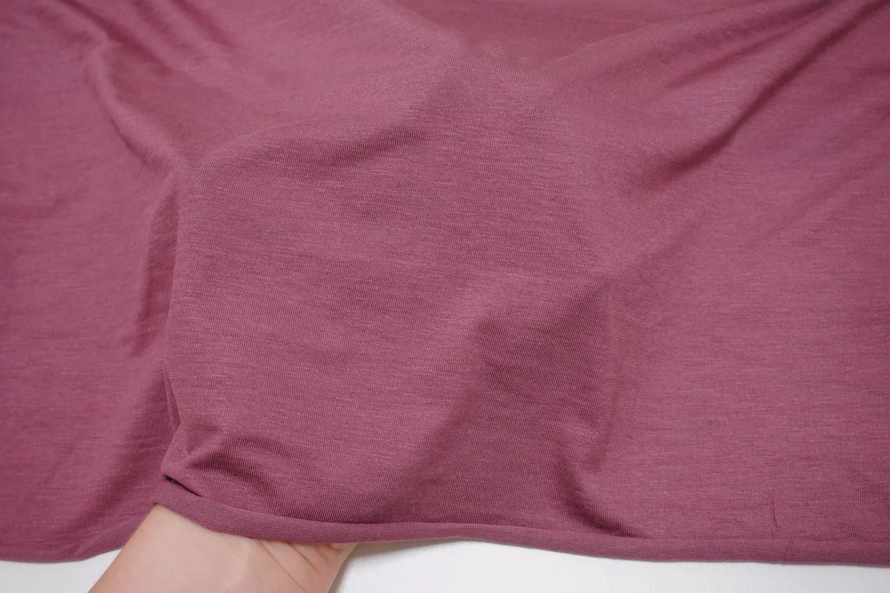 Прекрасный трикотаж - кулирная гладь, из модала с добавлением кашемира, в приглушенном лиловом оттенке. Тактильно очень приятный, гладкий, шерсть не ощущается. Тонкий, просвечивает (при растяжении становится полупрозрачным). Хорошо тянется. Пластичный, форму не держит. Очень комфортный к телу. Можно использовать для пошива маек, футболок, платьев, туник. Уход деликатный.