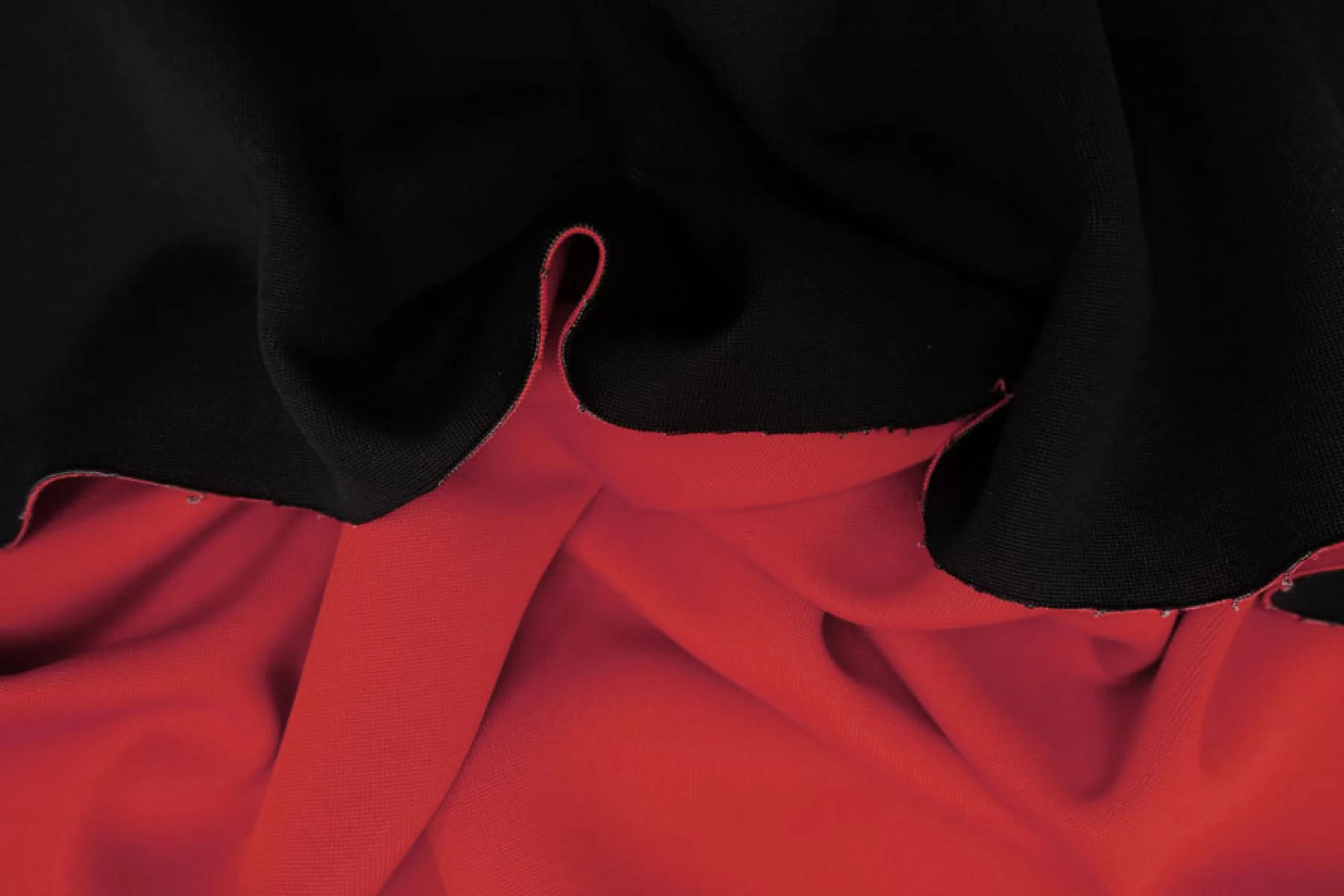Двусторонний неопреновый трикотаж из полиэстера, одна сторона красная, другая чёрная. Плотный, толщина около 2 мм. Эластичный, упругий, пластичный, не просвечивает, неплохо держит форму, не мнется. Подойдет для пошива нестандартного платья, юбки, бомбера.
