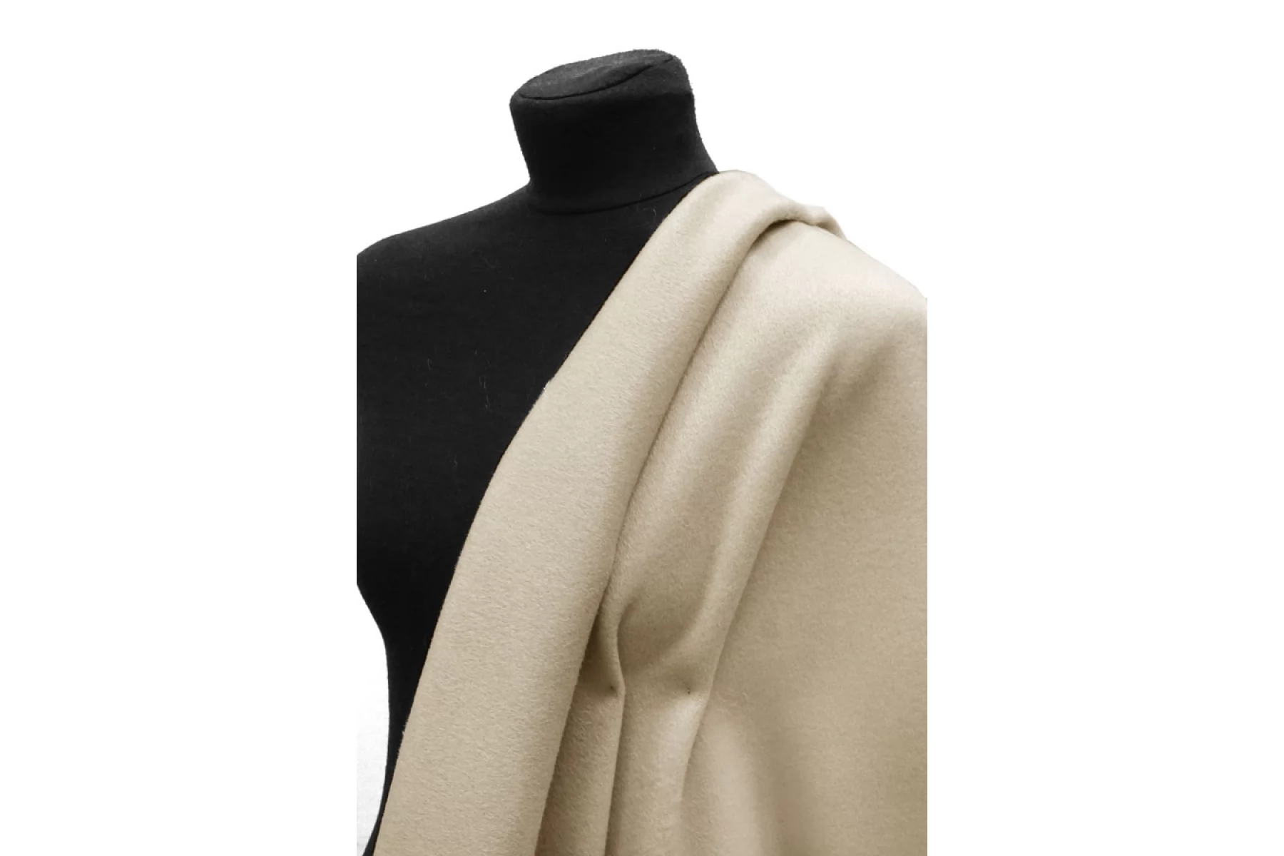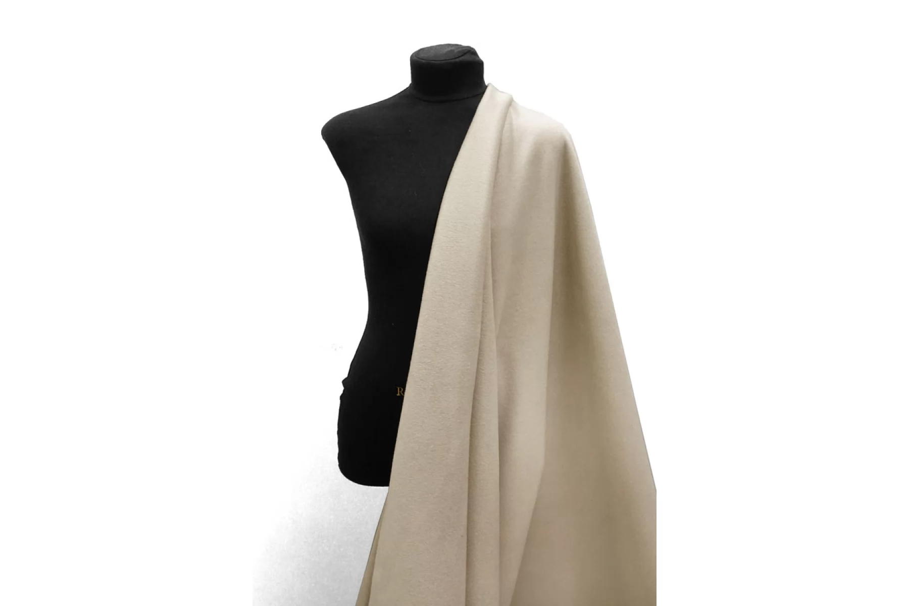 Шикарный шерстяной плотный трикотаж в светло-бежевом оттенке с добавлением кашемира. Мягкий и приятный наощупь, гладкий, немного суховатый. Ворс короткий, направленный. Тянется. Не просвечивает. Не мнется. Держит форму. Прекрасный вариант для теплого костюма или жакета, теплой рубашки, кардигана. Учитывайте возможную усадку. Уход деликатный.