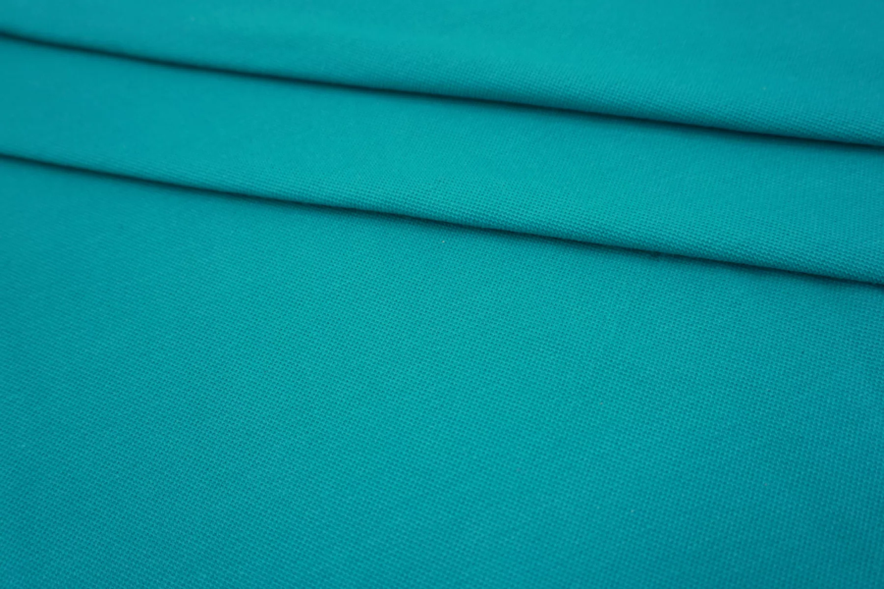 Трикотаж из хлопка, по плетению пике. Цвет бирюзовый. Трикотаж немного просвечивает насквозь в один слой, эластичный. Подойдет для пошива майки, футболки, топа, платья-футболки.