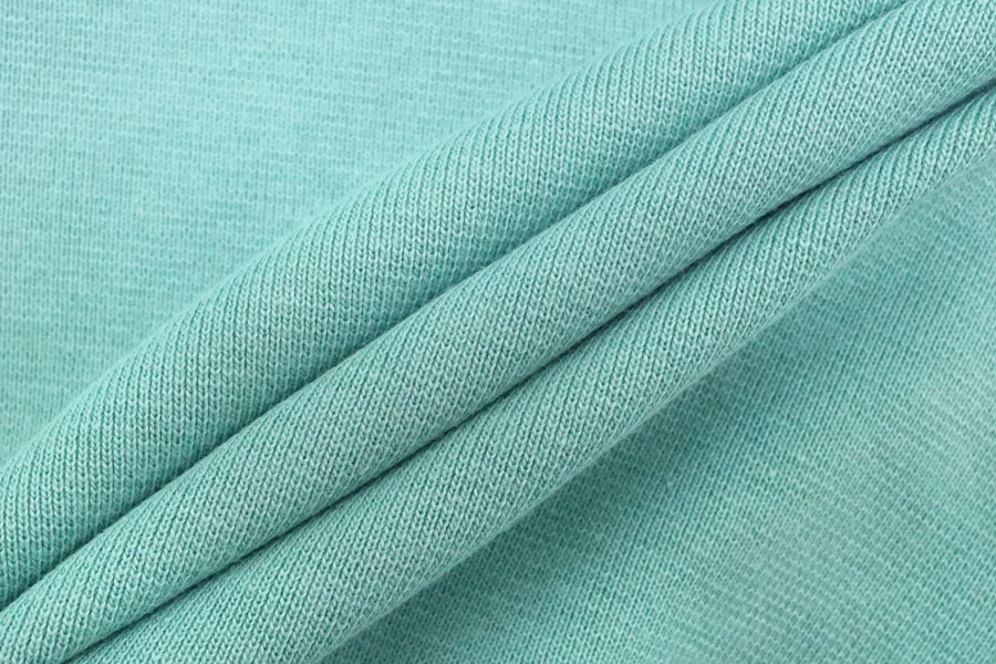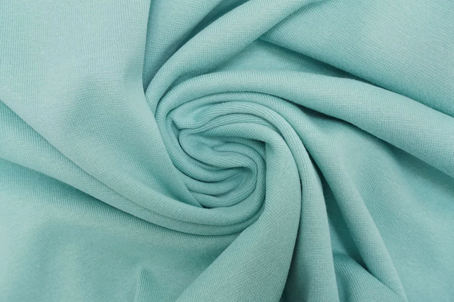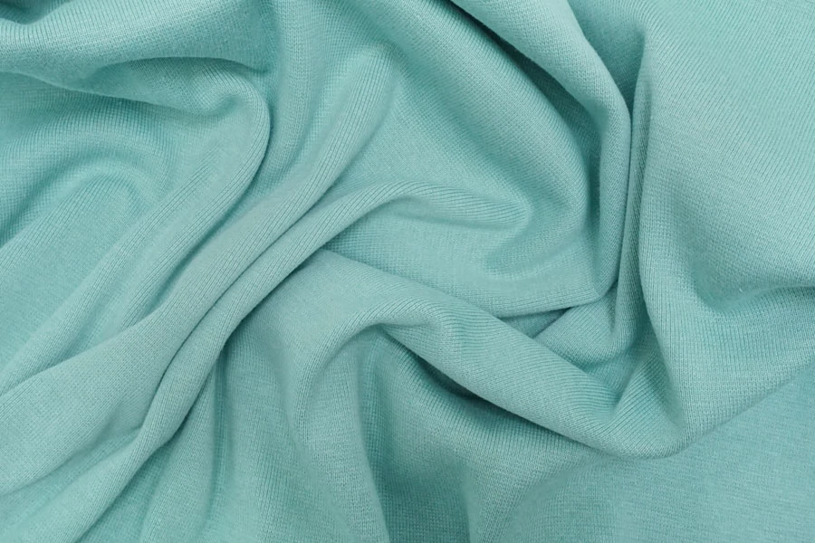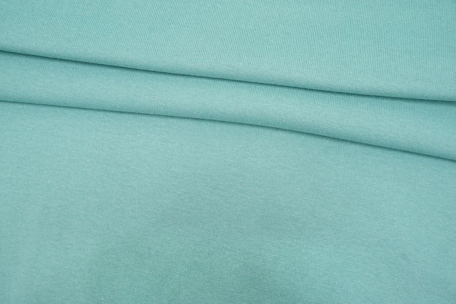 Хлопковый трикотаж - рибана в мятно-голубом цвете. Вязка чулком. Тонкий, пластичный, чувствуется плетение наощупь, эластичный, не просвечивает. Плотный. Тянется засчет плетения. Подойдет для пошива манжет, подвязов.
