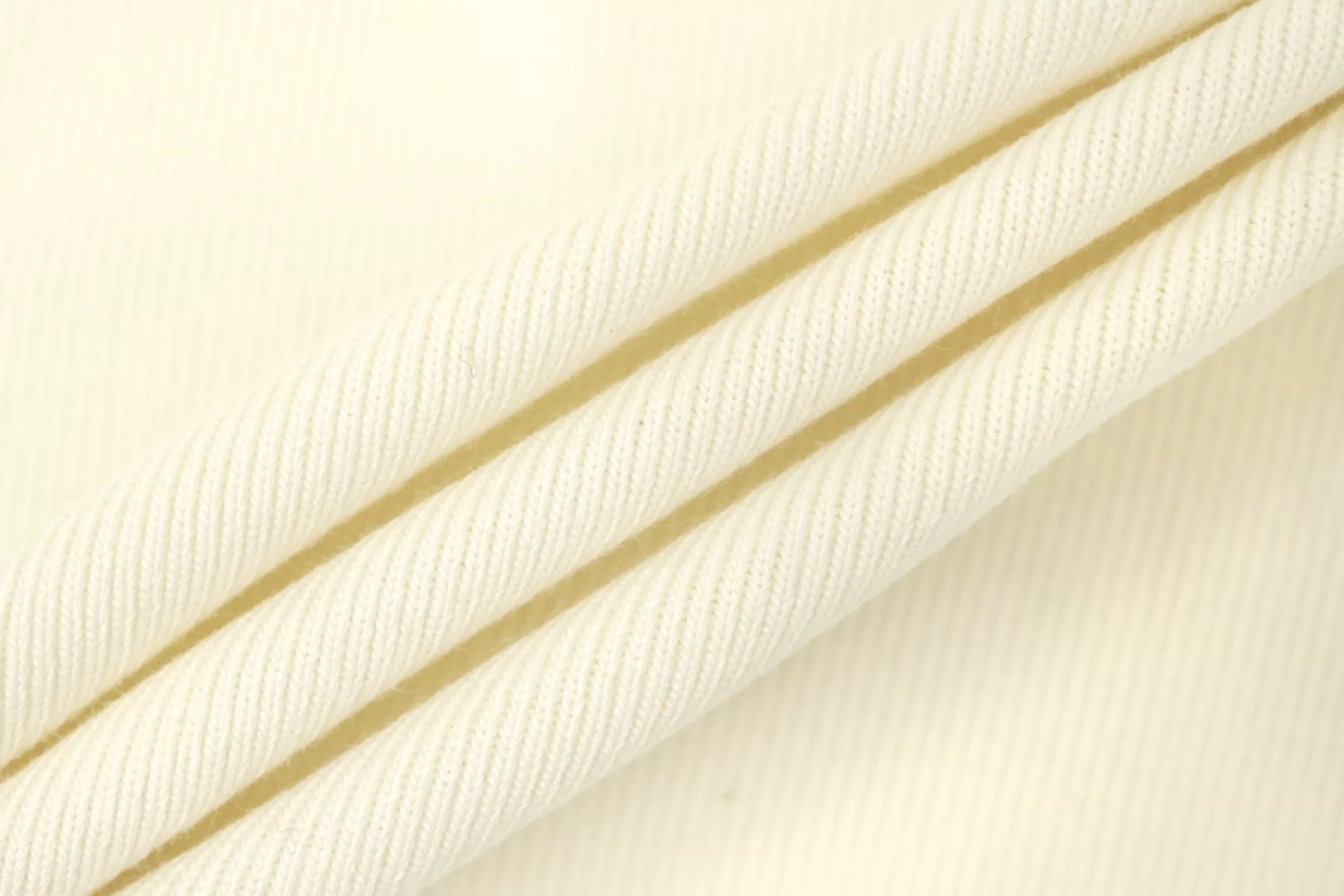 Внимание!! По всему рулону редко встречаются точечные вкрапления темного цвета! Итальянский хлопковый трикотаж - рибана сливочного оттенка. Материал пластичный, мягкий. Тактильно очень приятный, плотненький. Слегка просвечивает силуэт темного. Немного мнется, но восстанавливается. Отлично тянется за счет плетения и эластана. Немного держит форму. Подойдет для пошива майки, футболки, топа, платья, юбки и не только. Также можно использовать на обработку манжет и горловин.