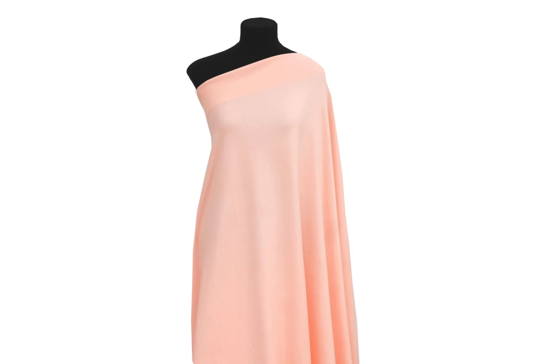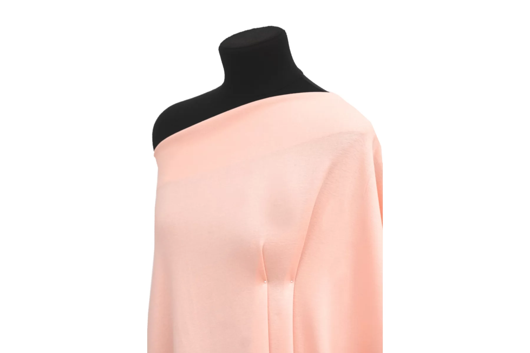 Итальянский хлопковый трикотаж - рибана нежного светло-персикового цвета. Материал пластичный, мягкий. Тактильно очень приятный, "бархатистый", толстенький. Не просвечивает. Немного мнется. Отлично тянется за счет плетения. Подойдет для пошива майки, футболки, топа и не только.