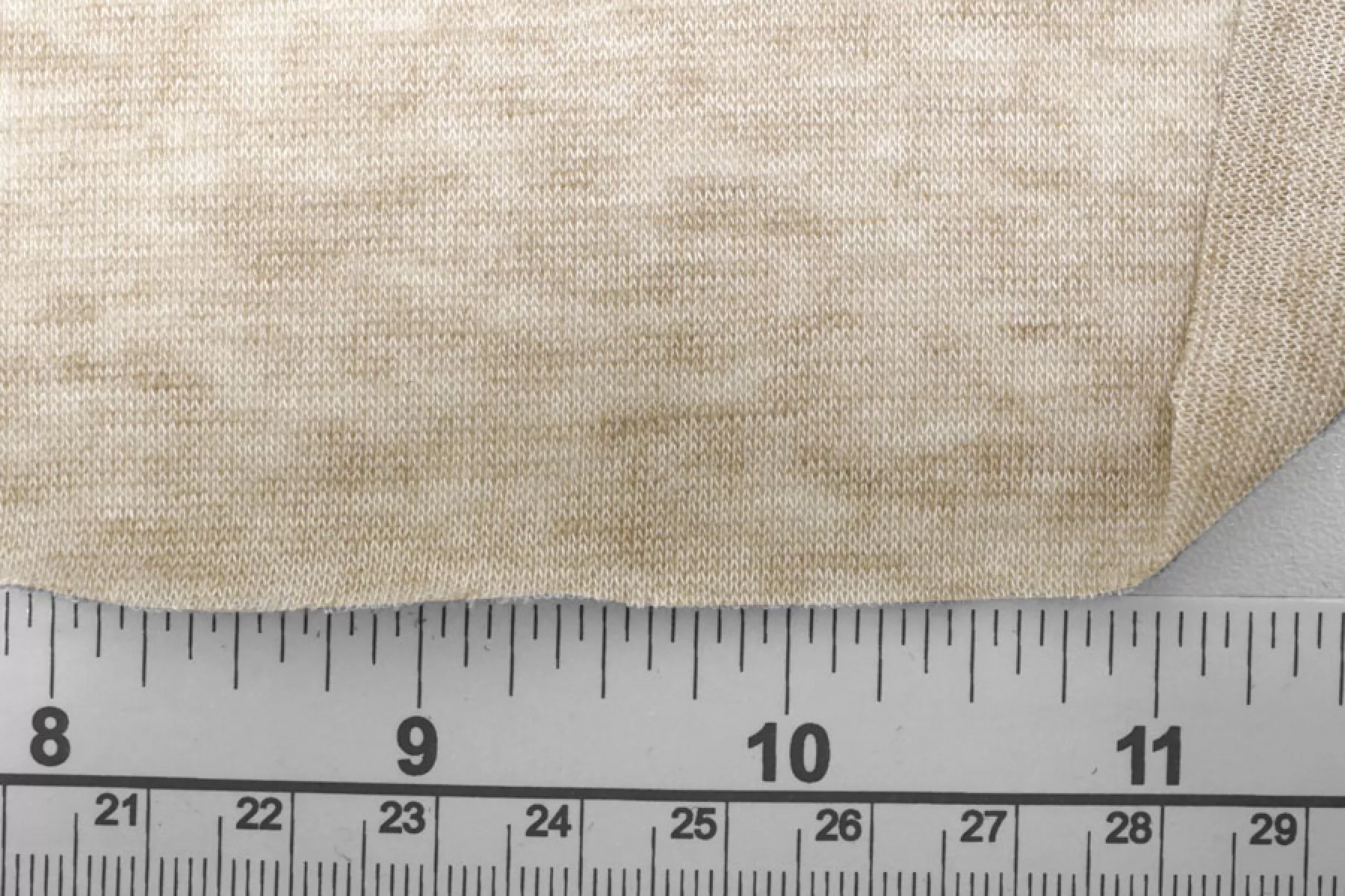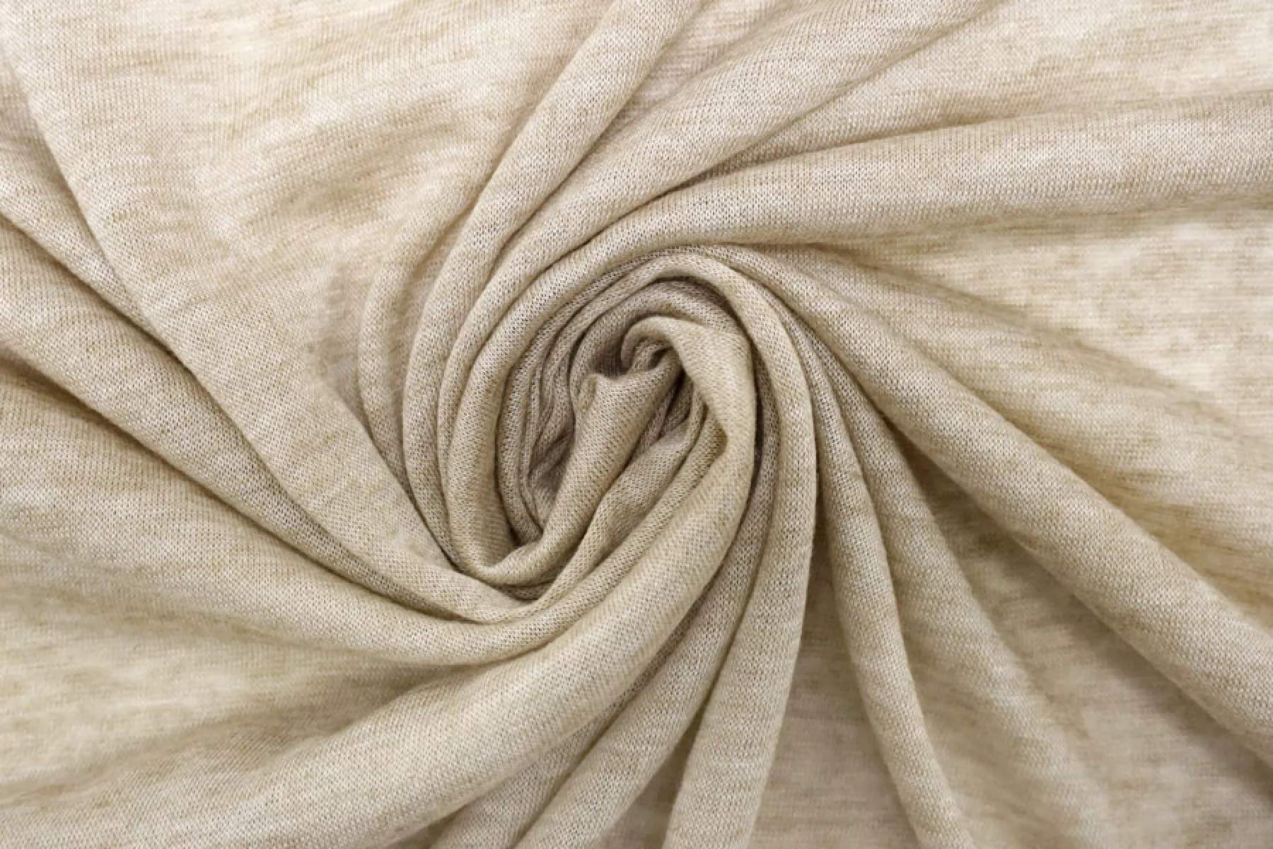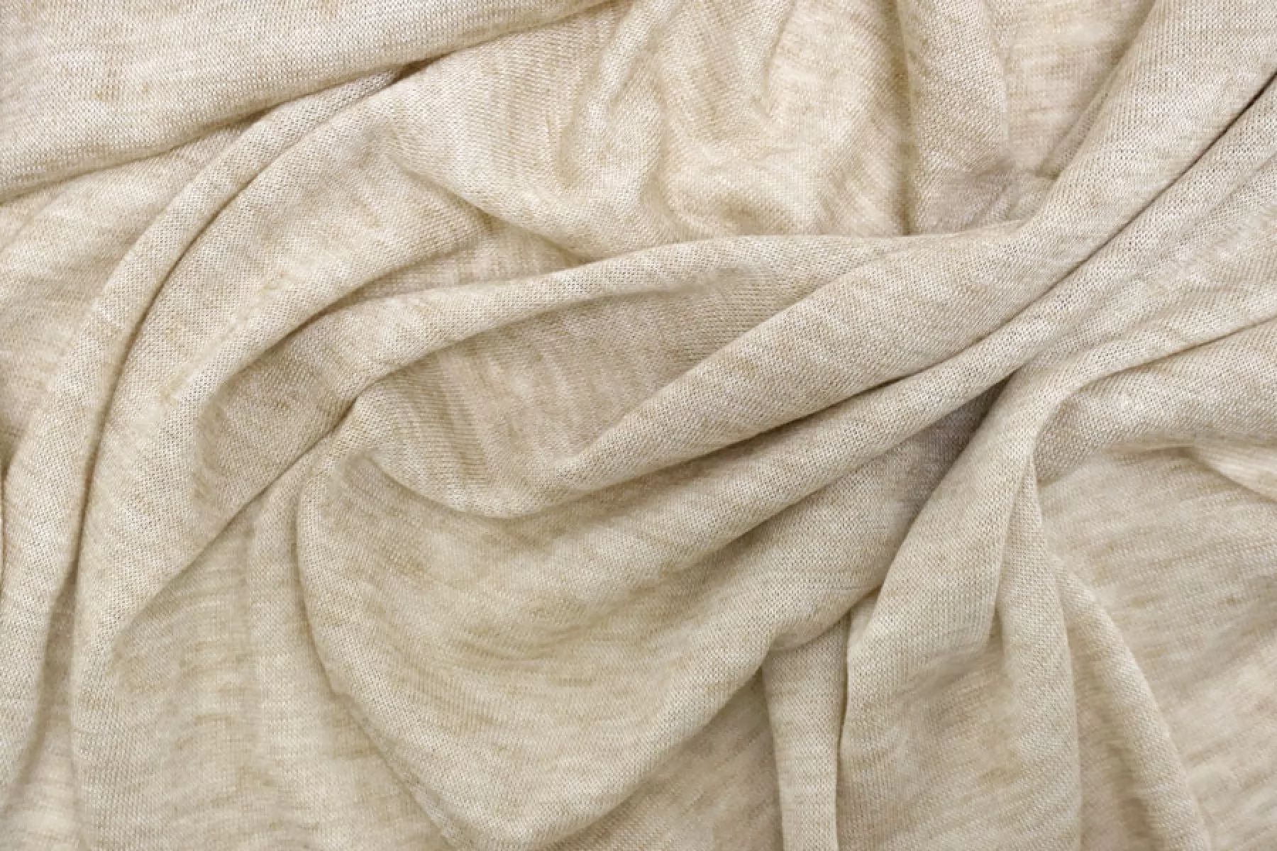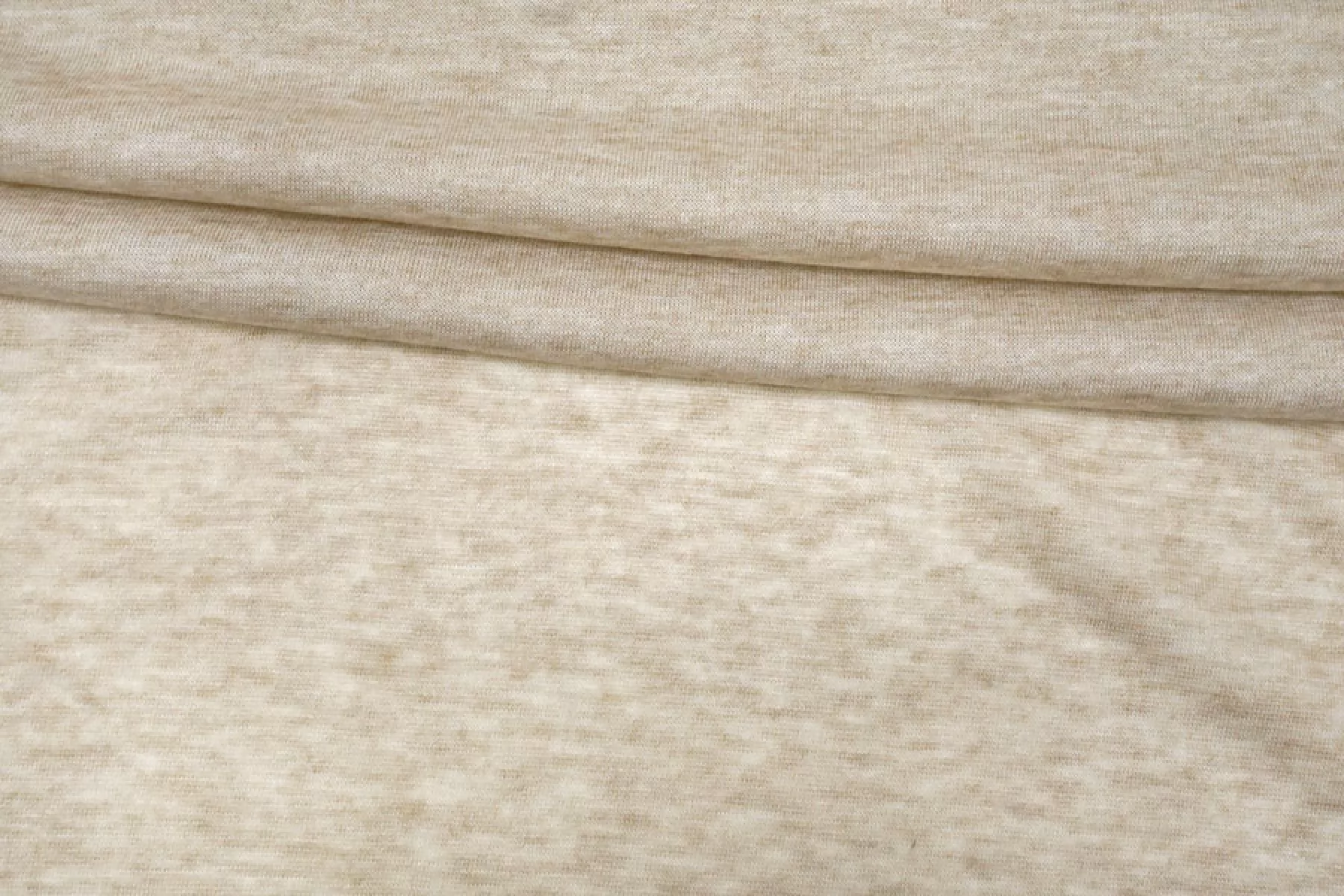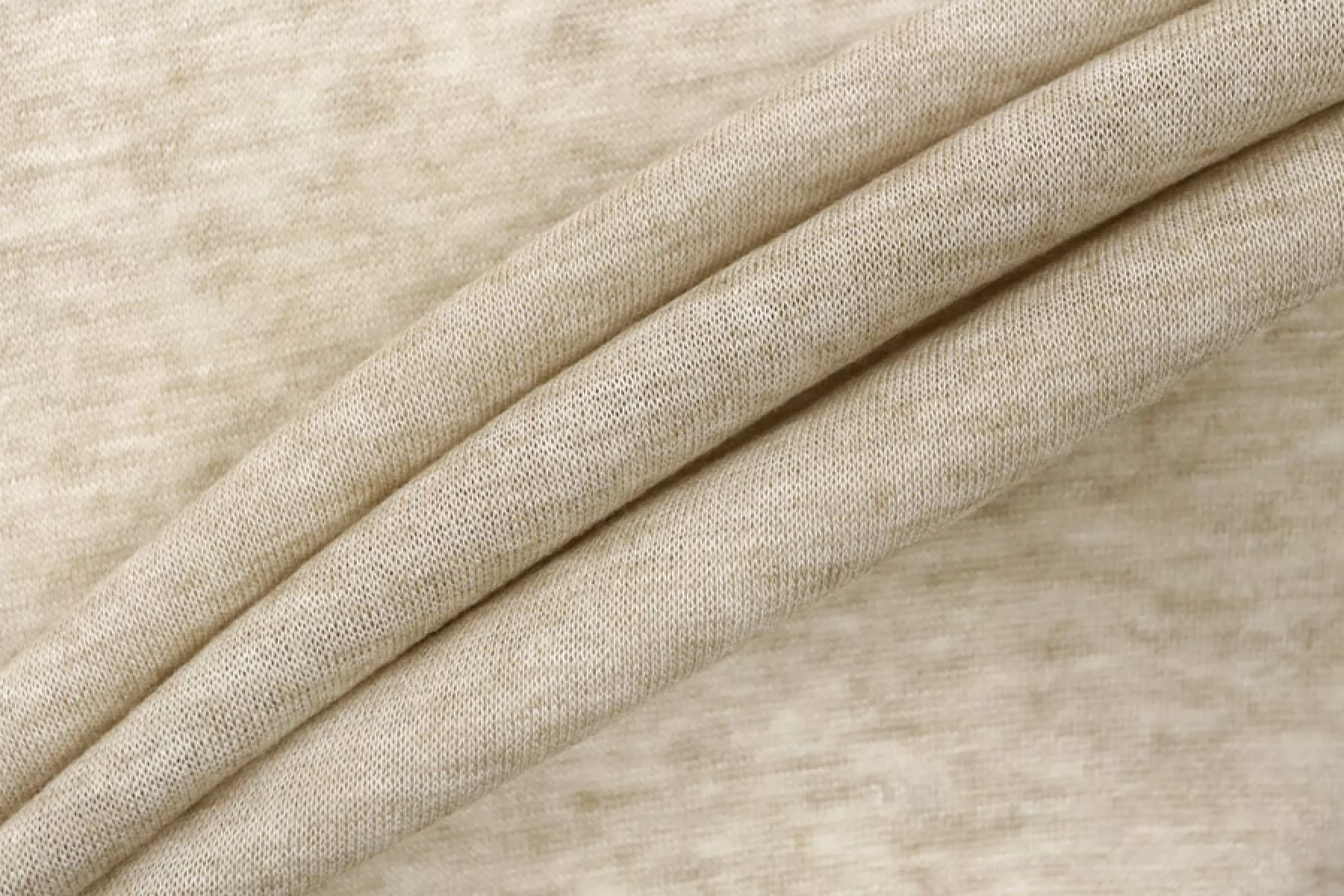 Тонкий трикотаж из шерсти с хлопком, по плетению кулирная гладь. Цвет бежевый. Приятный и мягкий наощупь. Не колется. Трикотаж просвечивает, пластичный, эластичный. Подойдет для пошива майки, футболки, топа, можно использовать в качестве подклада, греющей нижней юбки, тонкой водолазки.