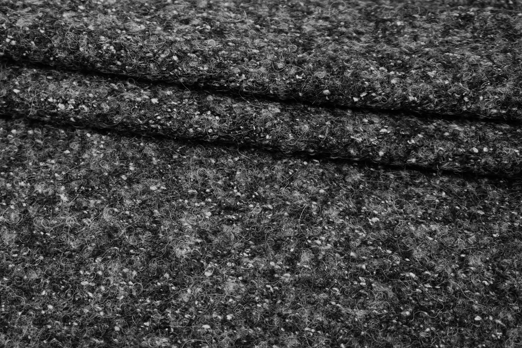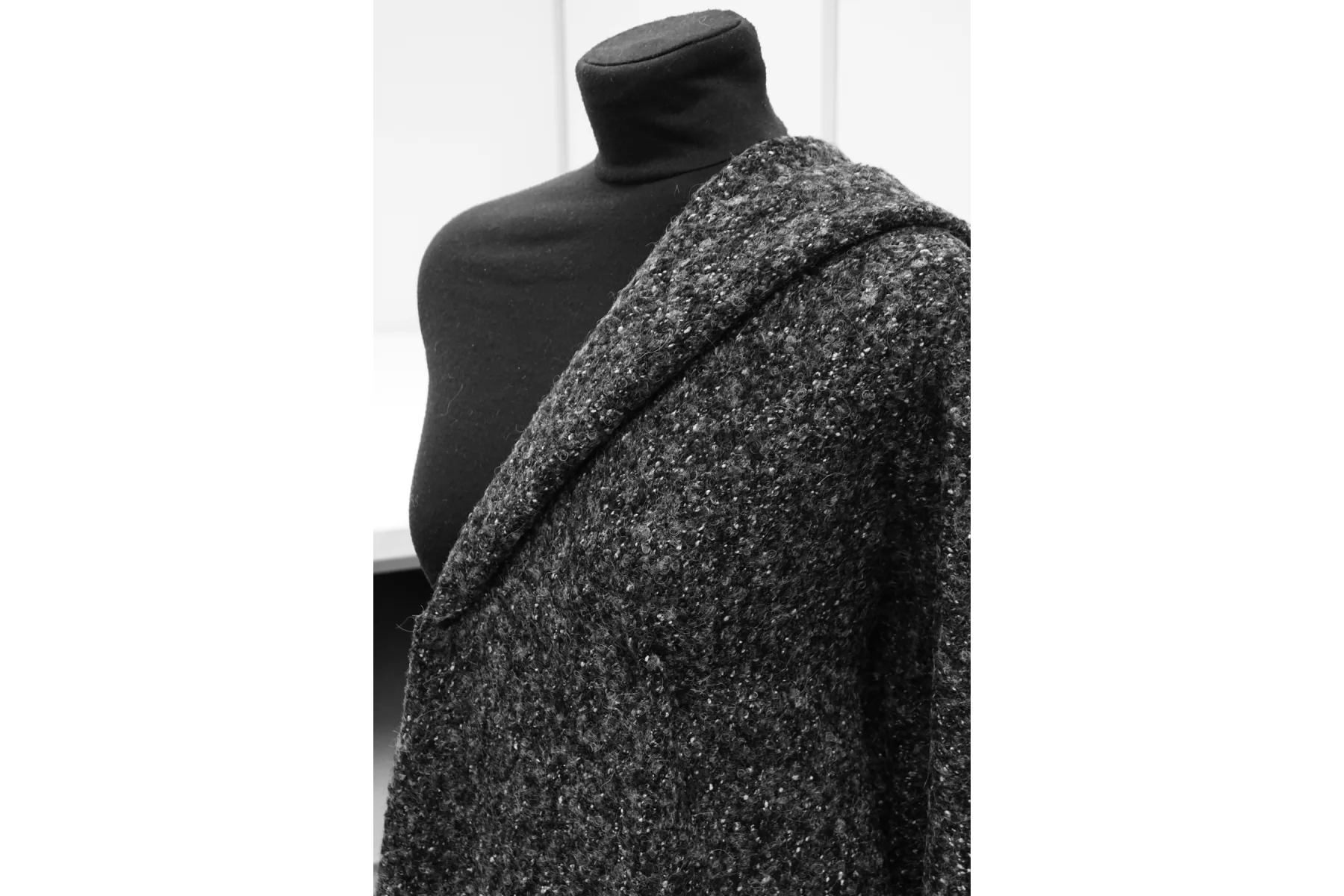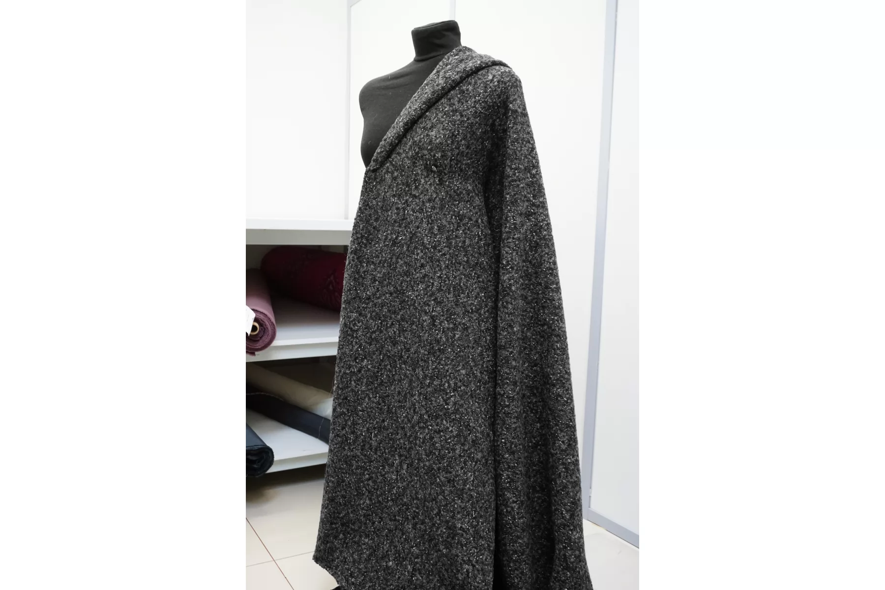 Шерстяной трикотаж, структура близкая к букле, нити серого цвета, разной светлоты. Тактильно сухой, слегка шероховатый но мягкий. Растяжим за счет плетения. Плотненький, около 3 мм толщиной. Немного просвечивает в дырочки плетения. Слегка сминается, но восстанавливается. Неплохо держит форму и складки, хорошо драпируется. Отличный вариант как для костюма, так и для облегченного пальто, а также пальто-рубашки, жакета и не только. Уход, как за любой шерстью деликатный.