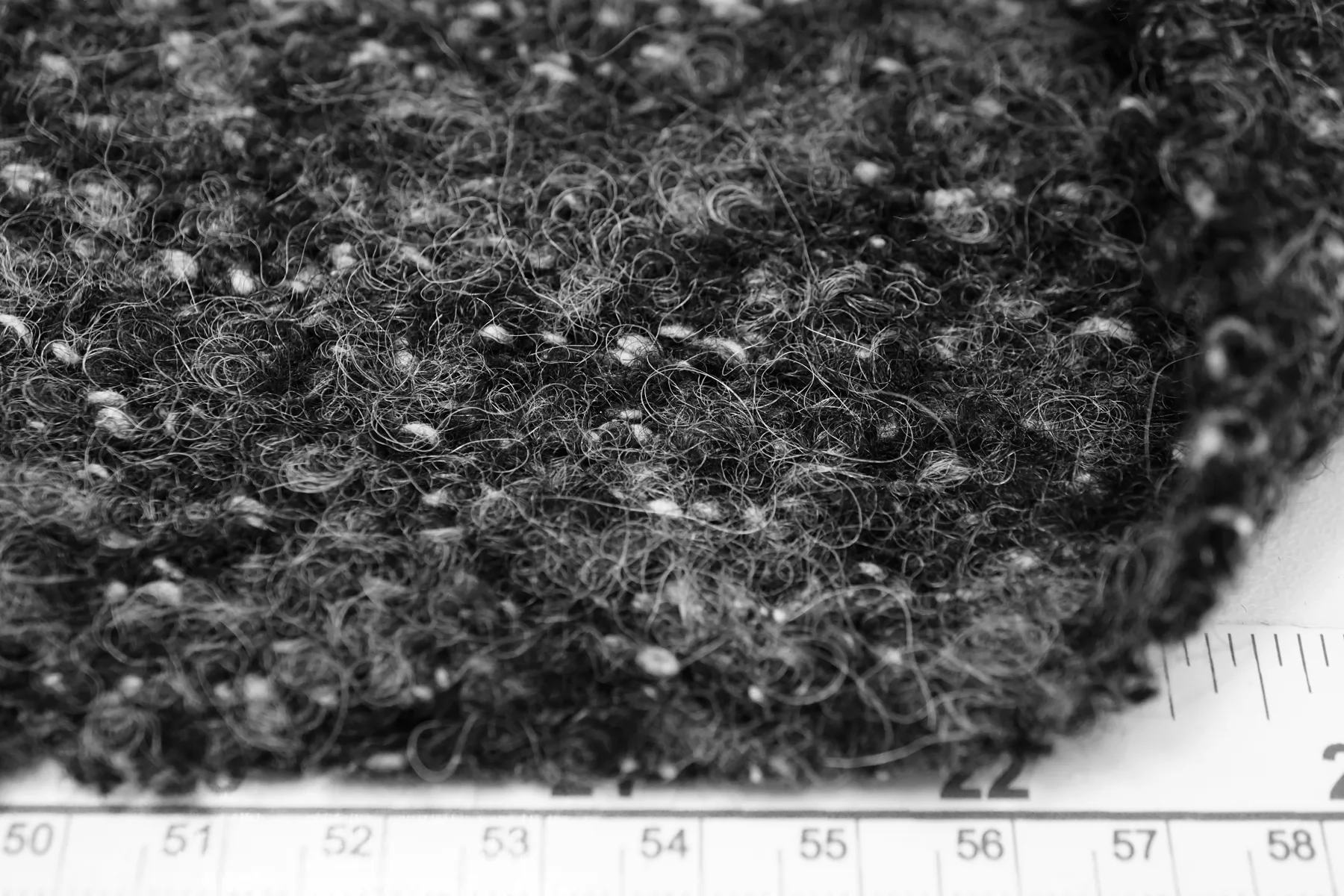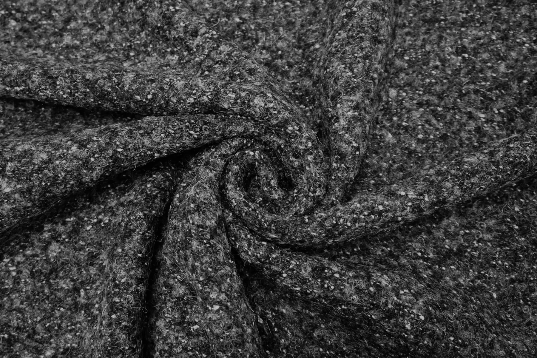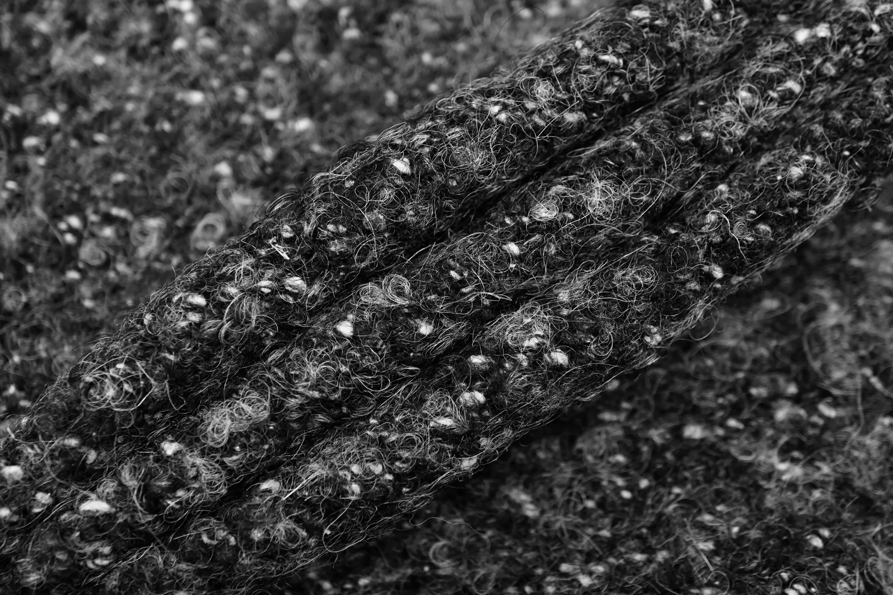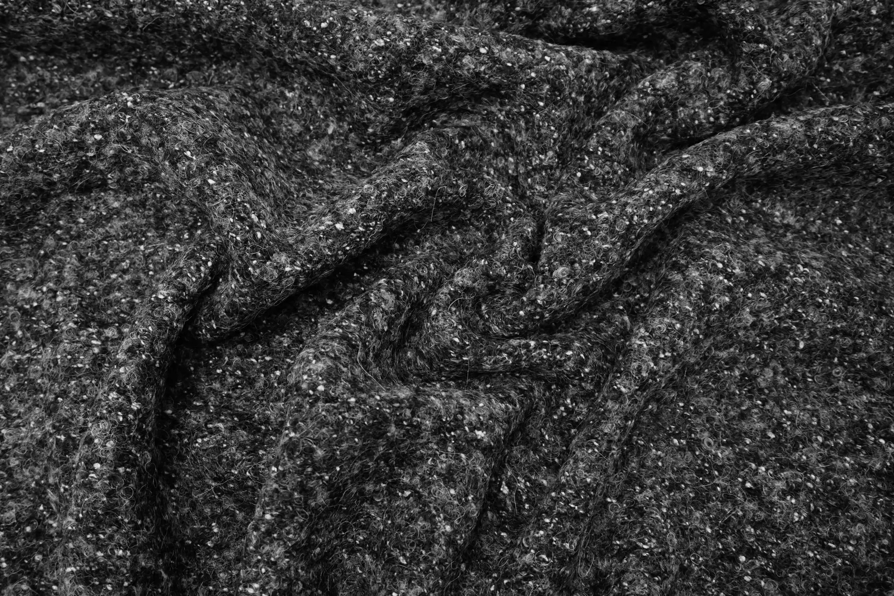 Шерстяной трикотаж, структура близкая к букле, нити серого цвета, разной светлоты. Тактильно сухой, слегка шероховатый но мягкий. Растяжим за счет плетения. Плотненький, около 3 мм толщиной. Немного просвечивает в дырочки плетения. Слегка сминается, но восстанавливается. Неплохо держит форму и складки, хорошо драпируется. Отличный вариант как для костюма, так и для облегченного пальто, а также пальто-рубашки, жакета и не только. Уход, как за любой шерстью деликатный.