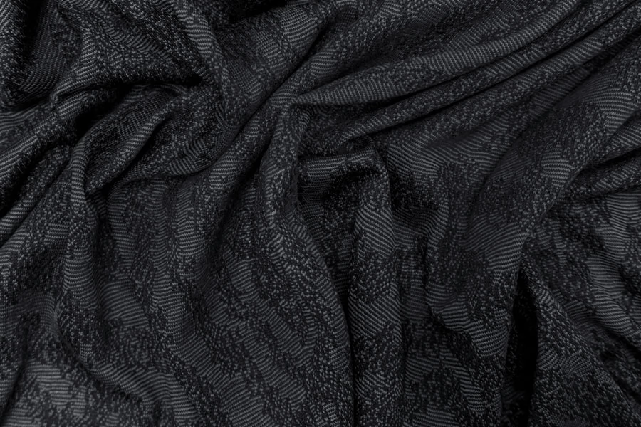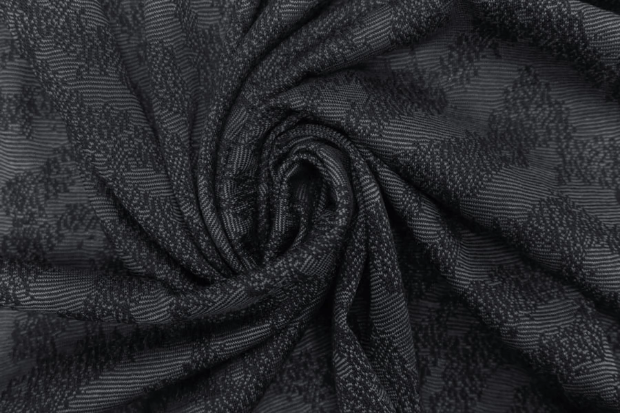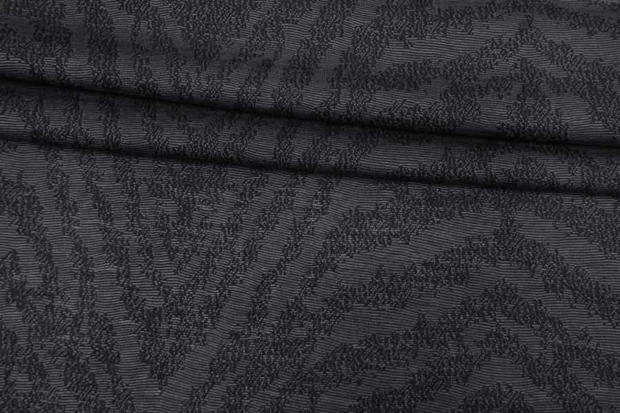 Тонкий трикотаж из шерсти с хлопоком, узор фактурный волнообразный из переплетения нитей черного и серого цвета. По плетению кулирная гладь. Мягкий, приятный, немного чувствуется фактура. Не колется. Трикотаж просвечивает, пластичный, эластичный. Подойдет для пошива майки, футболки, топа, тонкой водолазки. Уход деликатный.