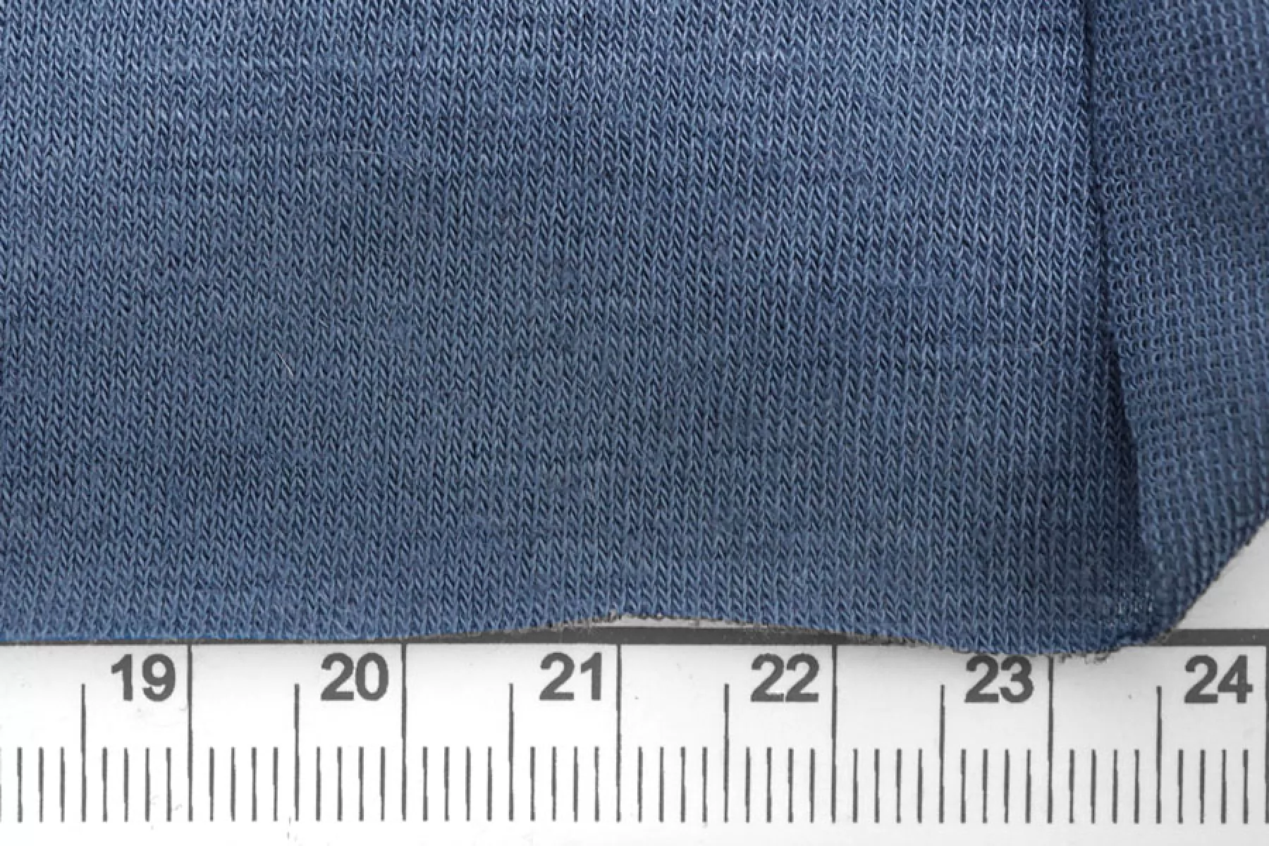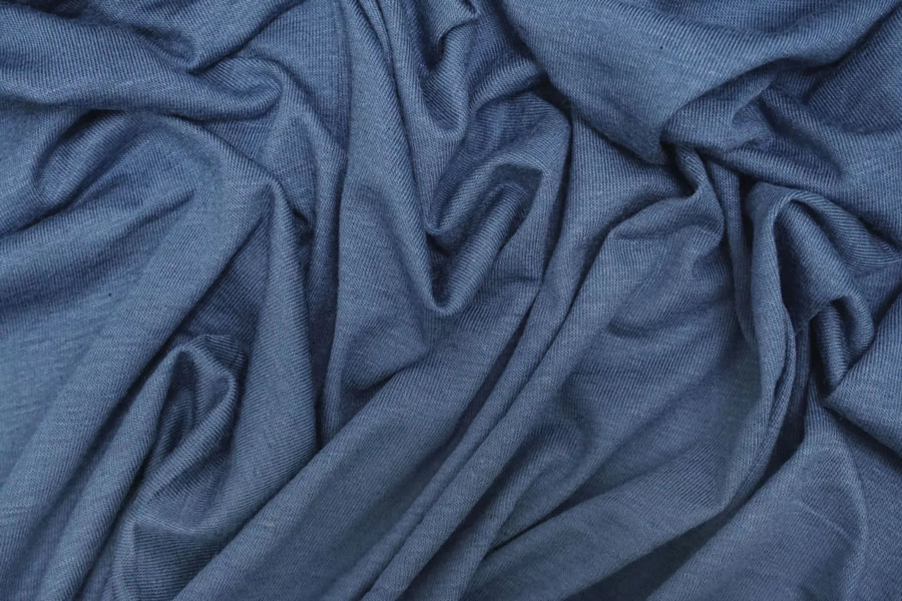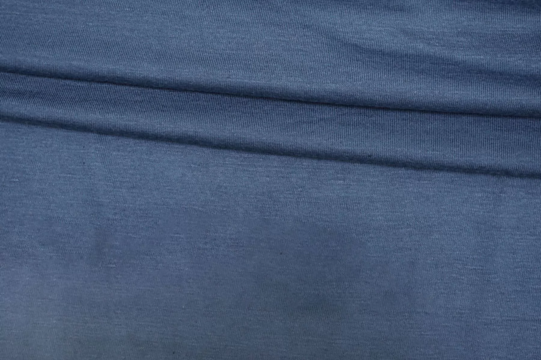 Прекрасный трикотаж - кулирная гладь, из тенселя с добавлением кашемира, в красивом, неярком сине-голубом оттенке. Тактильно очень приятный, гладкий, шерсть не ощущается. Тонкий, просвечивает (при растяжении становится полупрозрачным). Хорошо тянется. Пластичный, форму не держит. Очень комфортный к телу. Можно использовать для пошива маек, футболок, платьев, туник. Уход деликатный.