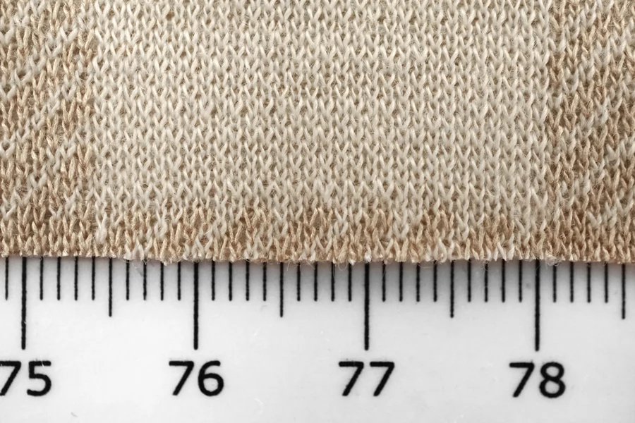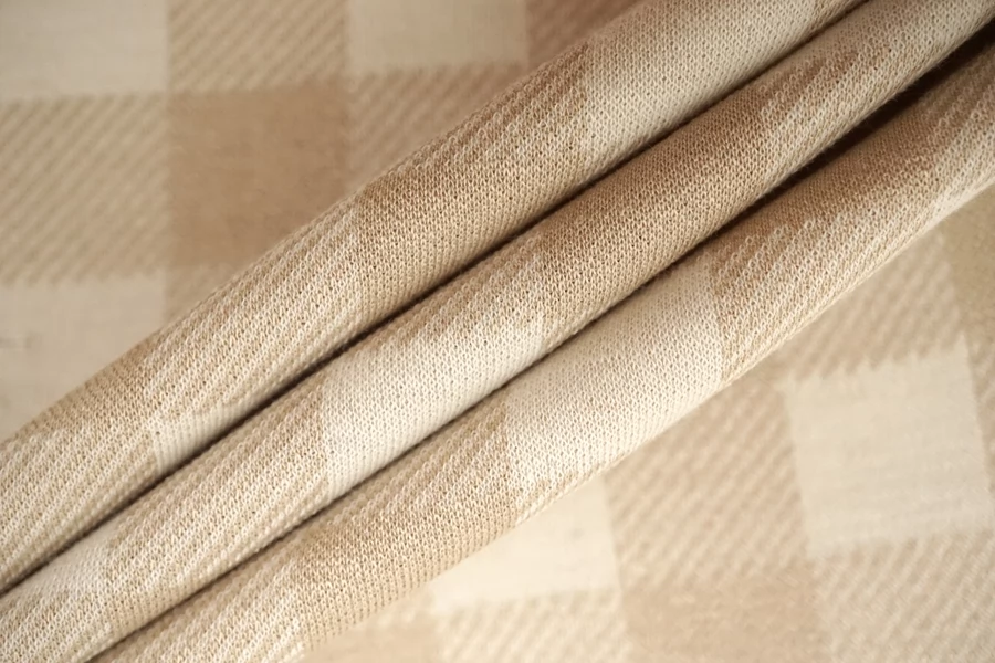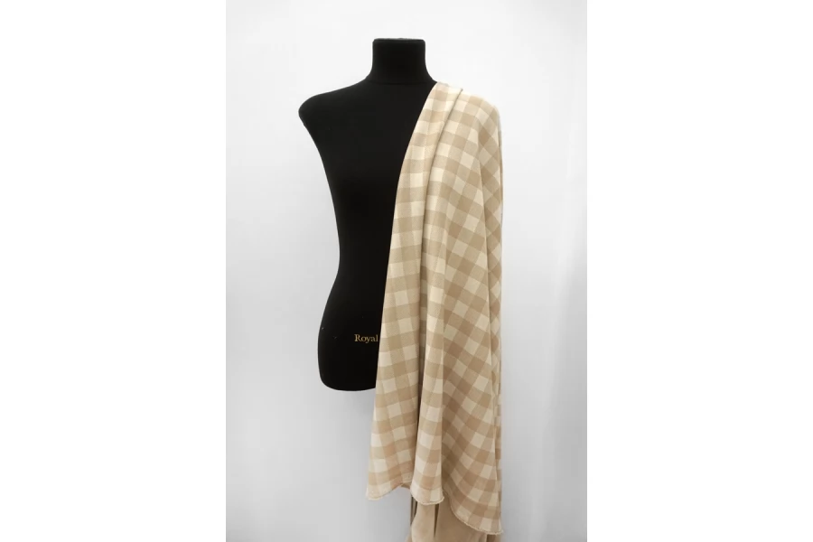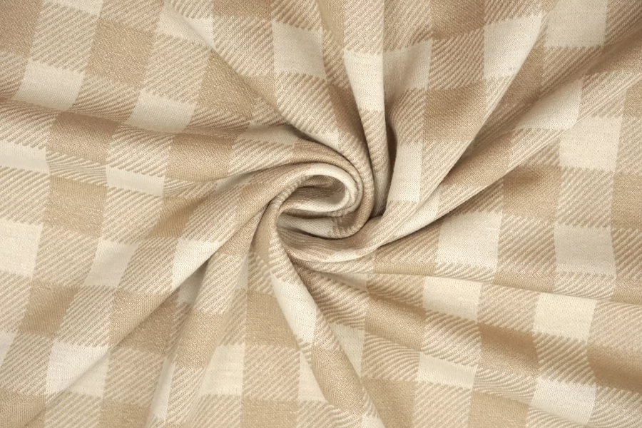 Итальянский хлопковый трикотаж с добавлением полиэстера в клетку бежевого оттенка. Пластичный, эластичный, легкий, тактильно приятный, тянется. Подойдет для пошива майки, футболки, топа, туники, платья, юбки, домашней одежды.