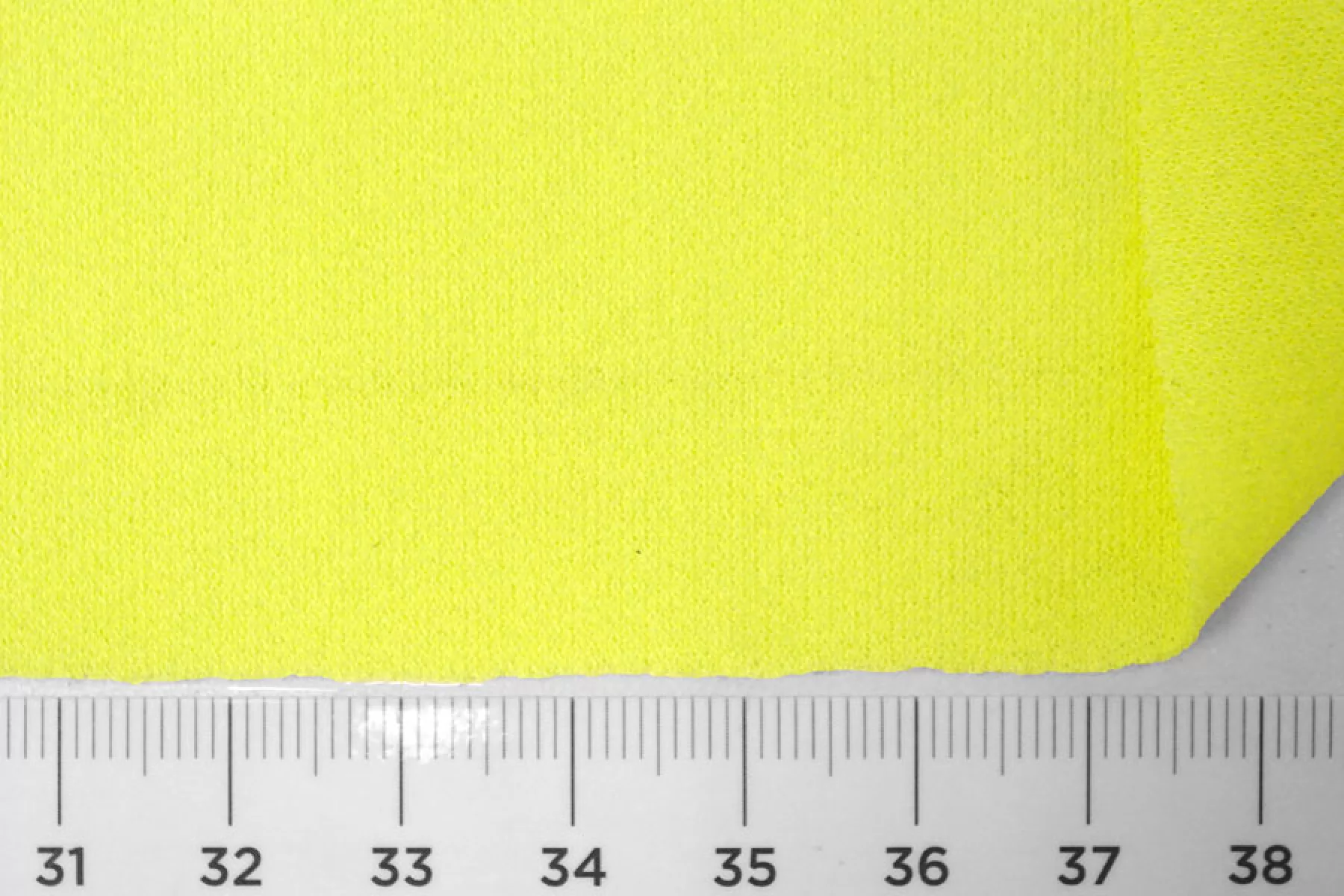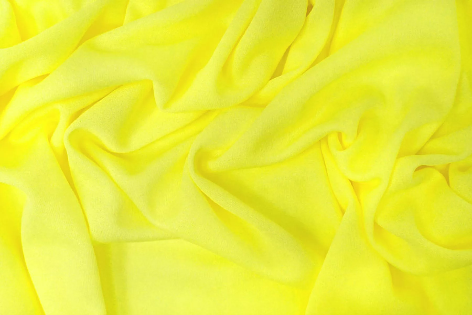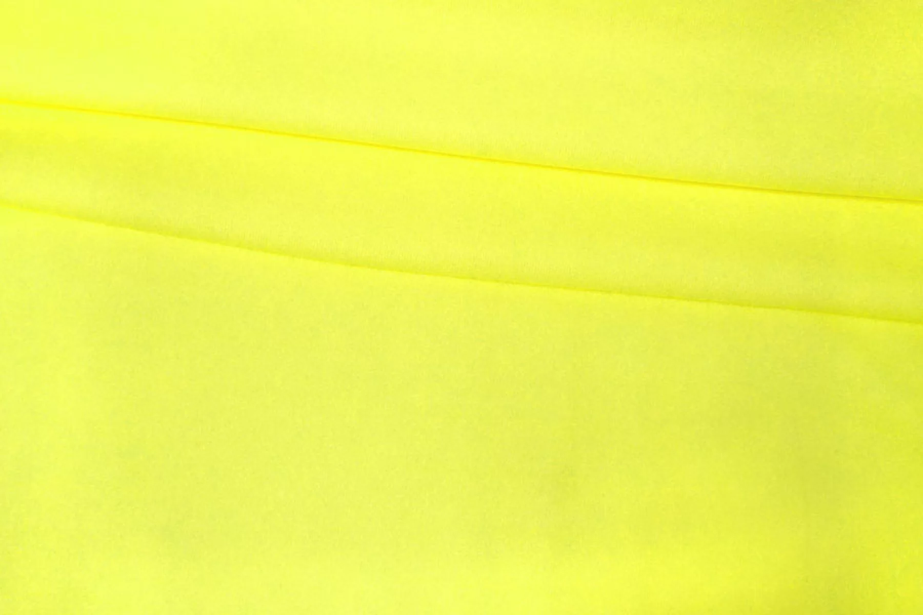 Прекрасный холодный трикотаж от бренда Tom Ford в неоновом желтом цвете (яркий светлый желтый с зеленцой). Тонкий, холодный, шероховатый тактильно, струящийся. Просвечивает, не мнется, эластичный. Подойдет для пошива платья (учтите что материал тонкий), юбки, футболки, майки, можно использовать в качестве подкладочного материала (сшить нижнее платье-комбинацию под прозрачные материалы).