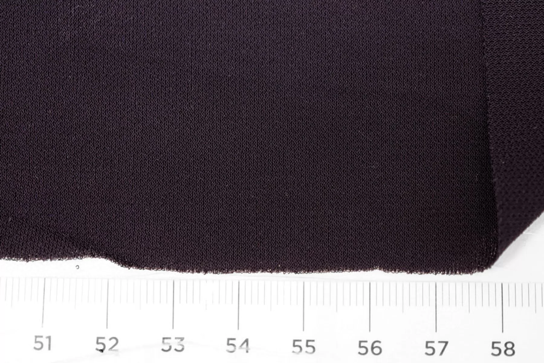 Холодный вискозный трикотаж от бренда Valentino в очень темном фиолетовом цвете (ближе к темному баклажанному). Тонкий. Холодный, шероховатый тактильно, струящийся. Эластичный, просвечивает, не мнется. Подойдет для пошива платья (нужна подкладка или многослойность), юбки, футболки, майки, можно использовать в качестве подкладочного материала.