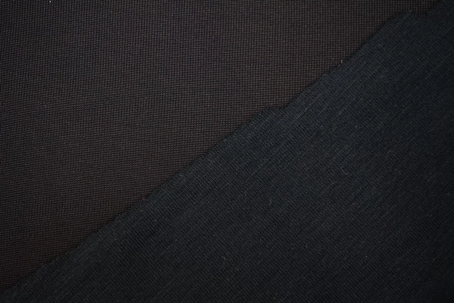 Интересный вискозный трикотаж в черном цвете. Лицевая сторона-холодный трикотаж из вискозы, гладкий, скользкий, с легким лоском. Изнаночная сторона это очень мягкий хлопковый трикотаж, так же в черном цвете. Тактильно обе стороны очень приятные. Материал тянется, просвечивает немного силуэт при сильном растяжении. Подойдет для пошива демисезонного свитшота, платья, юбки, брюк.