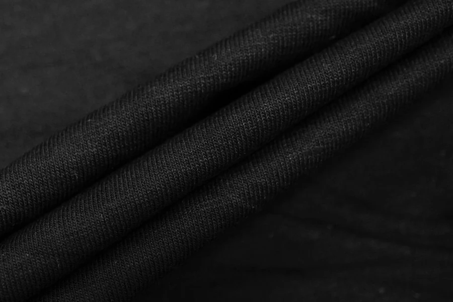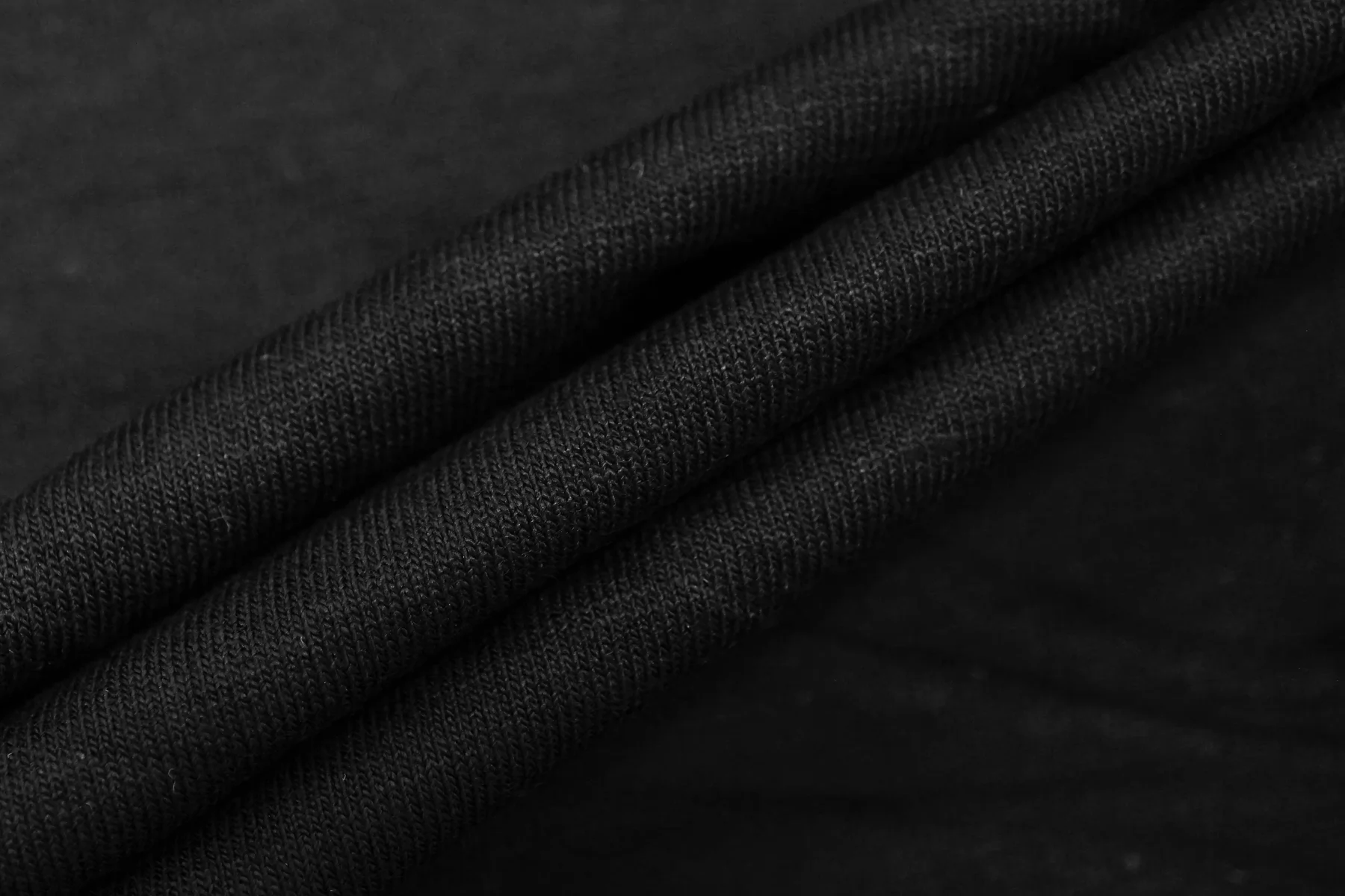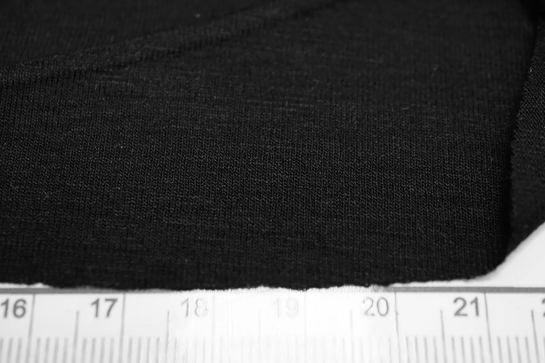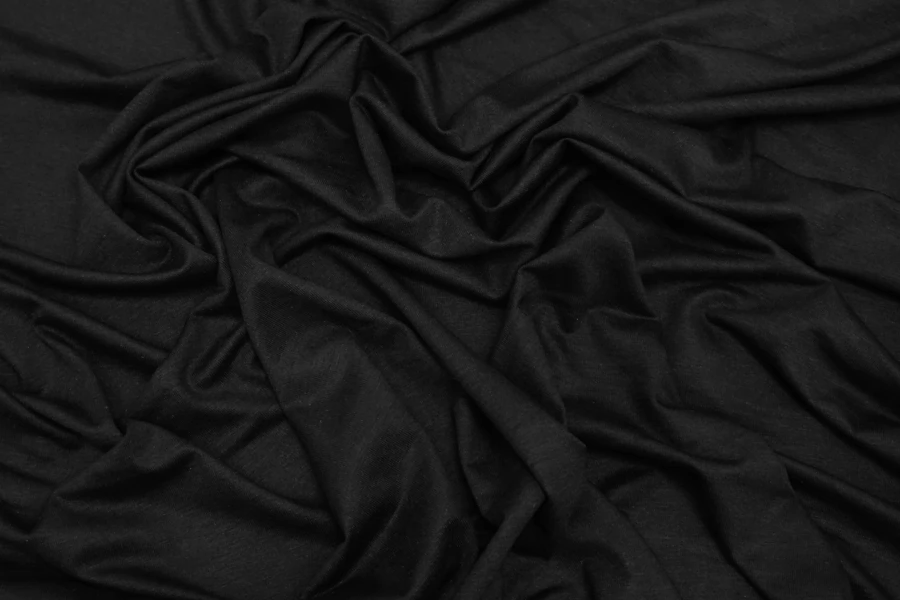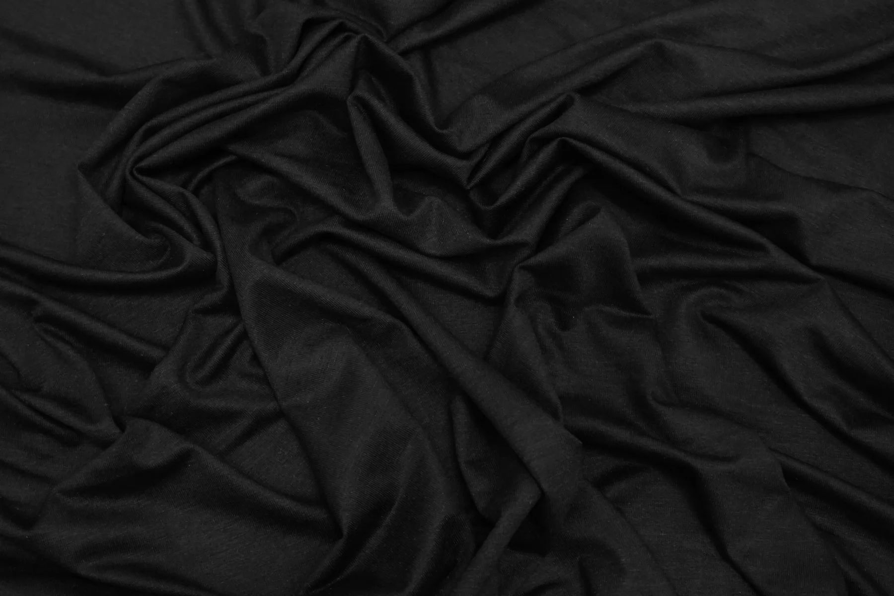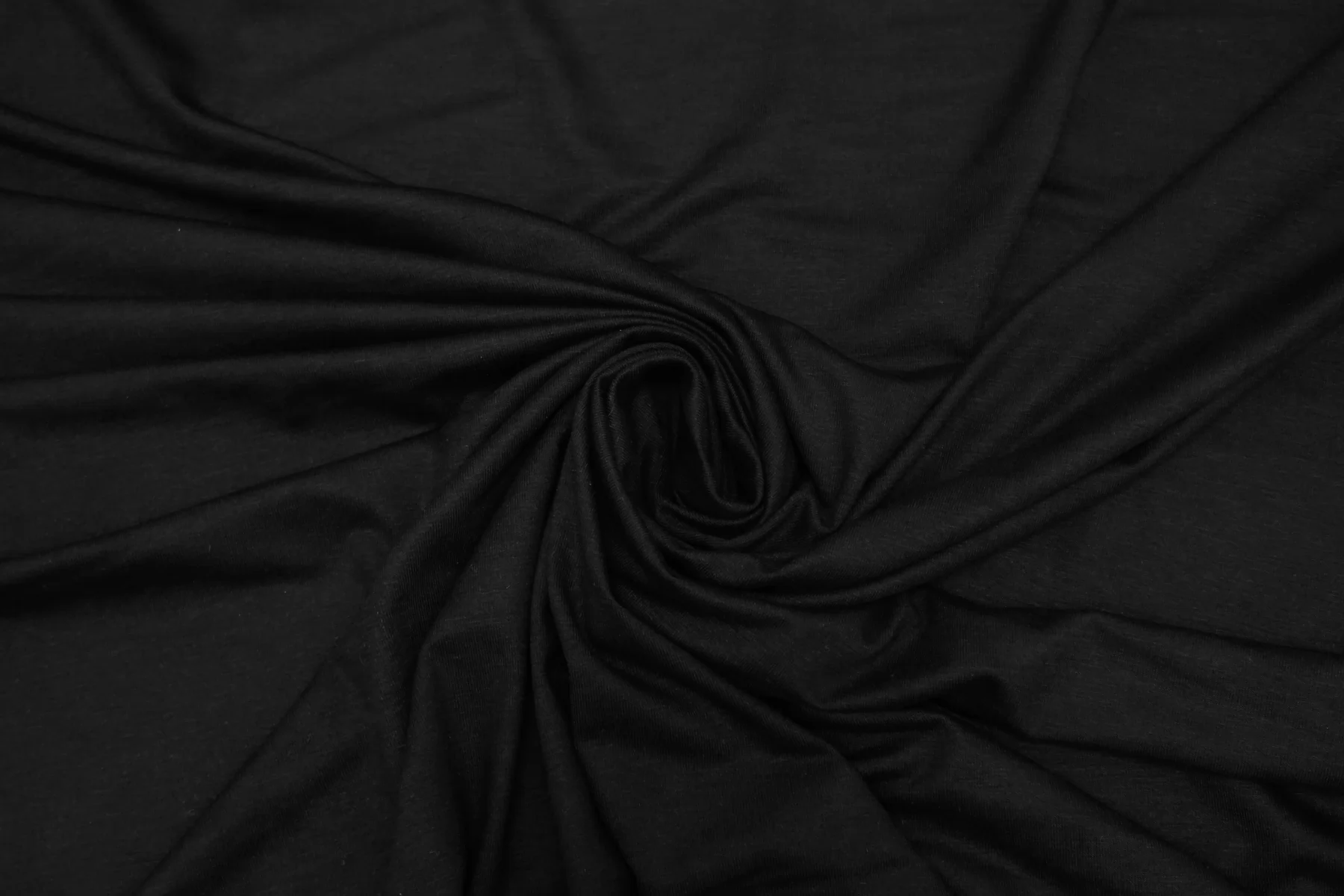 Шикарный итальянский трикотаж из вискозы в чёрном цвете. По плетению это кулирная гладь. Материал тактильно мягкий и нежный, струится. Немного просвечивает в один слой. Слегка мнется. Хорошо тянется. Отличный вариант на домашнюю одежду, майки, топы, пижамы.